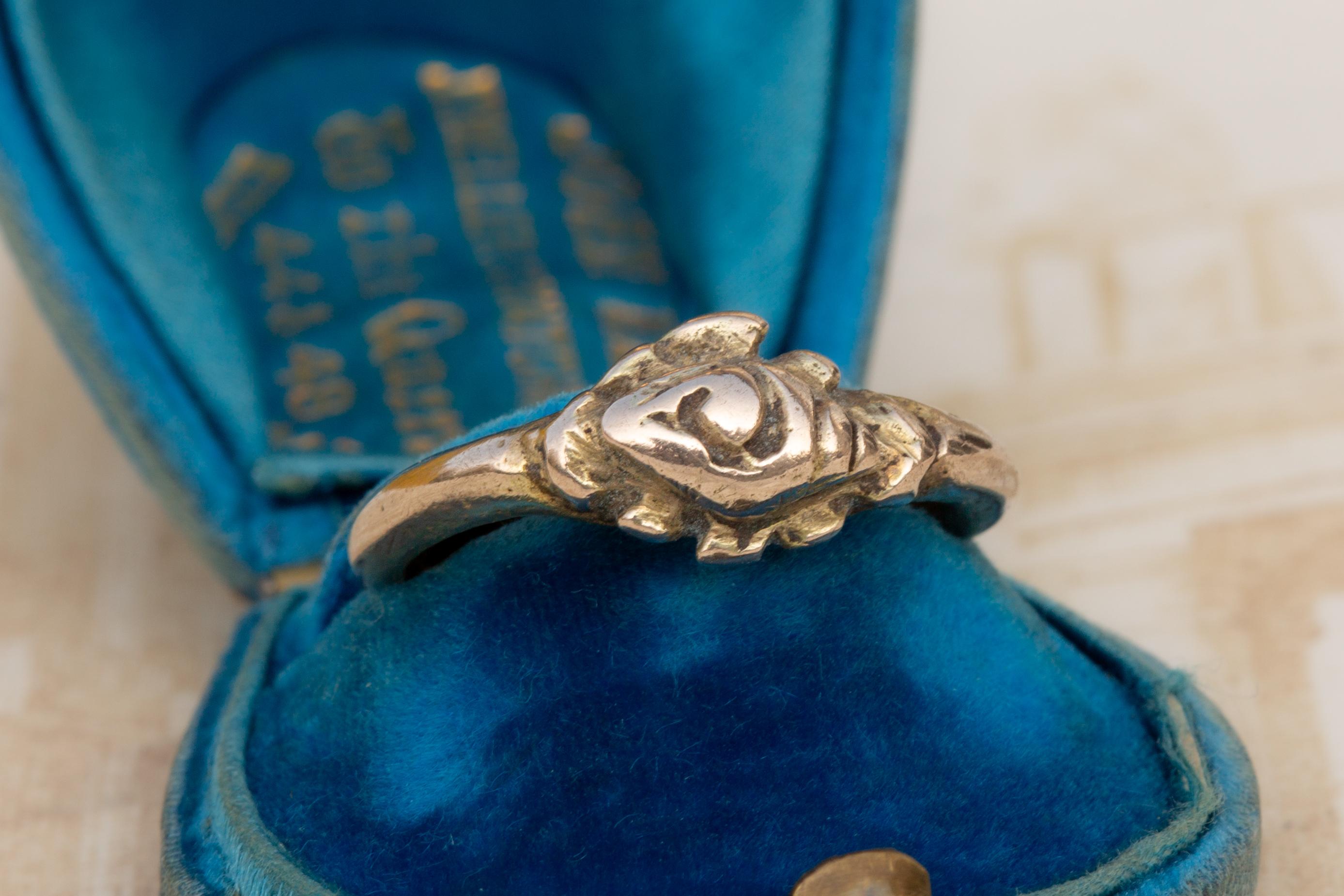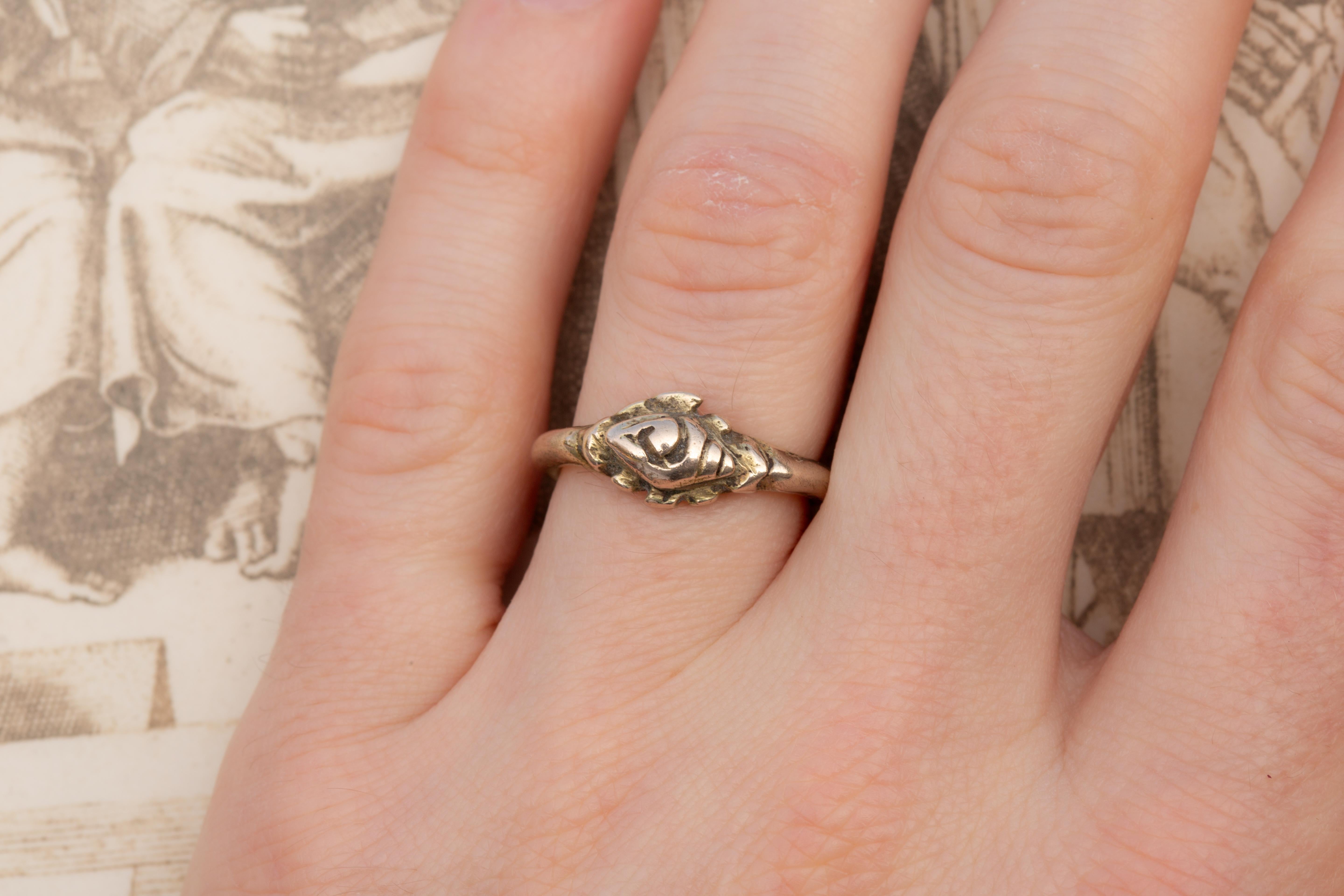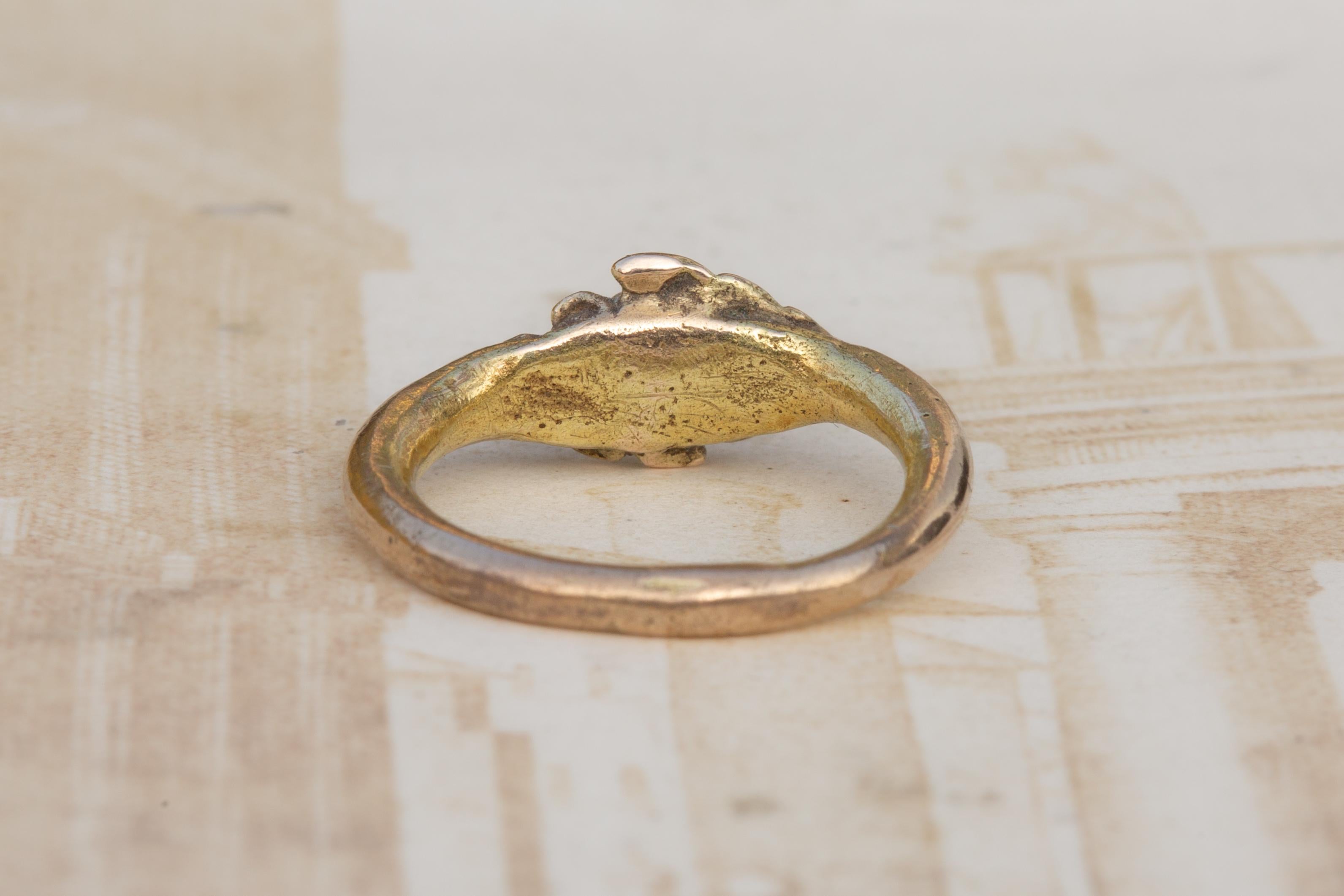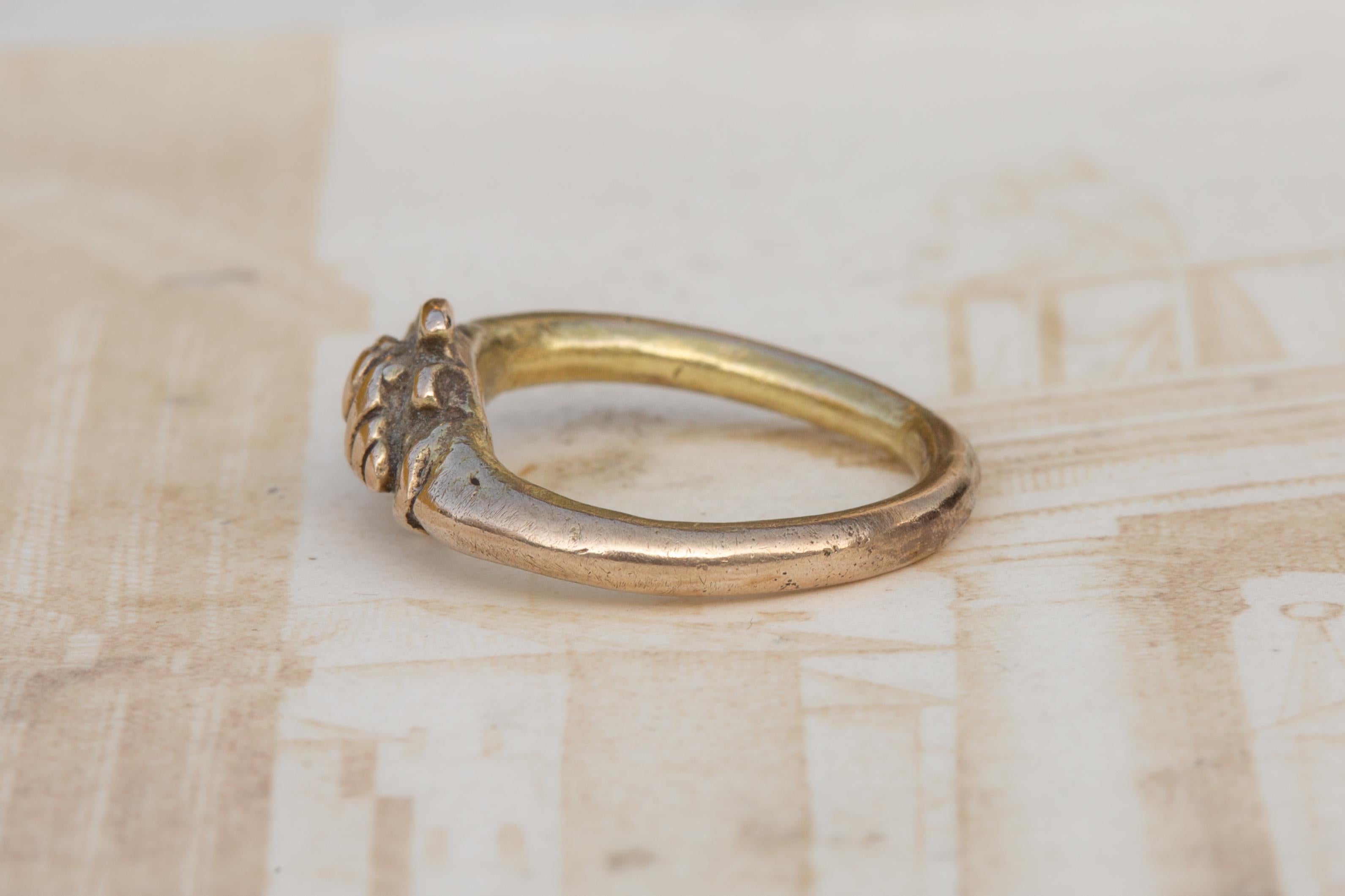 The ring is crafted in silver with a gold gilt surface, now softly worn in places, revealing the underlying silver and lending the piece a desirable archaeological patina.