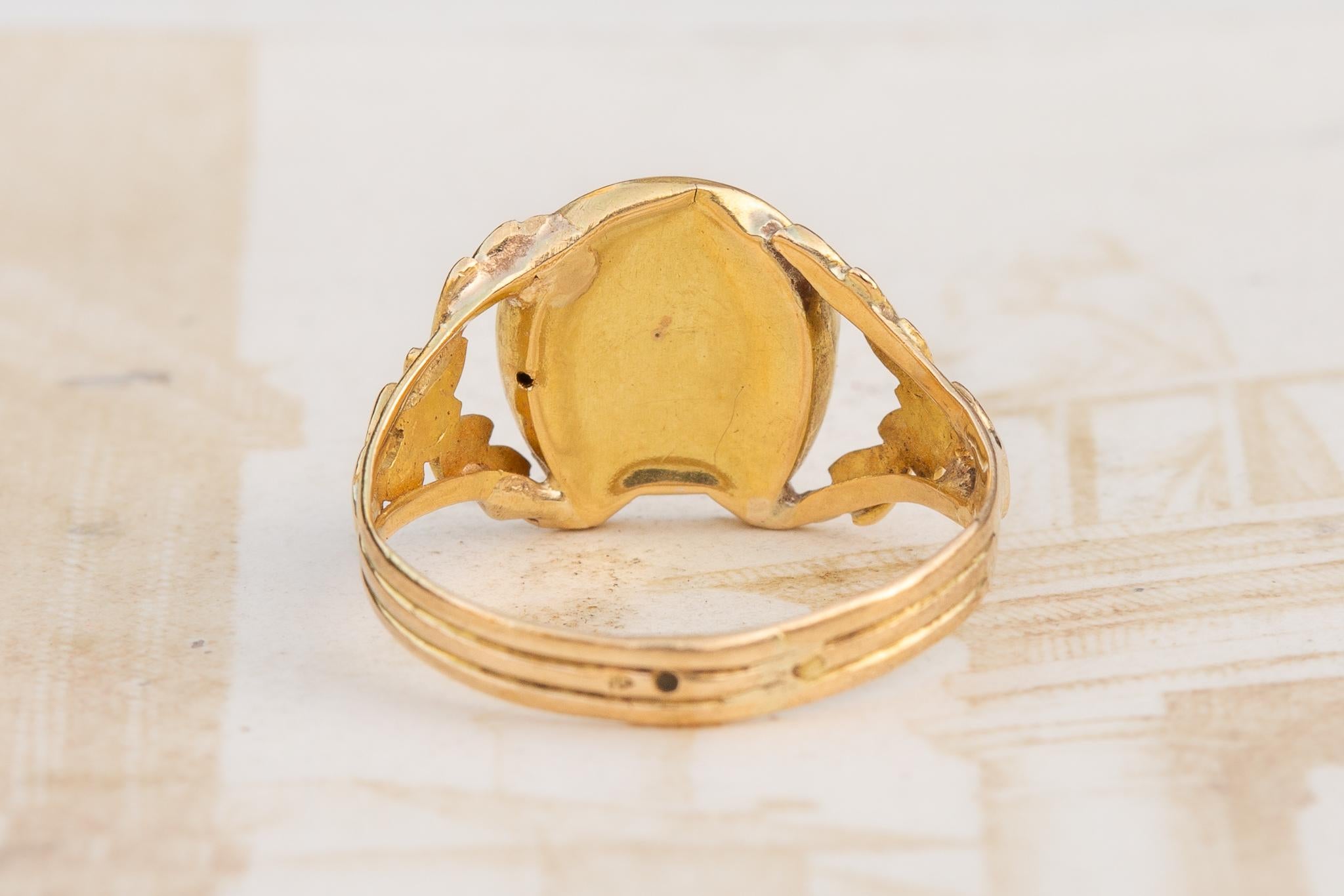 A rare and elegant early French talismanic ring, valued for its age, symbolism, and refined foliate goldwork.
