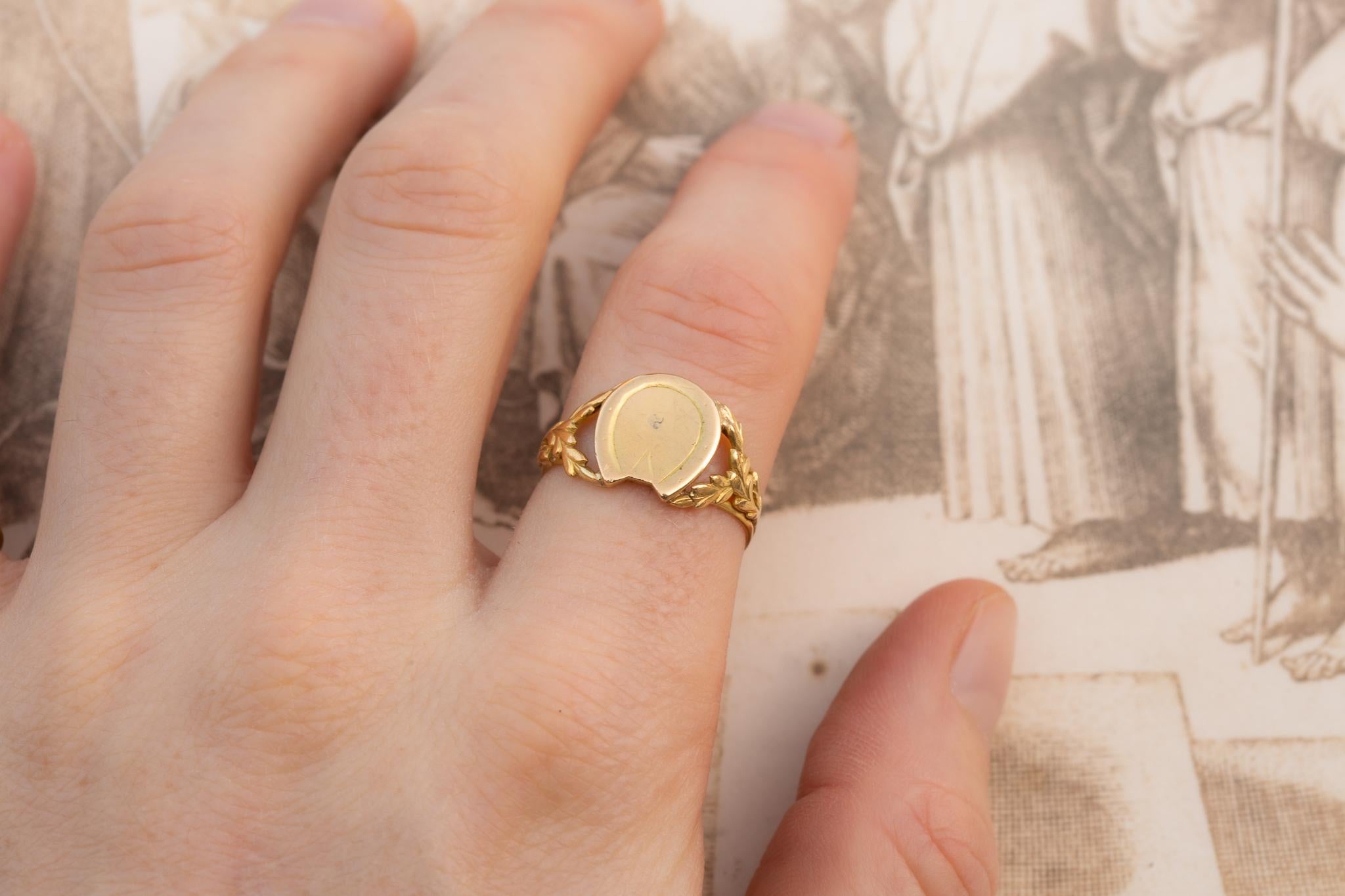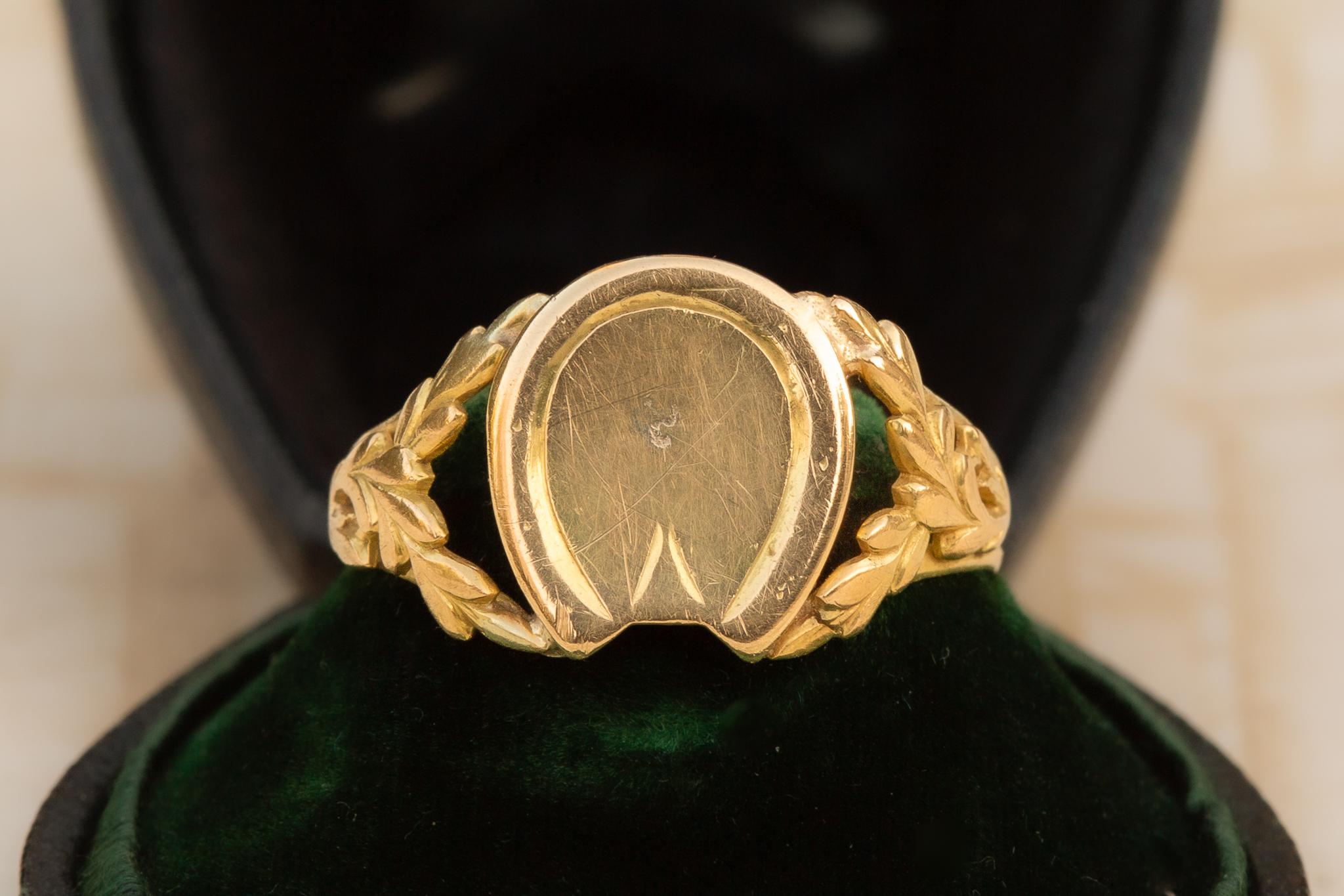 A mid 19th-century French horseshoe ring, made in Paris circa 1840 and crafted in 18K gold.The ring is centred with a raised horseshoe-form bezel, flanked by finely chased foliate garland shoulders that taper elegantly into a slender shank. The modelling is crisp and restrained, characteristic of Parisian goldwork of the early Victorian period.The horseshoe motif has a long-established place in European jewellery as a symbol of protection and good fortune. In early 19th-century France, such motifs were worn deliberately as personal talismans rather than decorative novelties, often associated with safe travel, prosperity, and warding against misfortune. Rings of this date with horseshoe bezels are notably scarcer than later Victorian examples.The ring bears the French eagle’s head hallmark for 18K gold, along with a maker’s mark consistent with Parisian manufacture.Measurements and condition:The horseshoe bezel measures 12 × 10mm; the band measures 3mm at the back. Ring size UK R; US 8.5. Weight 2.91 grams. Very good antique condition, with a small dent to the underside of the bezel not visible when worn, and light surface wear consistent with age.A rare and elegant early French talismanic ring, valued for its age, symbolism, and refined foliate goldwork.