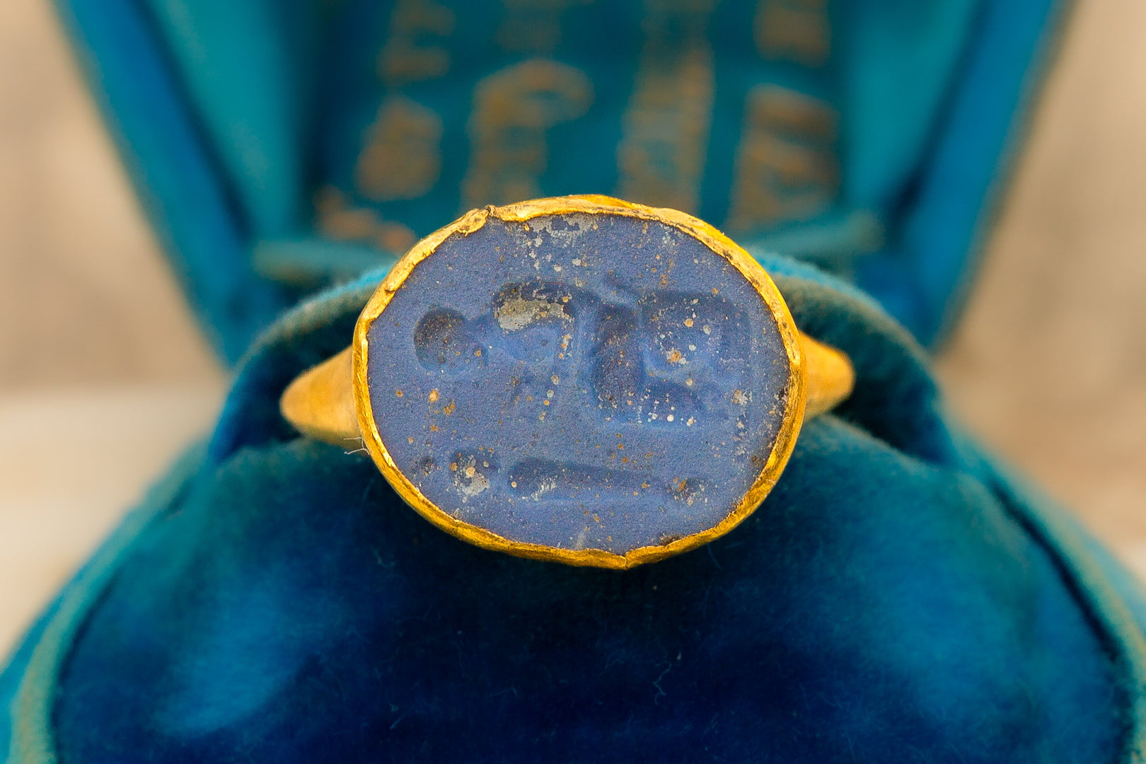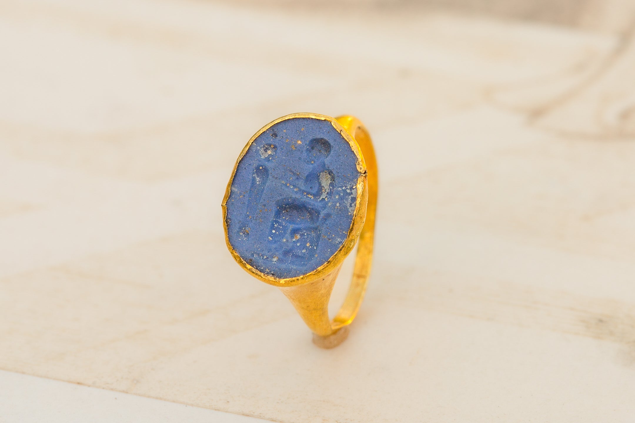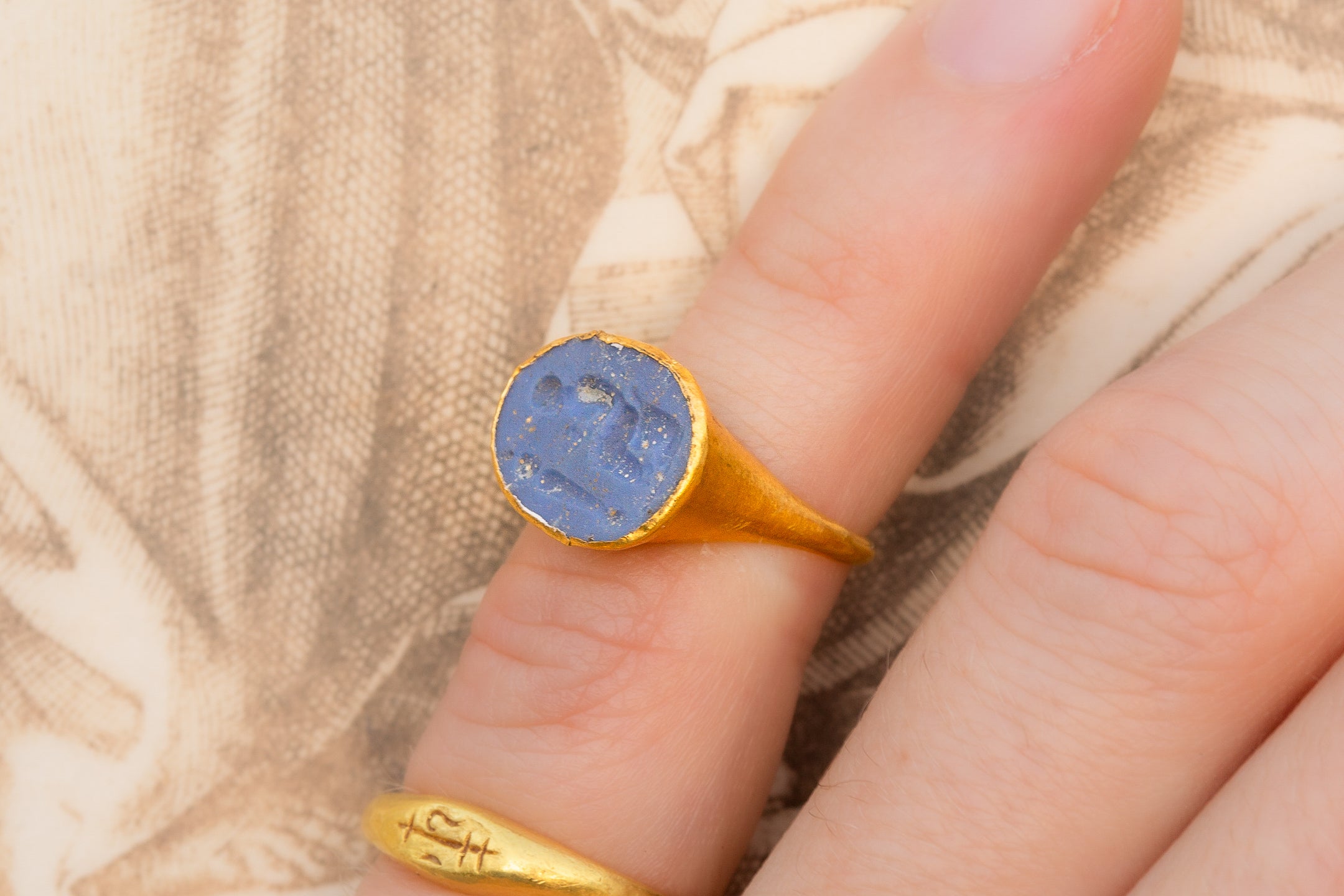• An exceptional Roman gold ring dating to the early Imperial period, circa mid-1st century AD, set with a finely moulded blue vitreous paste intaglio depicting a seated philosopher studying a herm on a plinth.