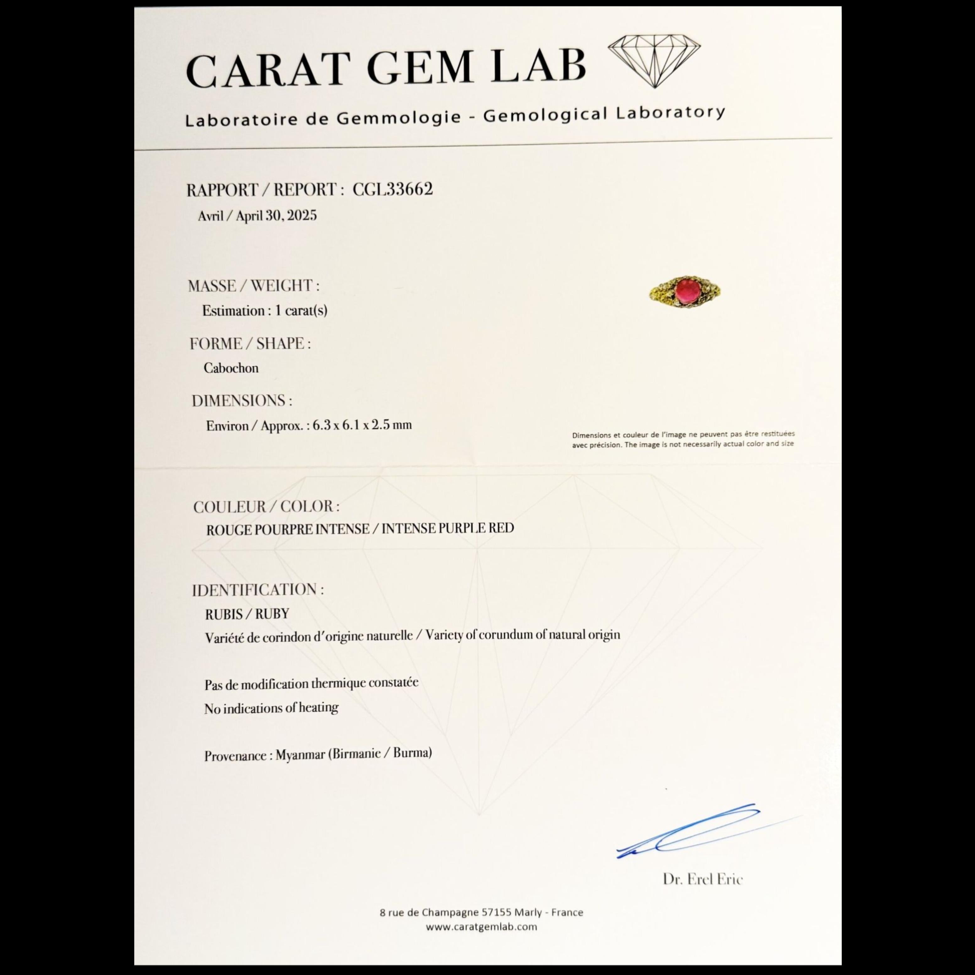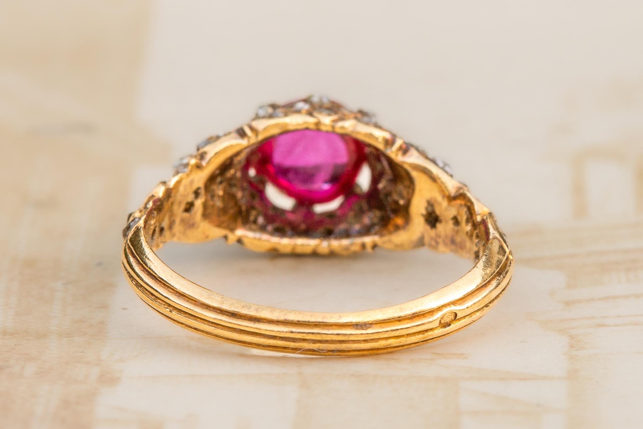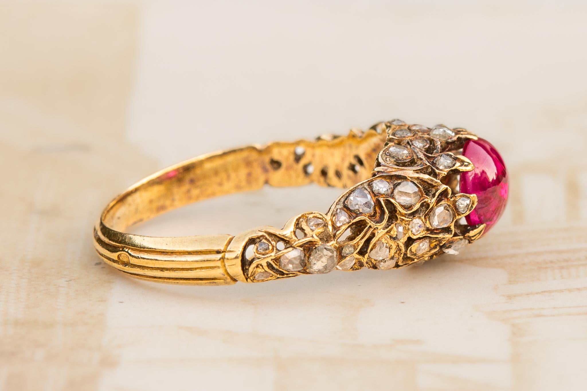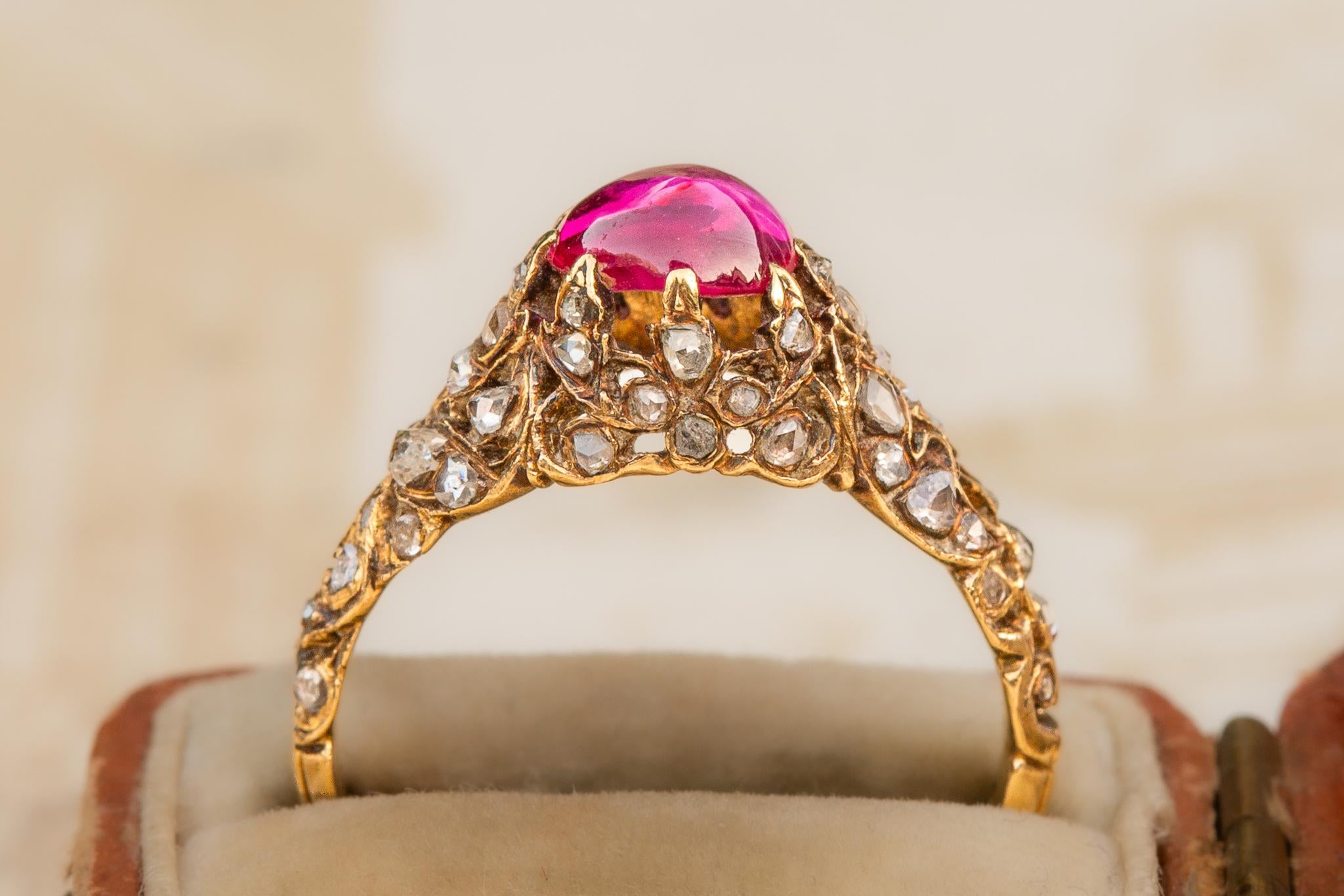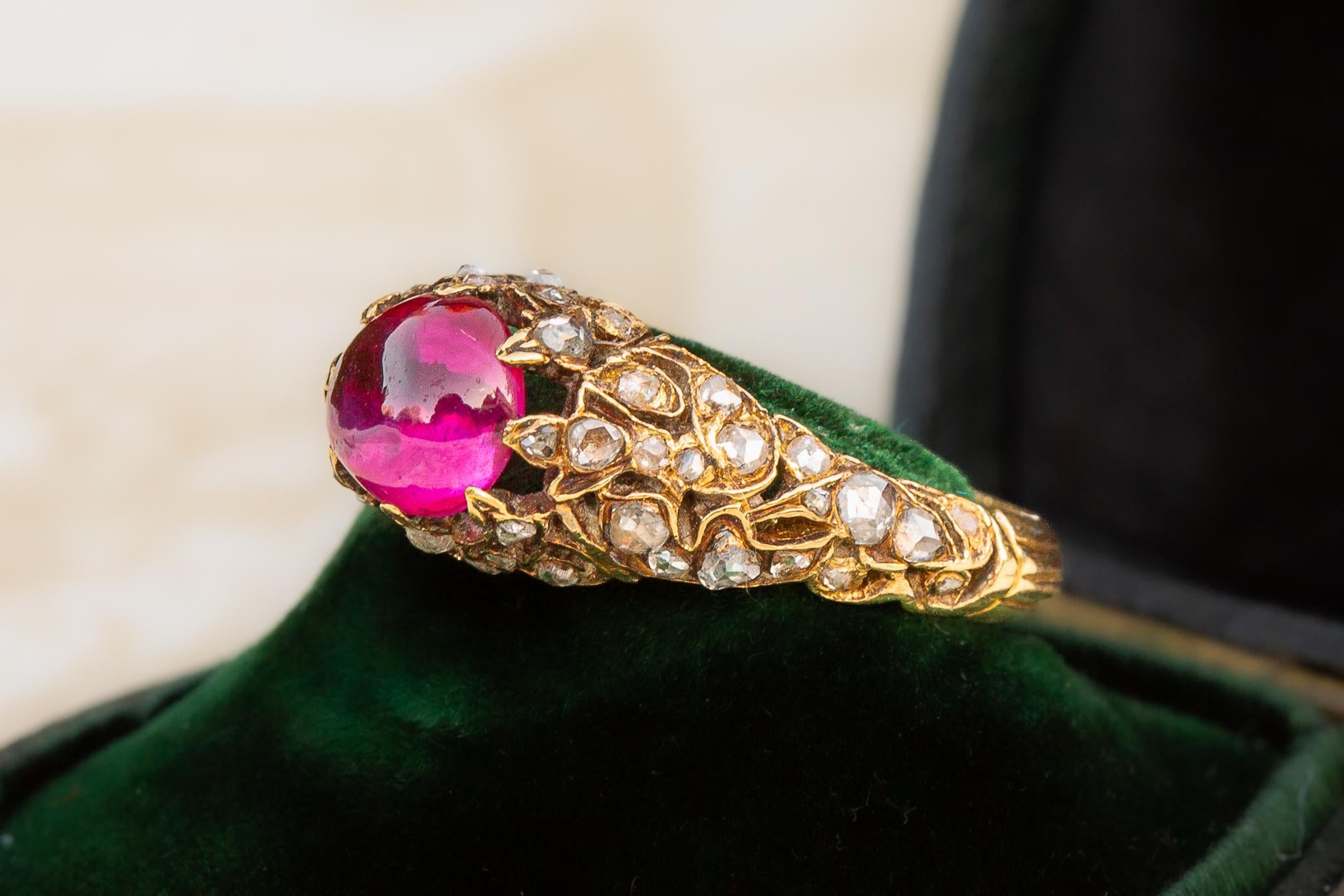 A spectacular and highly refined 19th-century diamond ring, centred with a natural, unheated Burmese ruby cabochon weighing approximately 1.2 carats. Dating to circa 1870, this ring belongs to the Second Empire period of France and was most likely made in France, though the mount also closely relates to rare openwork diamond rings produced in the Ottoman Empire during the same period.The setting is extraordinarily intricate; an openwork floral mount of remarkable delicacy, entirely hand-built and set throughout with around fifty rose cut diamonds. This type of pierced, diamond-set construction is exceptionally scarce and seldom encountered today. The diamonds taper gracefully into a fluted gold shank, a thoughtful design feature that ensures comfort on the finger despite the complexity and visual drama of the mount. When worn, the ring has a striking architectural presence; light passes through the openwork gold and diamonds, creating a vivid, almost sculptural effect. It is, quite simply, a showstopper.At the centre sits a richly coloured ruby cabochon of superb quality. Accompanied by a laboratory report confirming it as a natural, untreated Burma ruby, the stone displays a vibrant, saturated hue with very few inclusions. Its gently irregular, domed form is entirely consistent with 19th-century Burmese rubies, which were typically sent to India for cutting. Prior to the 20th century, Indian gem cutters prioritised weight retention over symmetry, resulting in cabochons that preserve the natural character of the stone rather than striving for perfect uniformity.The ring is stamped with a French owl control mark, indicating a fineness of 18K gold. Remarkably, all of the rose cut diamonds remain intact; there are no losses whatsoever, an exceptional and rare survival for a ring of this age and intricacy.The ring weighs 3.65g and measures UK size N 1/2; US size 7. The ruby cabochon measures approximately 6 × 6 × 3mm. Condition is excellent overall, with only light, age-appropriate wear and no losses to the diamond setting.