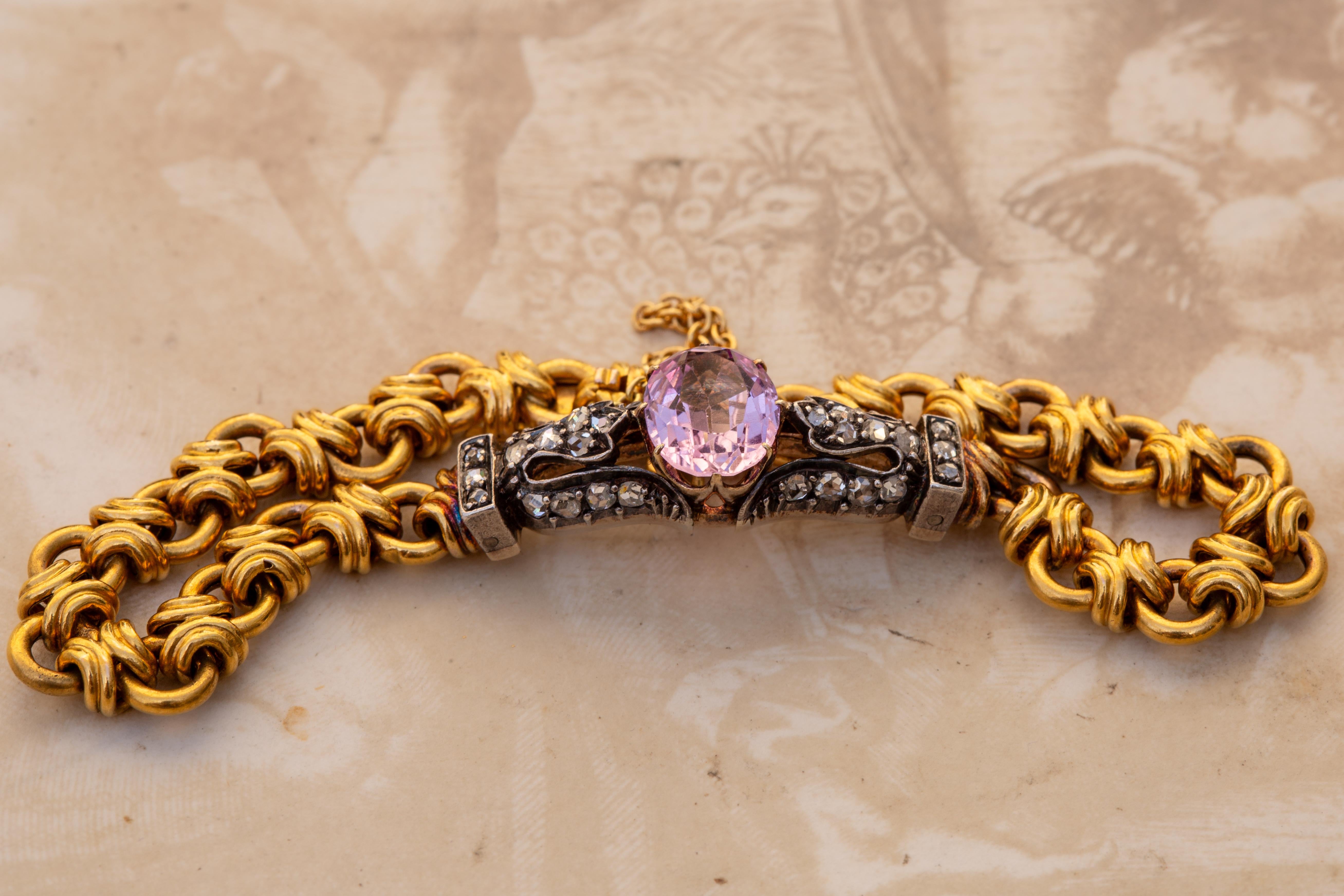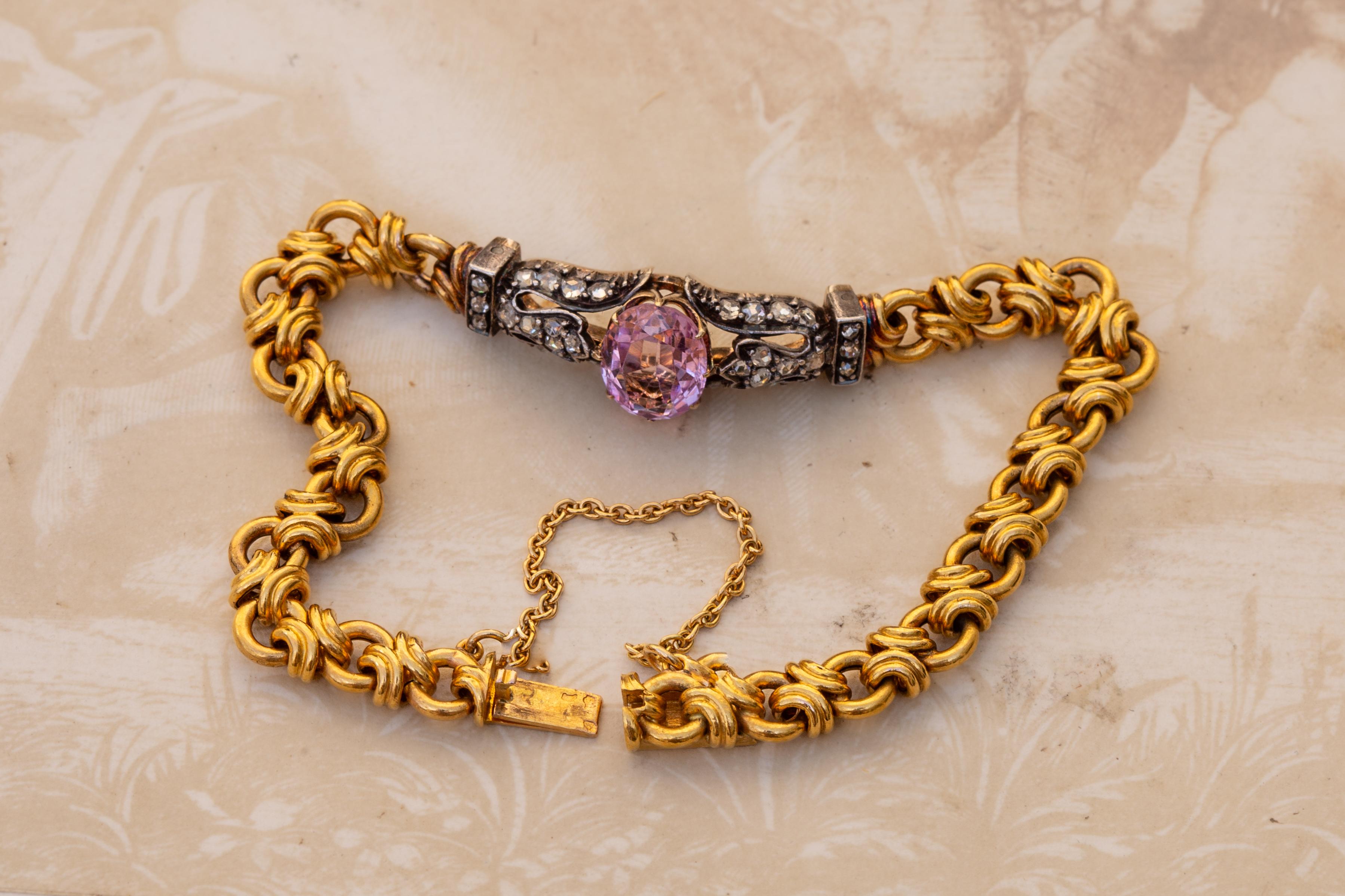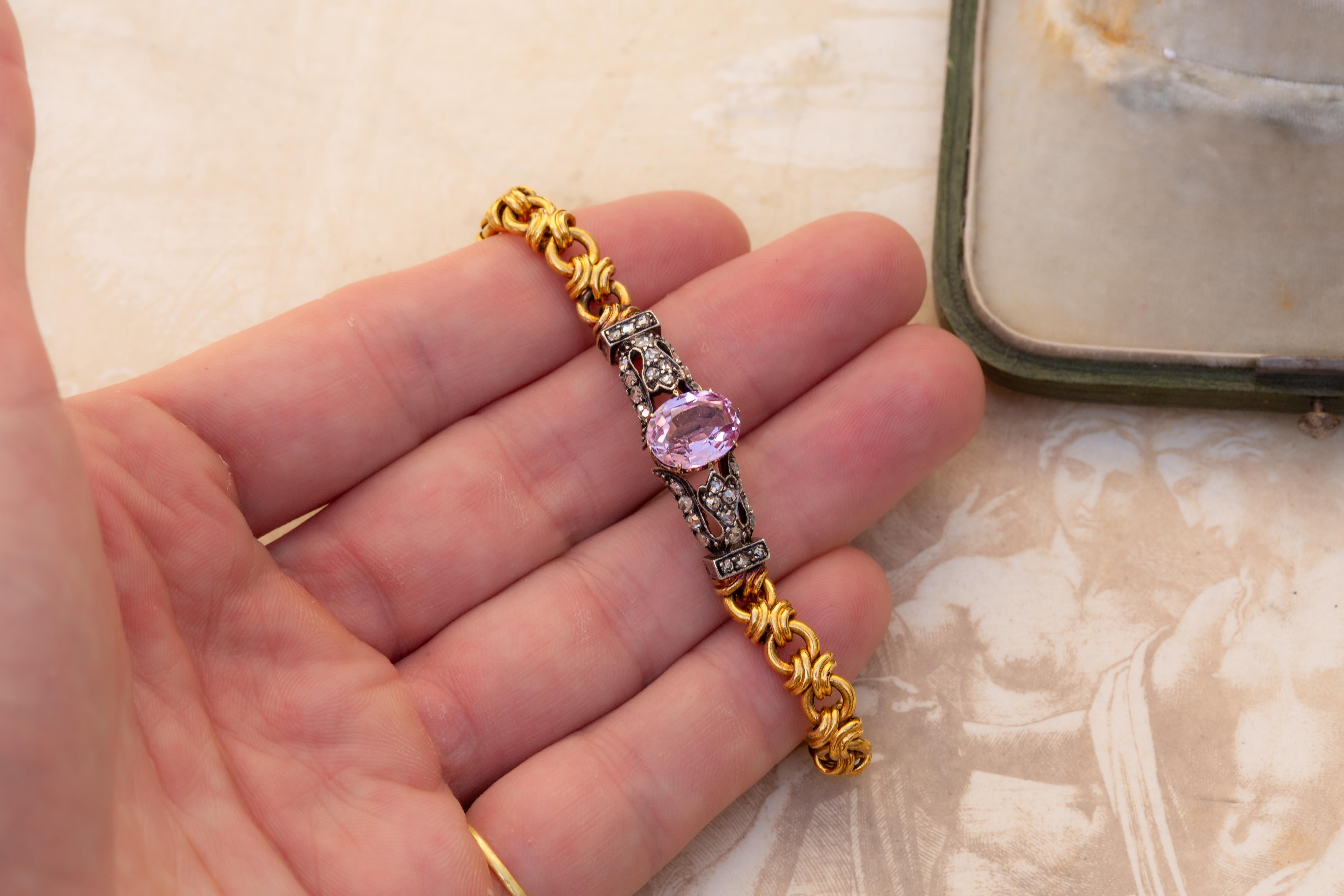 A highly refined French bracelet from the late 19th century, crafted in 18K gold and set with a delicate pink topaz and rose-cut diamonds in silver-topped gold settings. Dating to around 1880, this bracelet exemplifies the elegance of the Belle Époque era while offering unusual design flourishes that set it apart.The centrepiece features an oval-cut 1.84ct pink topaz of exceptional clarity and soft lilac hue, measuring approximately 10 x 7 x 4 mm. It is delicately claw-set in a manner that allows light to circulate freely beneath the stone, creating a subtle floating effect. Surrounding the topaz are ornate silver collet settings, each holding a rose-cut diamond. The overall motif resembles a stylised fleur-de-lys, adding a distinctly French character to the design.The bracelet itself comprises an unusual and beautifully constructed series of interlinked gold loops, reminiscent of rope and buoy motifs, possibly alluding to maritime themes. Each component is articulated and weighty, contributing to the piece’s excellent drape and wearability.The total weight is a substantial 14.64 grams, and the bracelet measures 18 cm in length. The box clasp is fully functional and bears French control marks for 18K gold and silver: the eagle's head (for 18K gold, in use since 1838) as well as the rhinoceros head hallmark. All stones are set in open-backed settings, allowing for light reflection and ease of cleaning.Despite its age, this bracelet remains in exceptional condition. It would have likely been a special commission, given the quality of workmanship and the rarity of pink topaz in jewellery of the period.Condition:Exceptional antique condition. Stones secure, clasp firm, minimal wear.