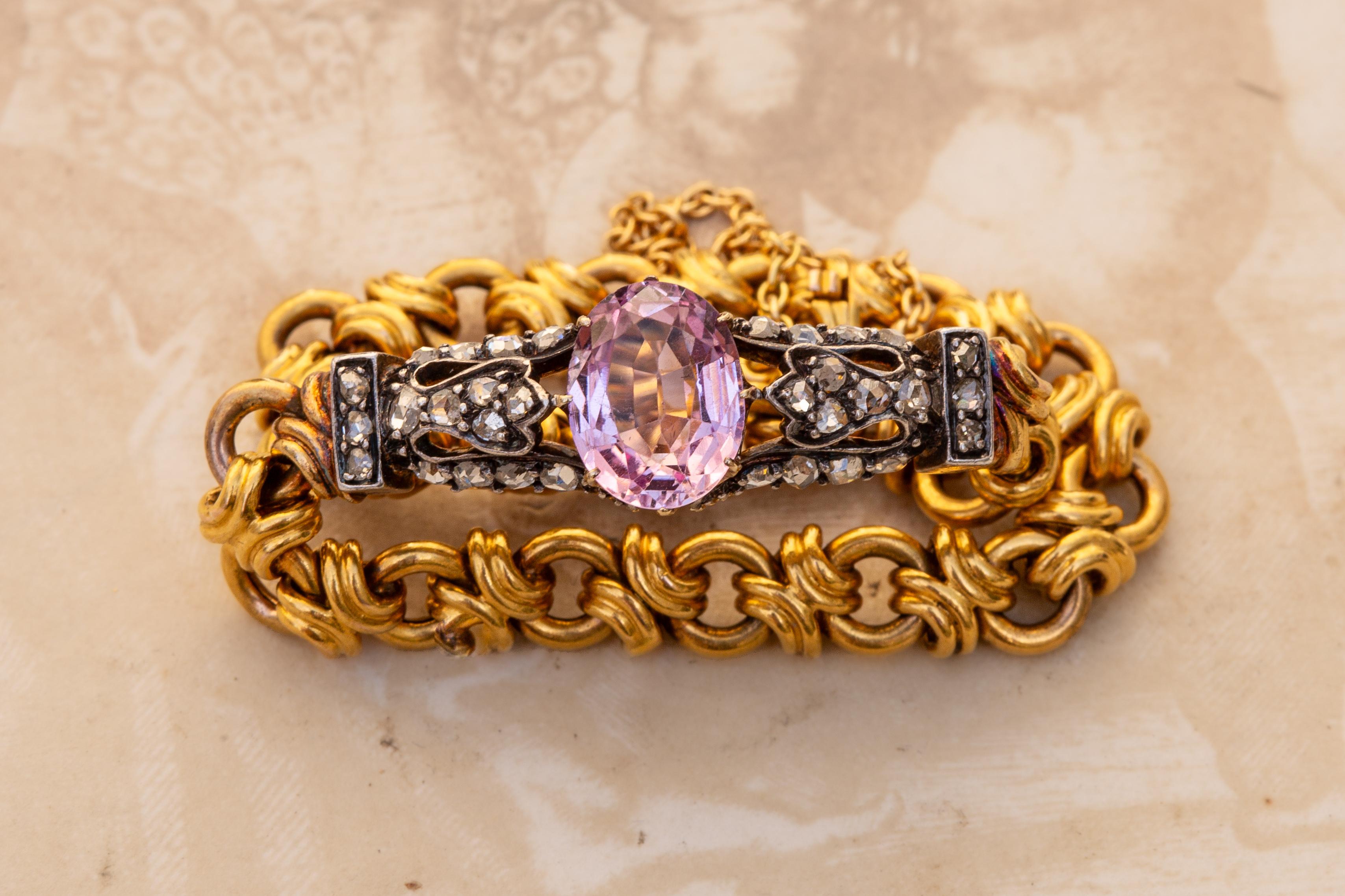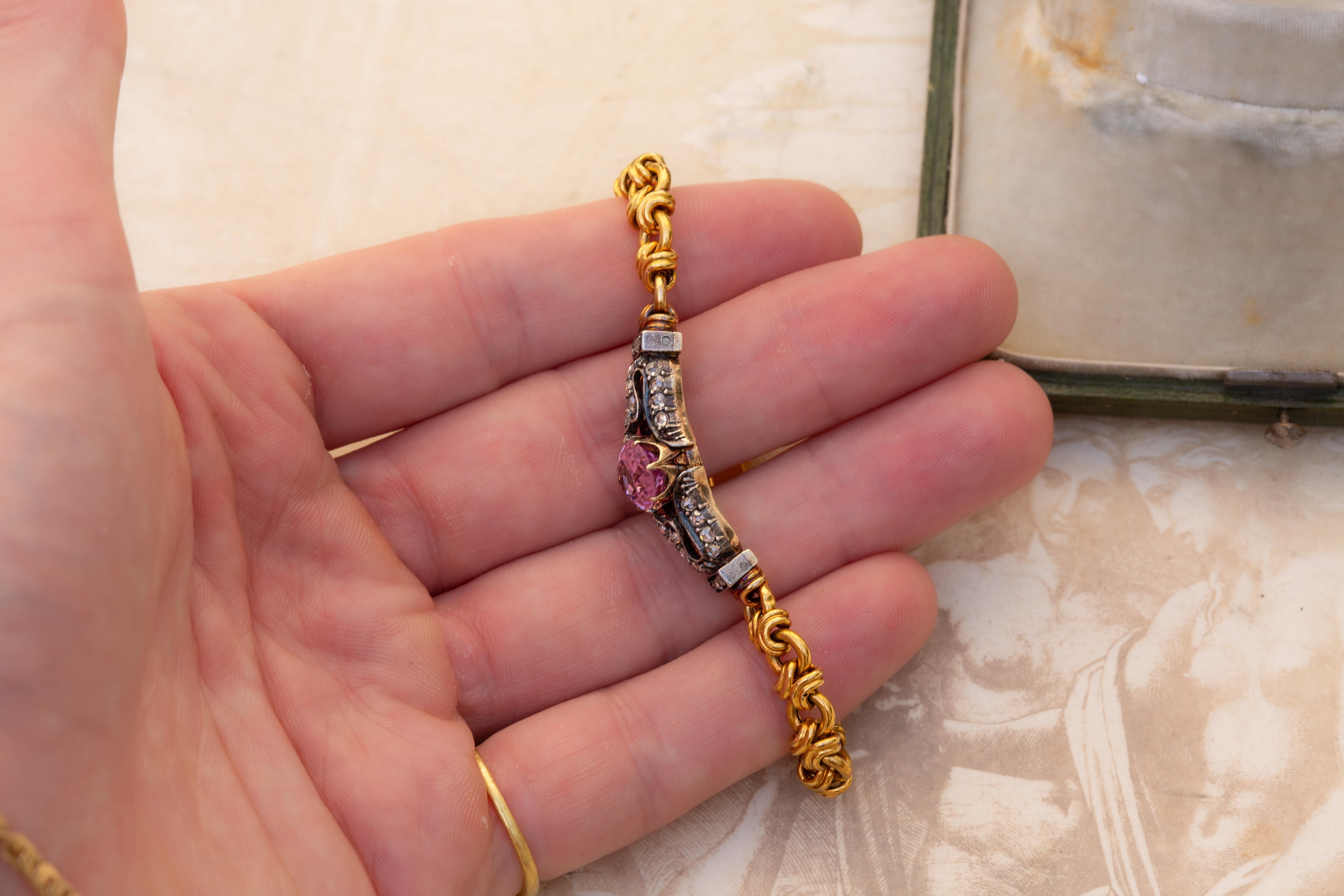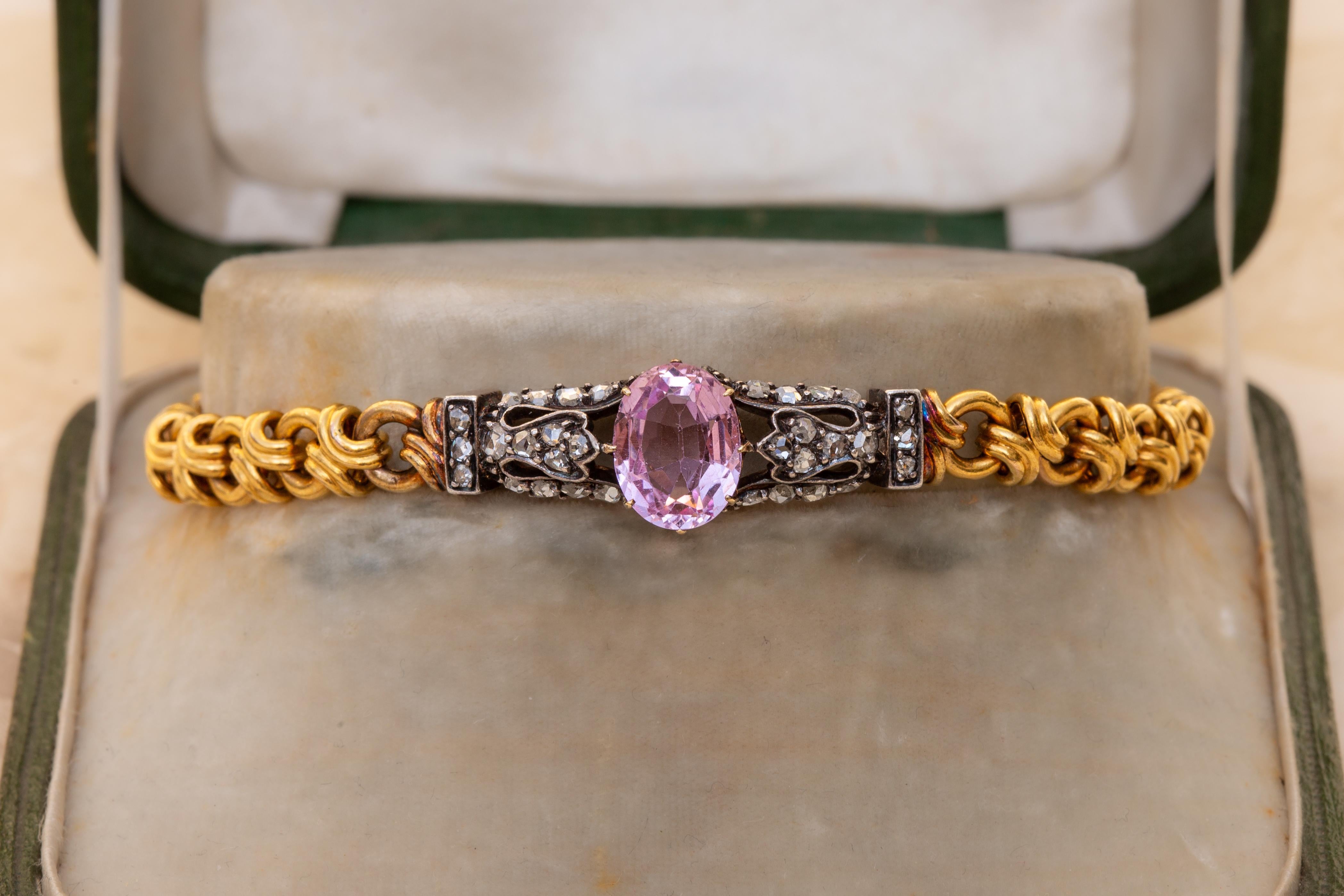 A highly refined French bracelet from the late 19th century, crafted in 18K gold and set with a delicate pink topaz and rose-cut diamonds in silver-topped gold settings. Dating to around 1880, this bracelet exemplifies the elegance of the Belle Époque era while offering unusual design flourishes that set it apart.The centrepiece features an oval-cut 1.84ct pink topaz of exceptional clarity and soft lilac hue, measuring approximately 10 x 7 x 4 mm. It is delicately claw-set in a manner that allows light to circulate freely beneath the stone, creating a subtle floating effect. Surrounding the topaz are ornate silver collet settings, each holding a rose-cut diamond. The overall motif resembles a stylised fleur-de-lys, adding a distinctly French character to the design.The bracelet itself comprises an unusual and beautifully constructed series of interlinked gold loops, reminiscent of rope and buoy motifs, possibly alluding to maritime themes. Each component is articulated and weighty, contributing to the piece’s excellent drape and wearability.The total weight is a substantial 14.64 grams, and the bracelet measures 18 cm in length. The box clasp is fully functional and bears French control marks for 18K gold and silver: the eagle's head (for 18K gold, in use since 1838) as well as the rhinoceros head hallmark. All stones are set in open-backed settings, allowing for light reflection and ease of cleaning.Despite its age, this bracelet remains in exceptional condition. It would have likely been a special commission, given the quality of workmanship and the rarity of pink topaz in jewellery of the period.Condition:Exceptional antique condition. Stones secure, clasp firm, minimal wear.