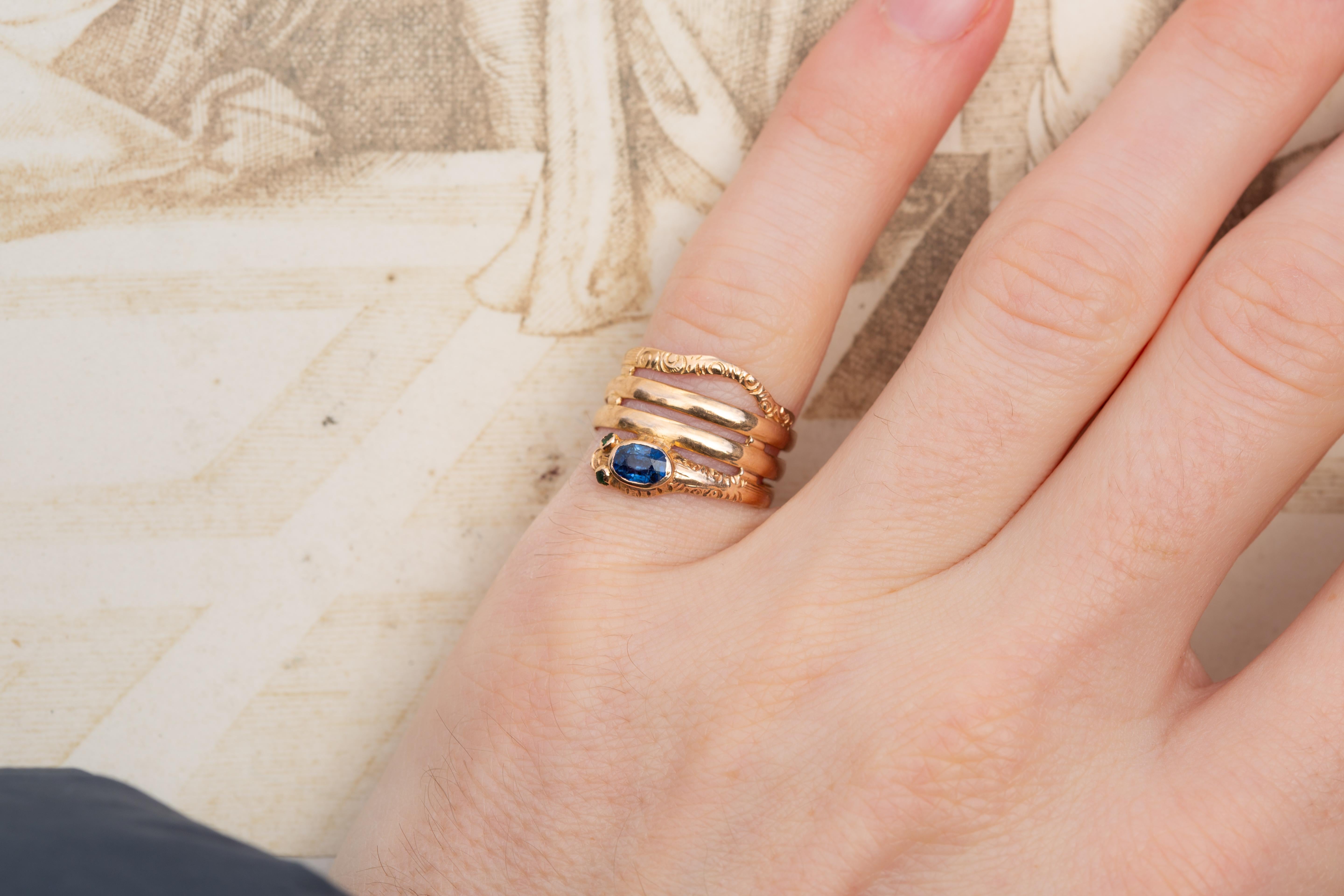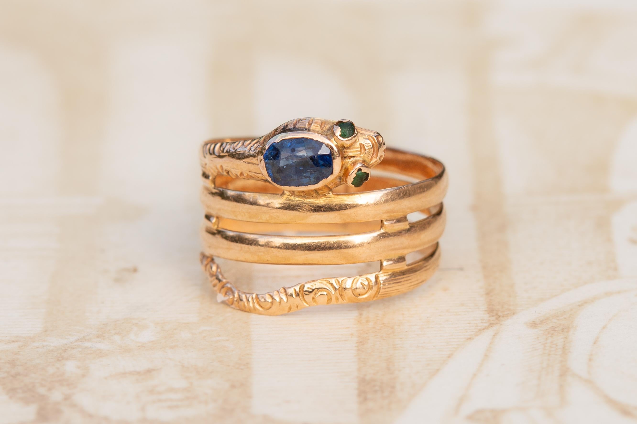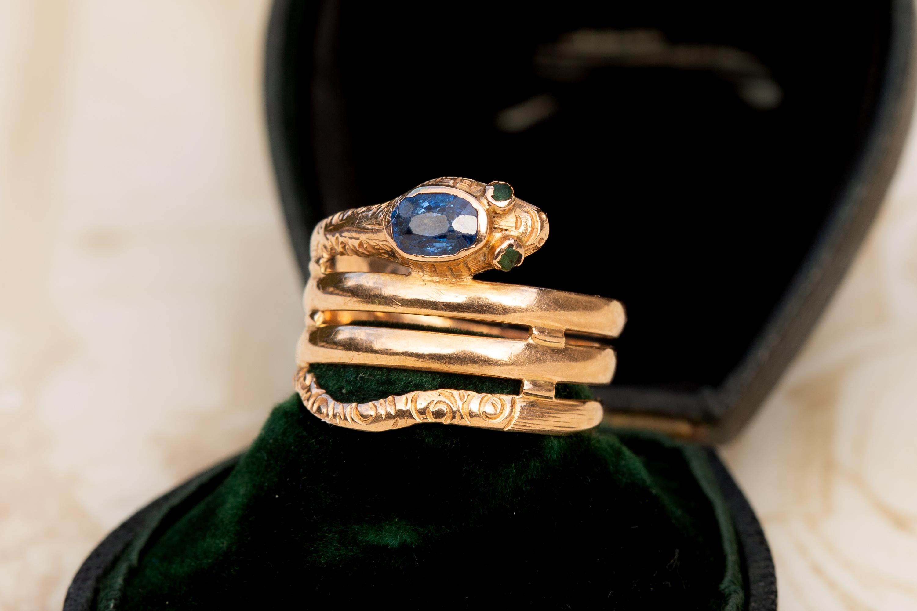 • A striking late 19th-century French snake ring, modelled as a serpent coiled around the finger and set to the head with a vivid royal-blue antique cushion-cut sapphire, approximately 0.35 carats. In the jewellery trade this central stone is traditionally referred to as the “brain of the snake”; its intense blue tone contrasts beautifully with the warm, rosy hue of the 18K gold mount, while the eyes are picked out in green paste, giving sharp definition and character to the head. The sapphire is secured in a raised rub-over bezel with an open back, allowing light to pass through the stone and making it easy to clean; the head and tail are further enriched with crisp ornamental engraving along the coils.