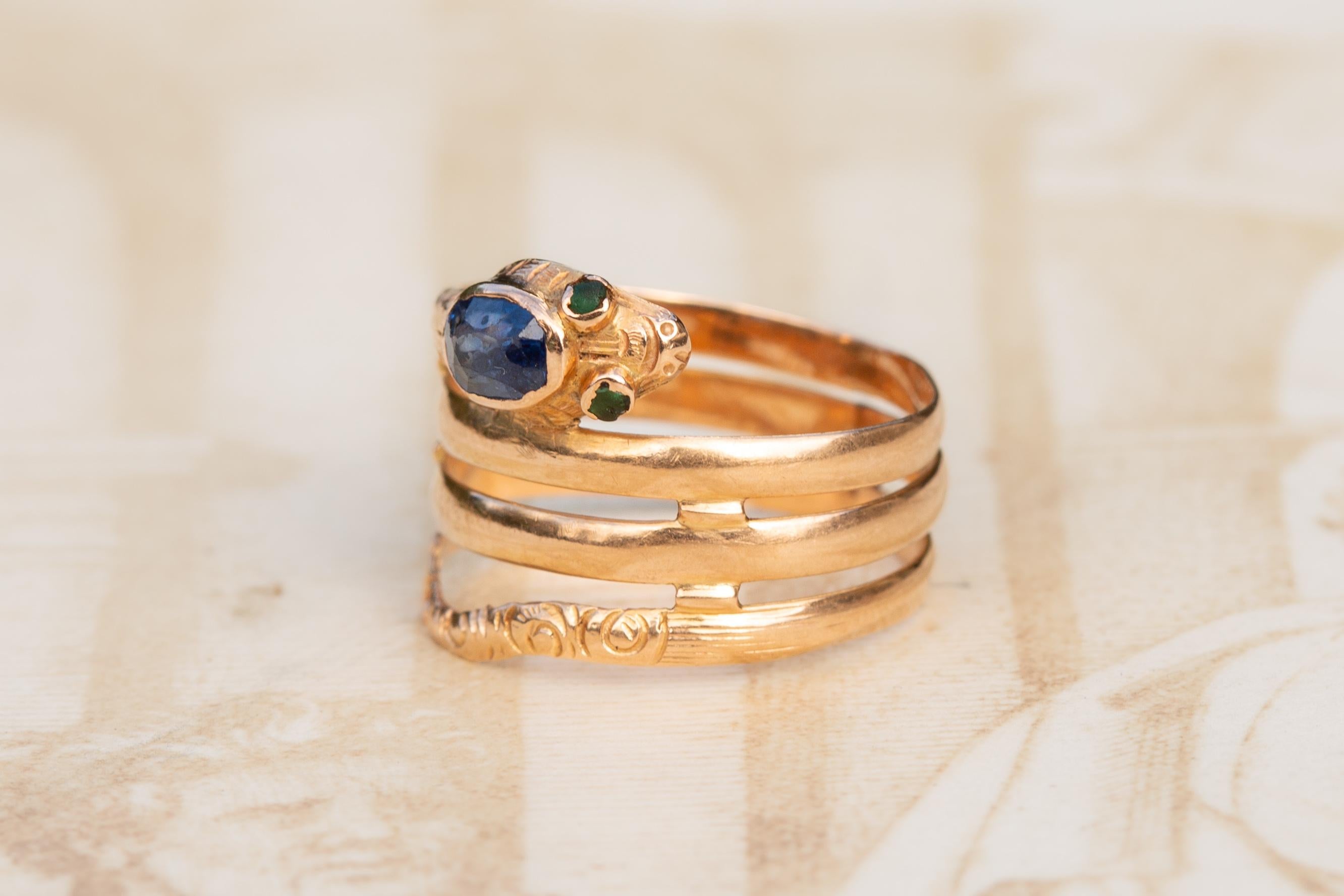 A striking late 19th-century French snake ring, modelled as a serpent coiled around the finger and set to the head with a vivid royal-blue antique cushion-cut sapphire, approximately 0.35 carats. In the jewellery trade this central stone is traditionally referred to as the “brain of the snake”; its intense blue tone contrasts beautifully with the warm, rosy hue of the 18K gold mount, while the eyes are picked out in green paste, giving sharp definition and character to the head. The sapphire is secured in a raised rub-over bezel with an open back, allowing light to pass through the stone and making it easy to clean; the head and tail are further enriched with crisp ornamental engraving along the coils.