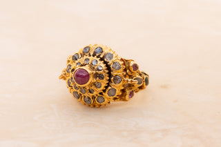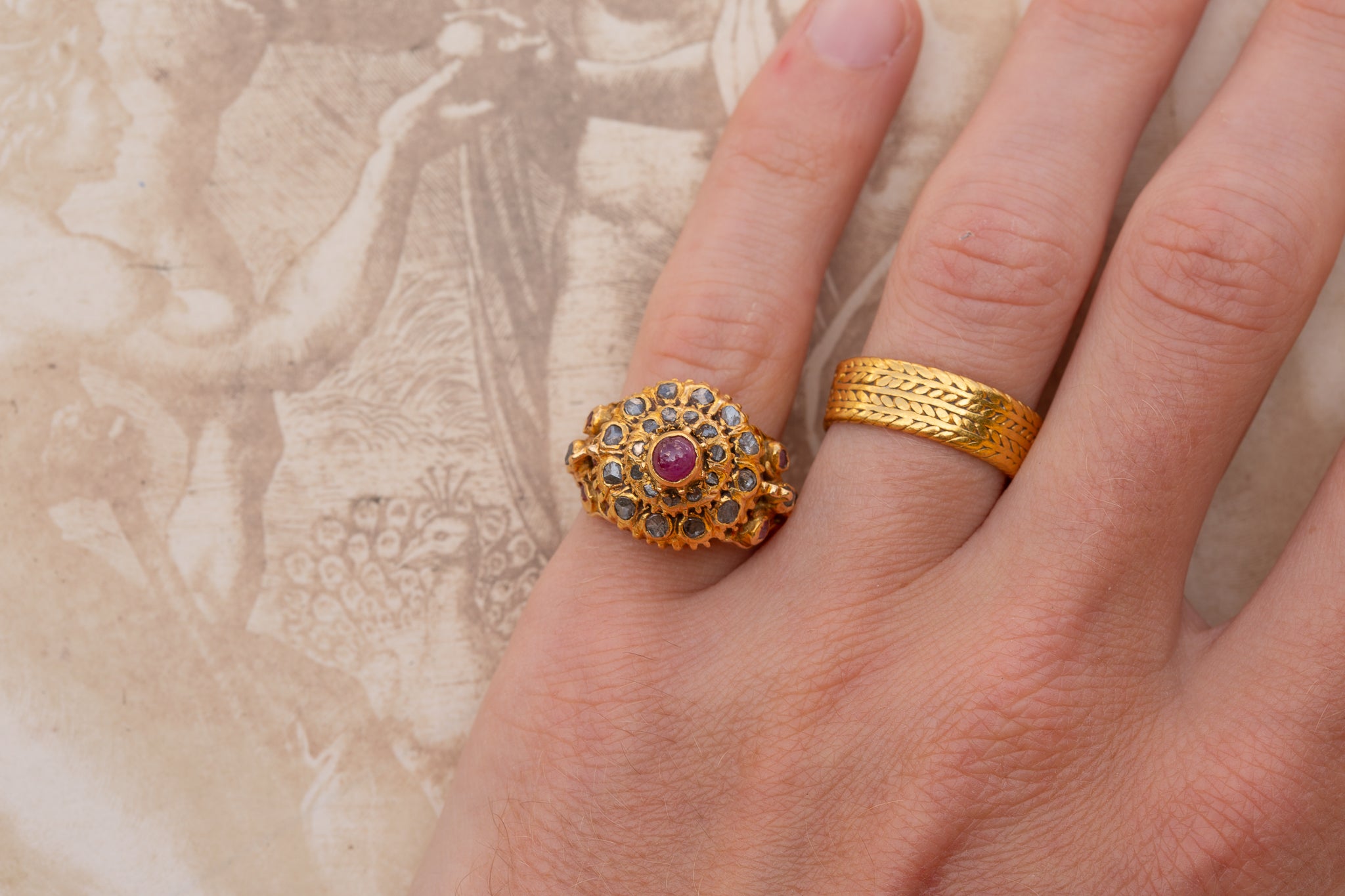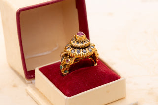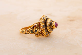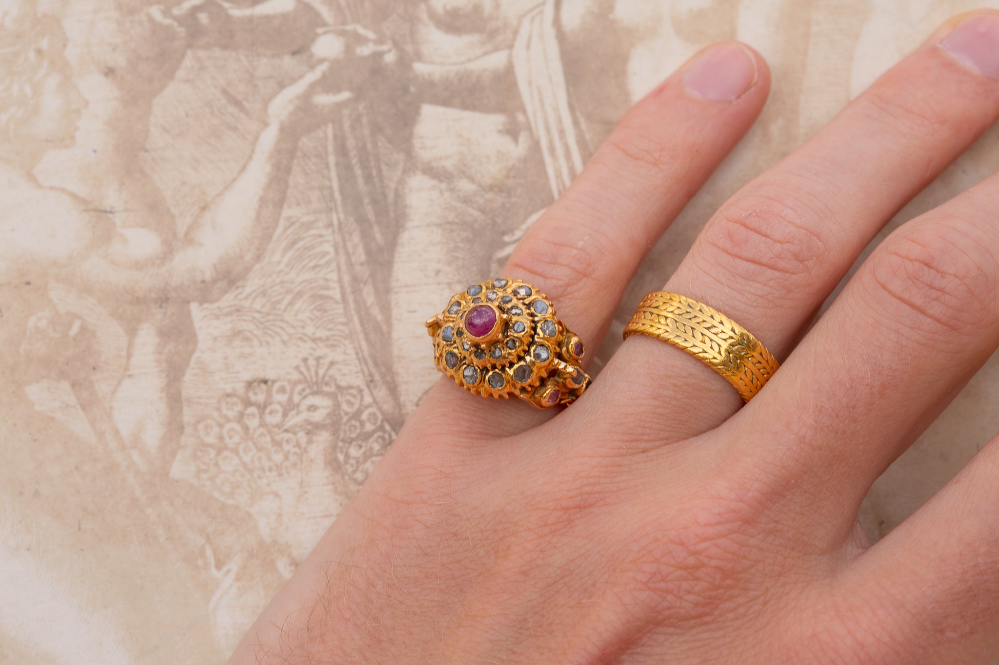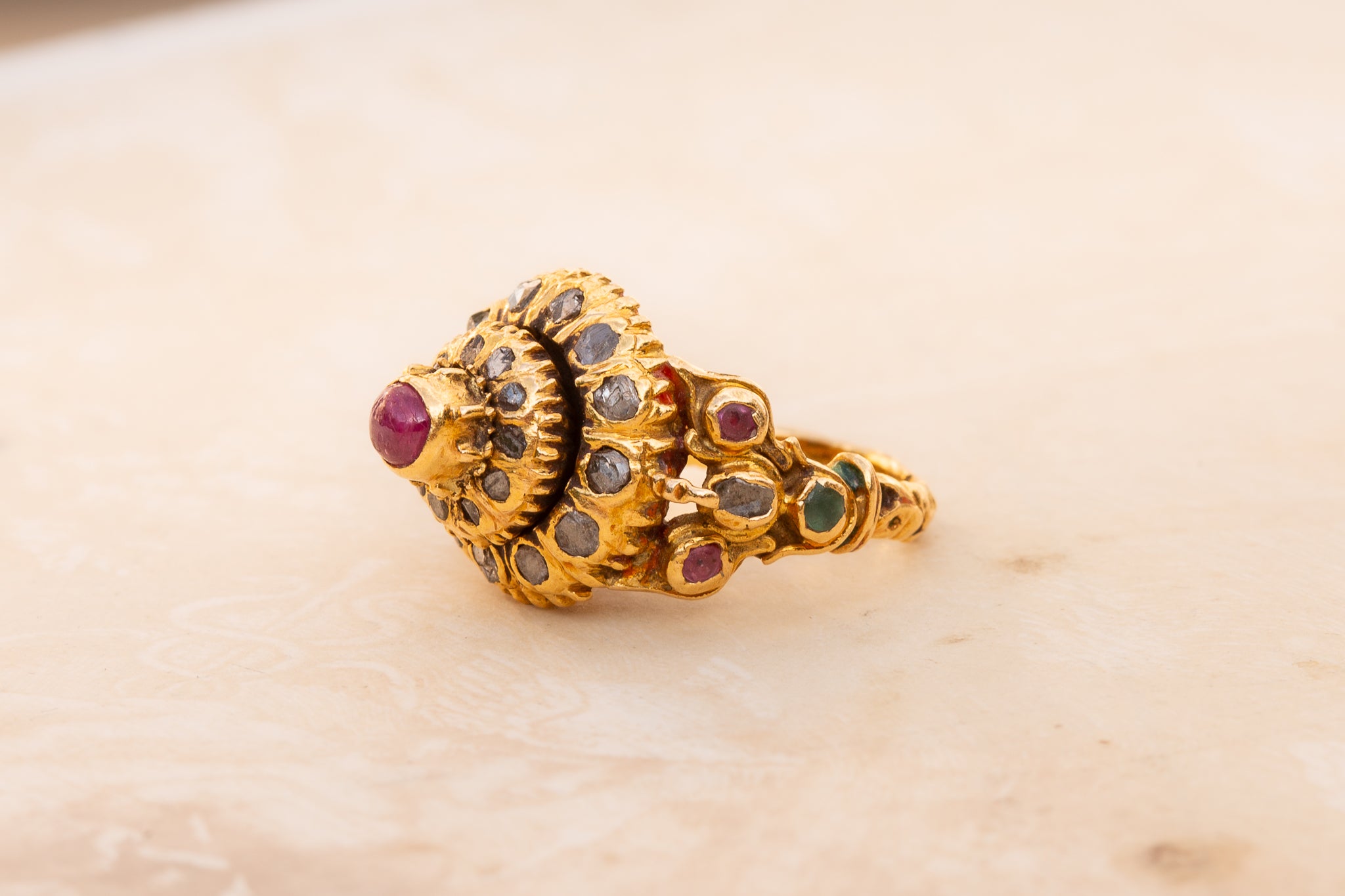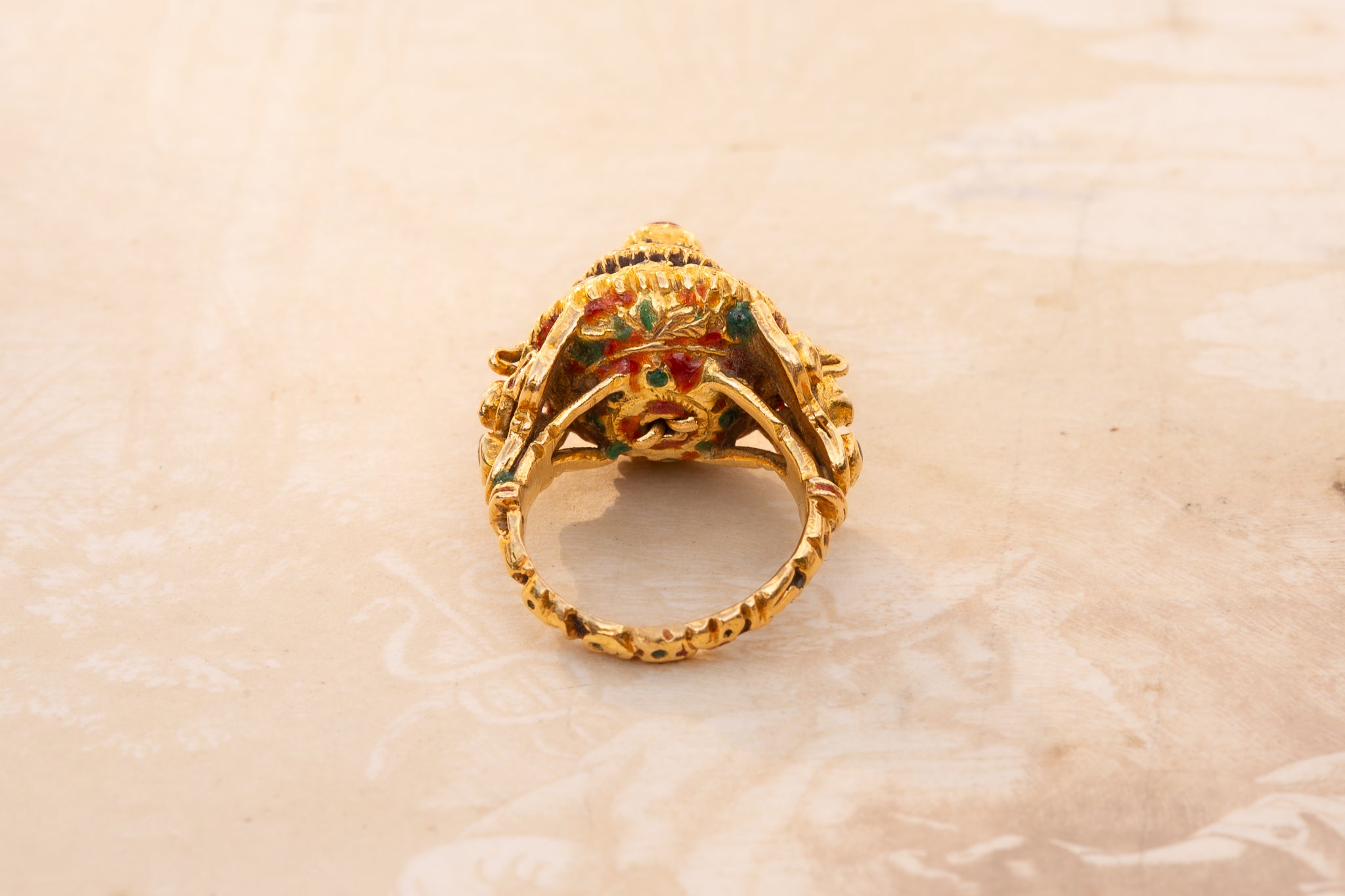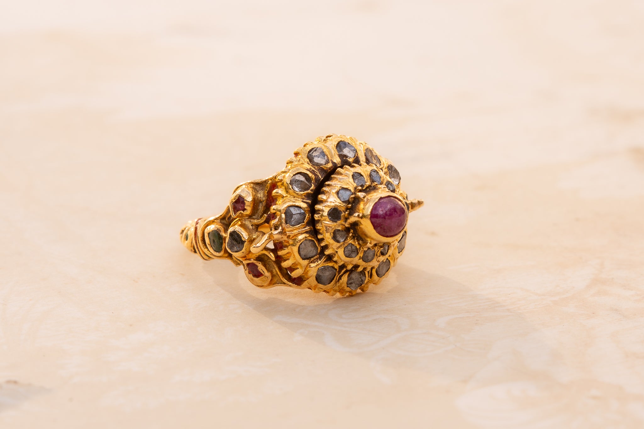 A ‘mondop’ is the tiered roof of a temple, for example that of Wat Phra Kaew in Bangkok, and is designed to be in the shape of the image of Buddha. The top tier of this ring features a bezel set star ruby cabochon while the rest of the bezel is covered with diamonds. The two outermost tiers rotate and are connected to the main body of the ring with a bifurcated rivet visible on the closed-back underside of the bezel, typical ornamentation of 18th century layered cluster rings. The arched shoulders are equally as ornate with bezel set rub over diamonds, emeralds and rubies appearing between foliate motifs and protruding serpent-esque decoration. The underside and outershank display bright red and green floral enamelling often seen on naga rings and Siam jewellery of the 18th century, with examples of this style found in the V&A museum, Smithsonian museum and Cleveland museum of art.