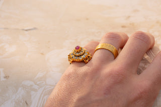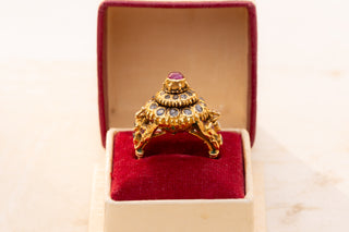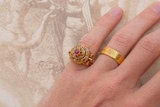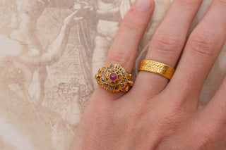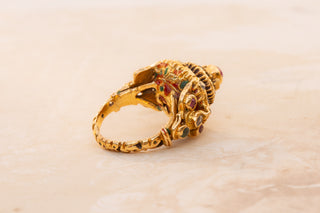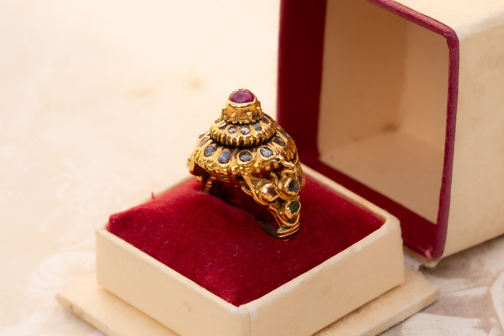 This incredibly ornate piece was made in Siam during the late Ayutthaya or early Rattanakosin Kingdom period. It dates to the late 18th/early 19th century and is a very rare example of a ceremonial ‘mondop’ or ‘pagoda’ ring.