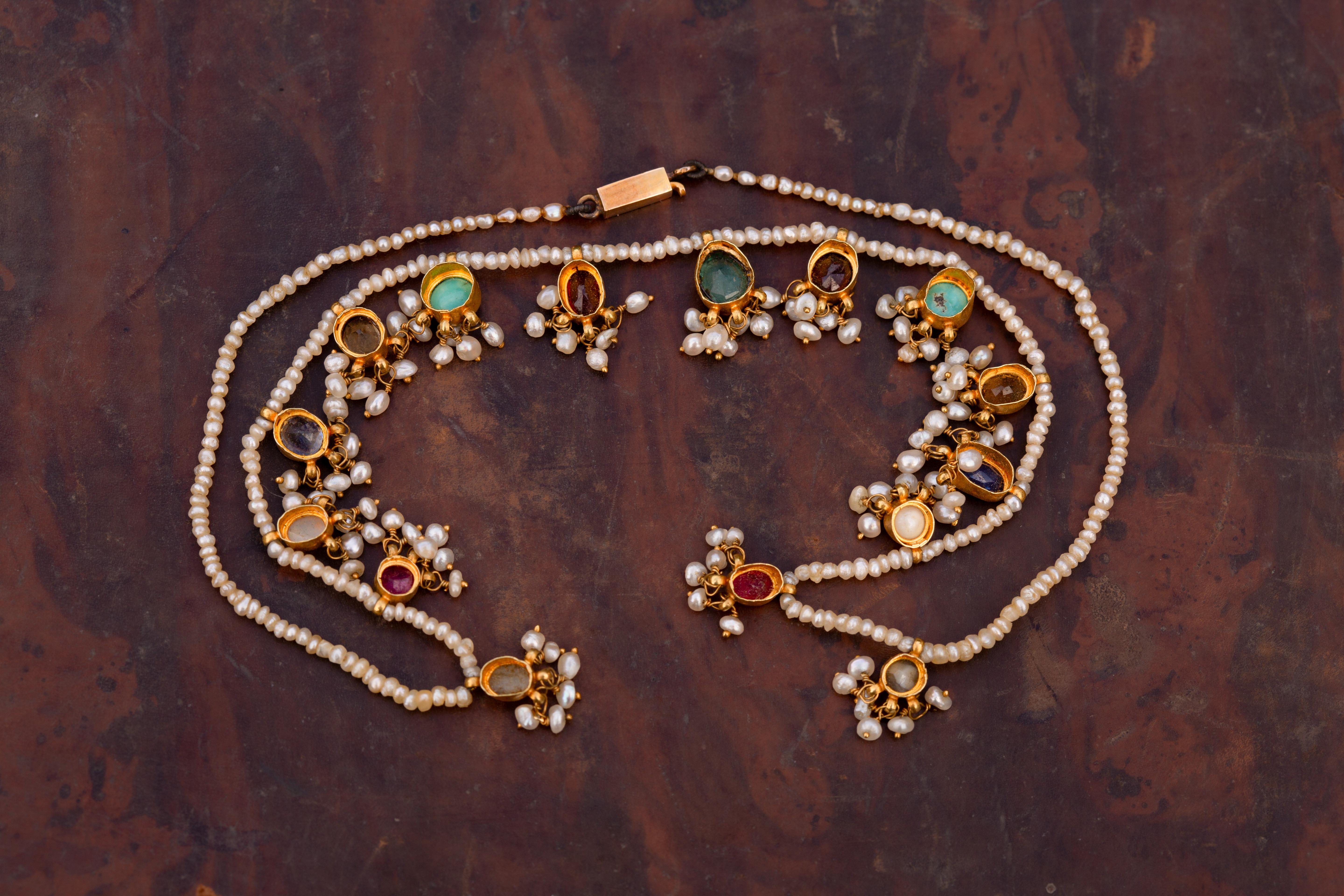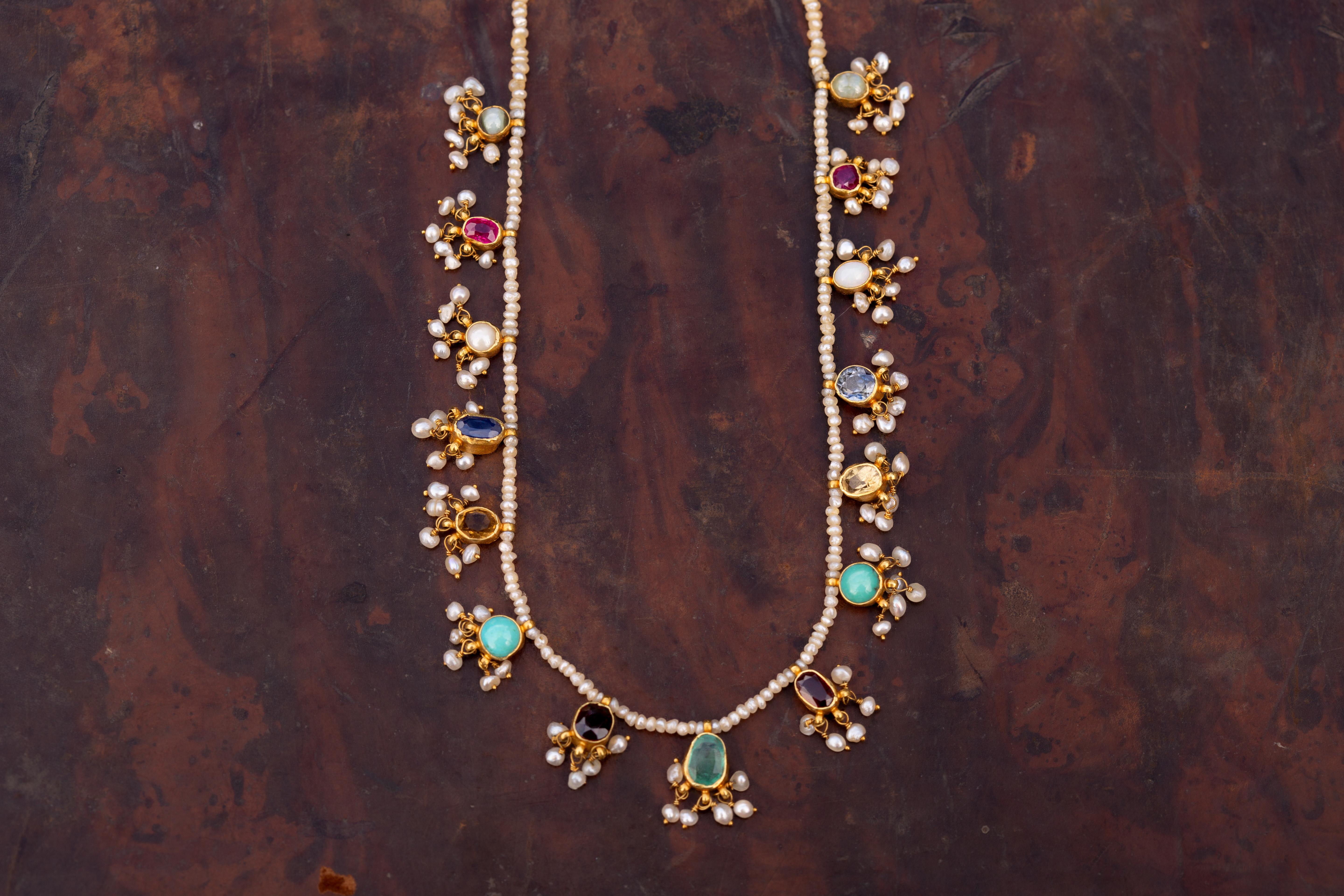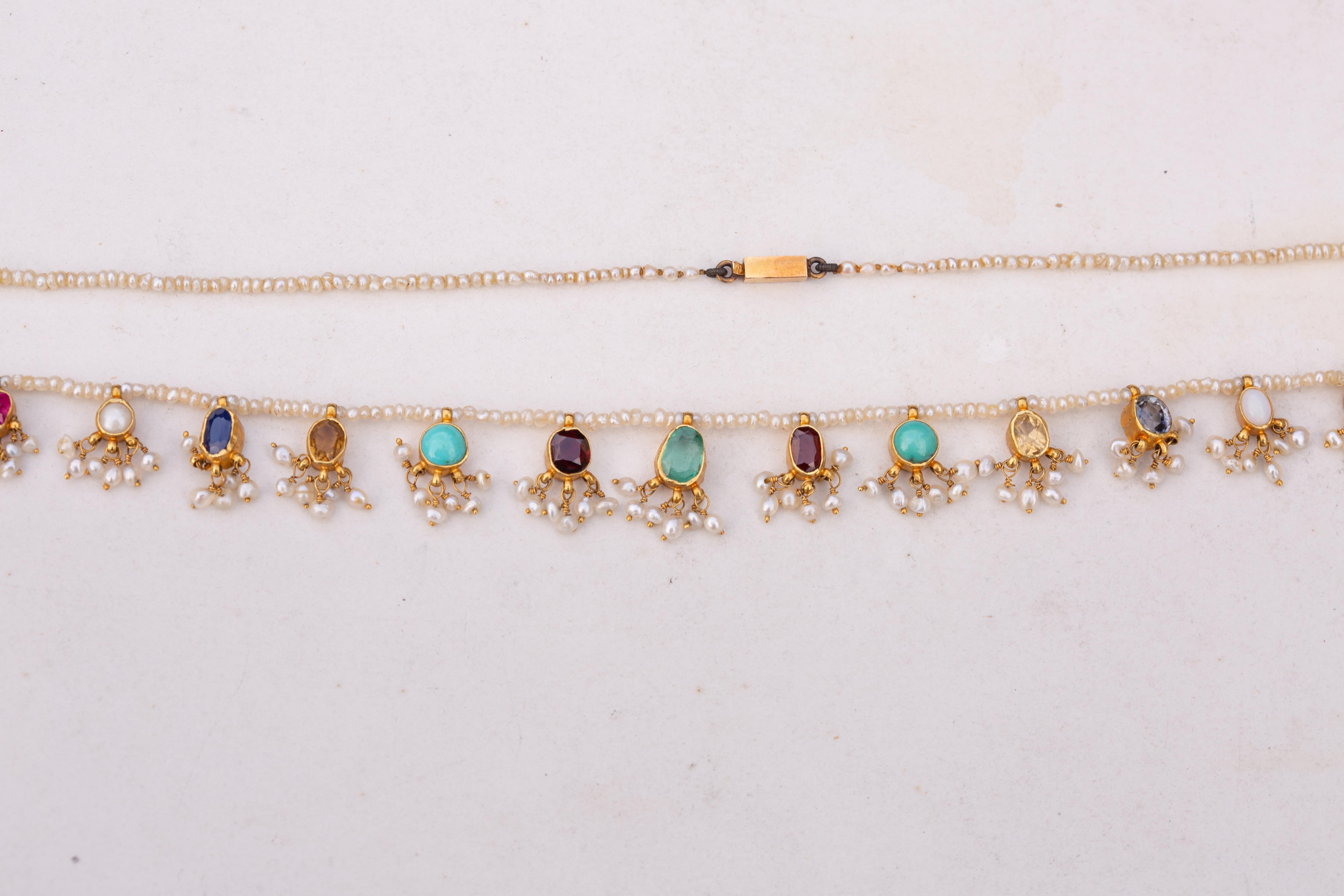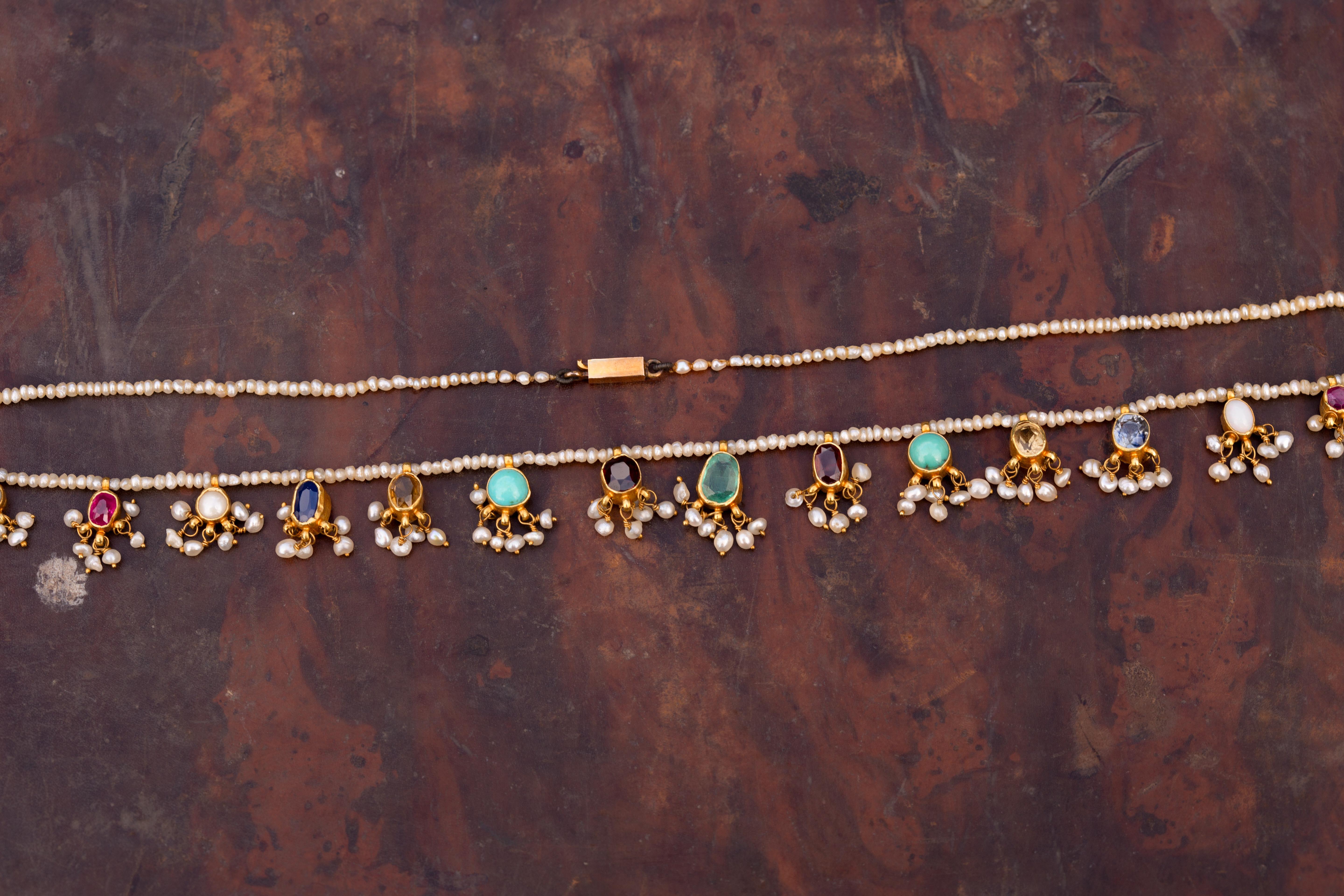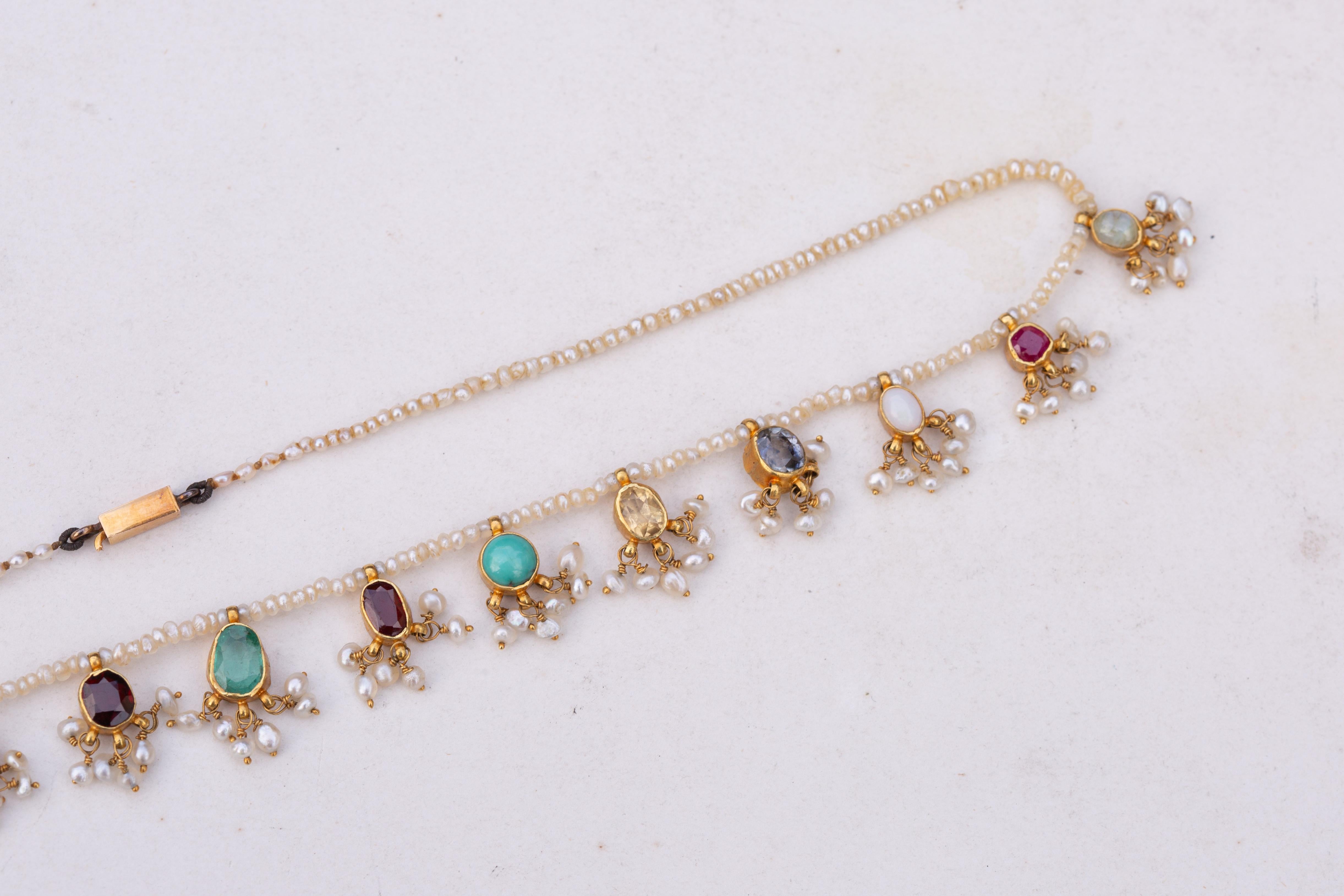 A late 19th-century Indian gemstone necklace, dating to around 1890, composed of a continuous strand of natural seed pearls suspending a repeated sequence of gem-set gold mounts. The stones include cat’s-eye chrysoberyl, sapphire, ruby, citrine, garnet, turquoise, pearl, opal, and tourmaline, each set in open-backed collet mounts to allow maximum light and colour expression.Each gem is finished with a delicate fringe of seed pearl tassels, creating gentle movement and surface texture against the luminous pearl ground. The necklace is strung with approximately 300 natural seed pearls, forming a refined yet vibrant contrast to the richly coloured gemstones. The gold mounts are crafted in high-karat gold, testing at approximately 22K, while the later antique barrel clasp tests as 18K.The necklace has a repeated pattern of gemstones, in a navaratna style. Navaratna jewellery has deep cultural significance within the Indian subcontinent, traditionally associated with cosmic balance, protection, and prosperity. Each of the gemstones are believed to correspond to a celestial body, with the complete arrangement symbolising harmony and auspiciousness.The necklace measures 41cm in length and weighs 11.61 grams. The gemstones range in size from approximately 3mm to 7 × 5mm. Condition is excellent, with all gemstones secure and tassels intact.A vibrant and highly evocative example of late 19th-century Indian jewellery; rich in colour, symbolism, and presence.