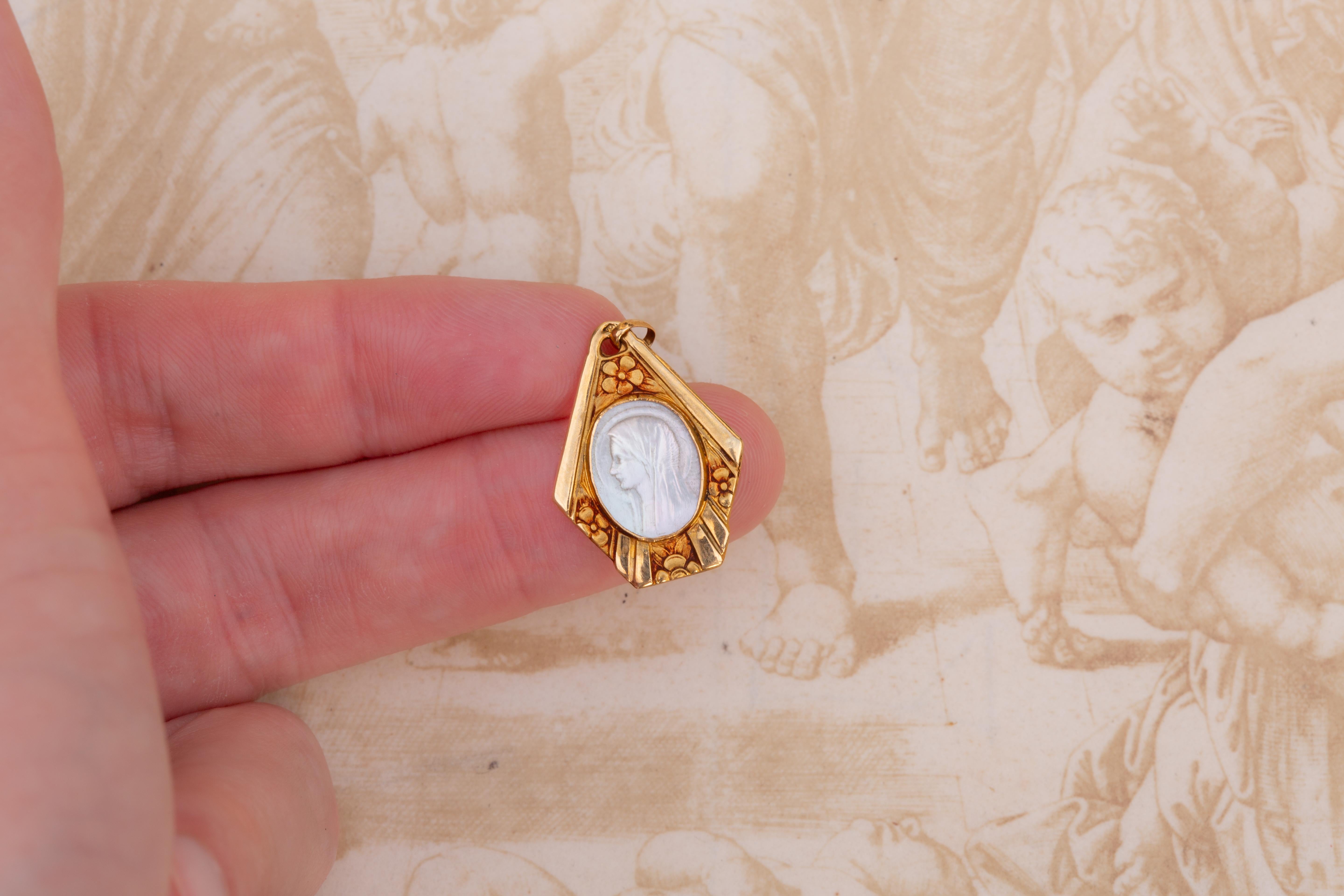 A refined antique French Art Deco devotional pendant, circa 1920’s, crafted in 18 karat gold and set with a luminous oval mother-of-pearl plaque intricately engraved with the profile of the Virgin Mary. The carving is executed with precision, capturing both serenity and quiet presence.