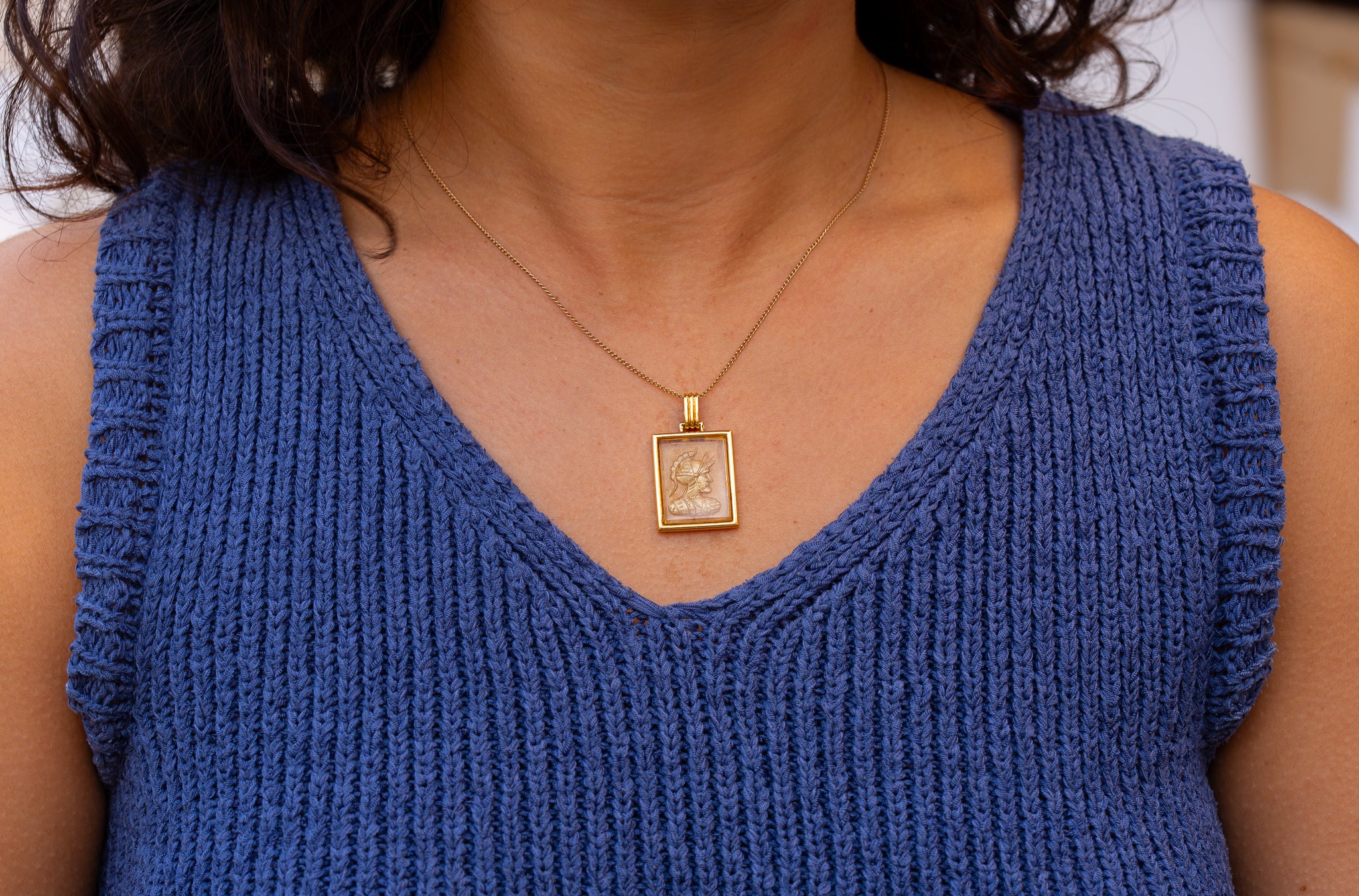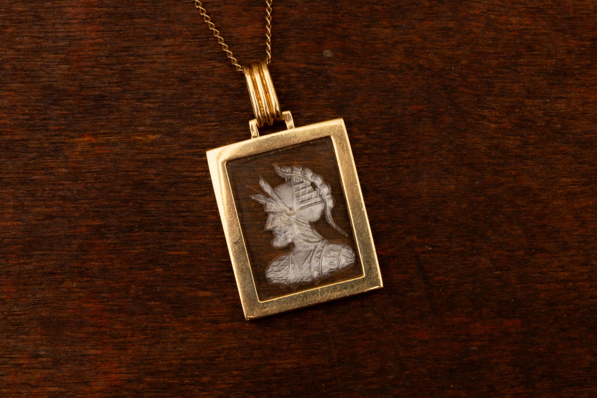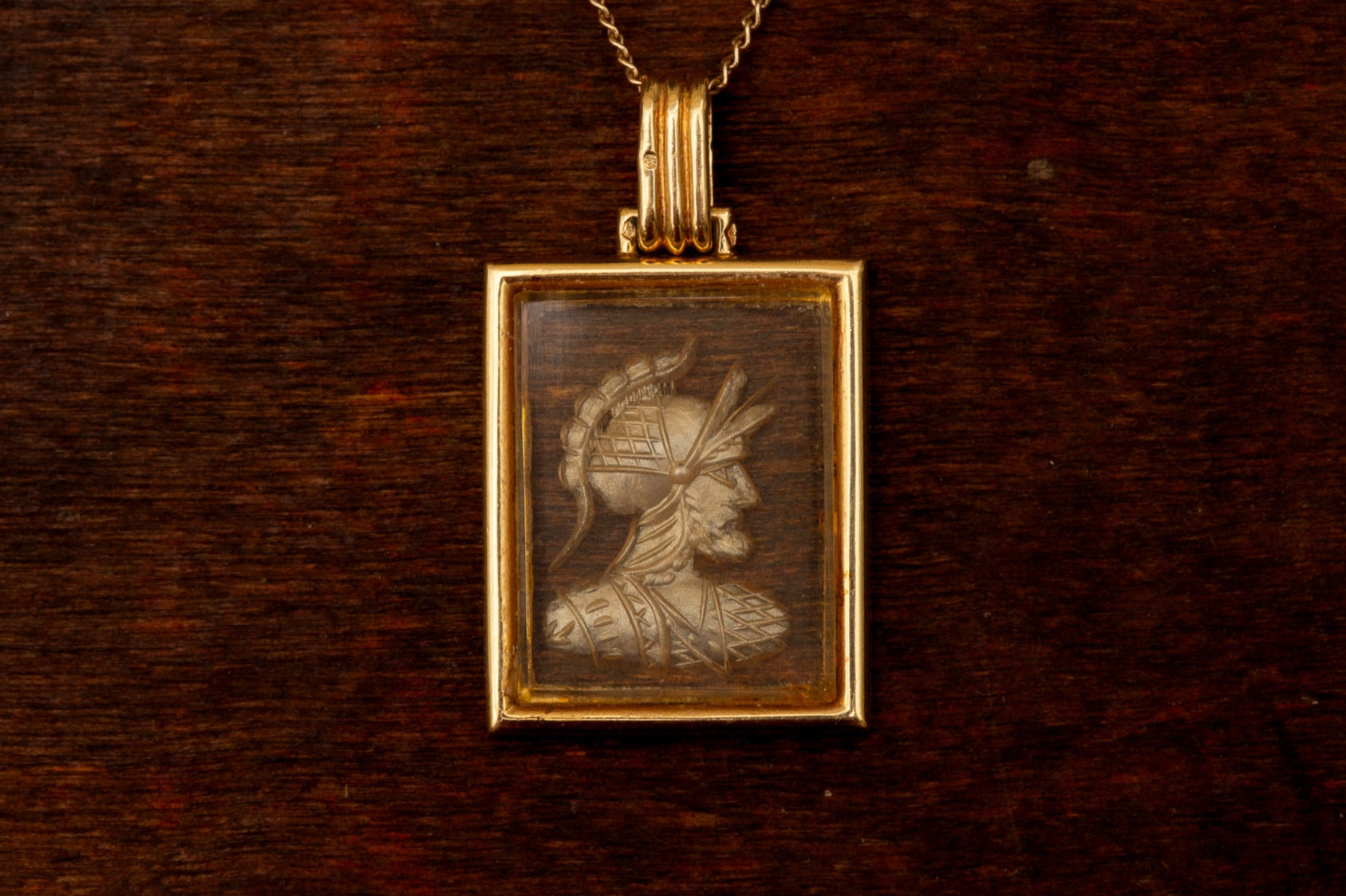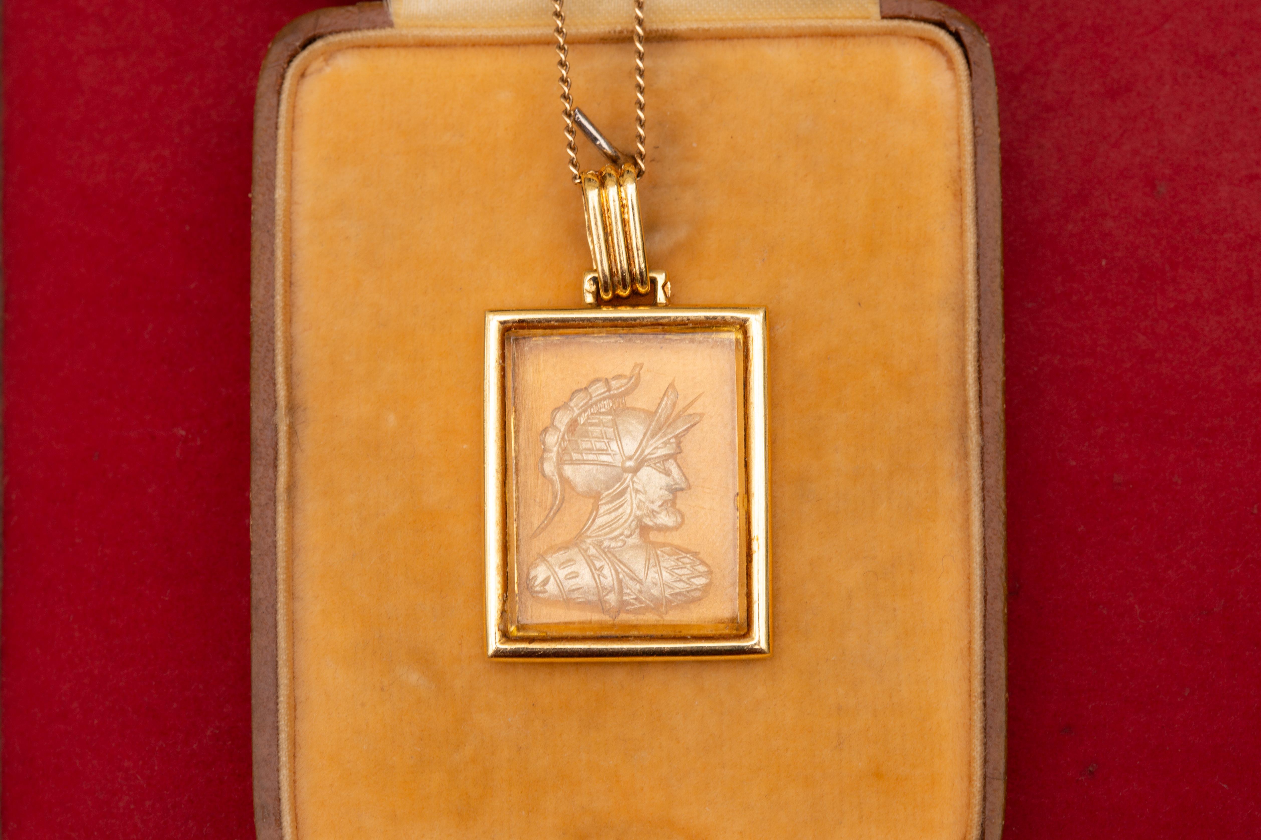 • An unusual and beautifully preserved antique French citrine intaglio pendant necklace, crafted in 18K gold and dating to around 1880. The pendant is carved with an intricately detailed profile of a Roman god or centurion; likely Mars, the Roman god of war - wearing a crested helmet and ornate armour.