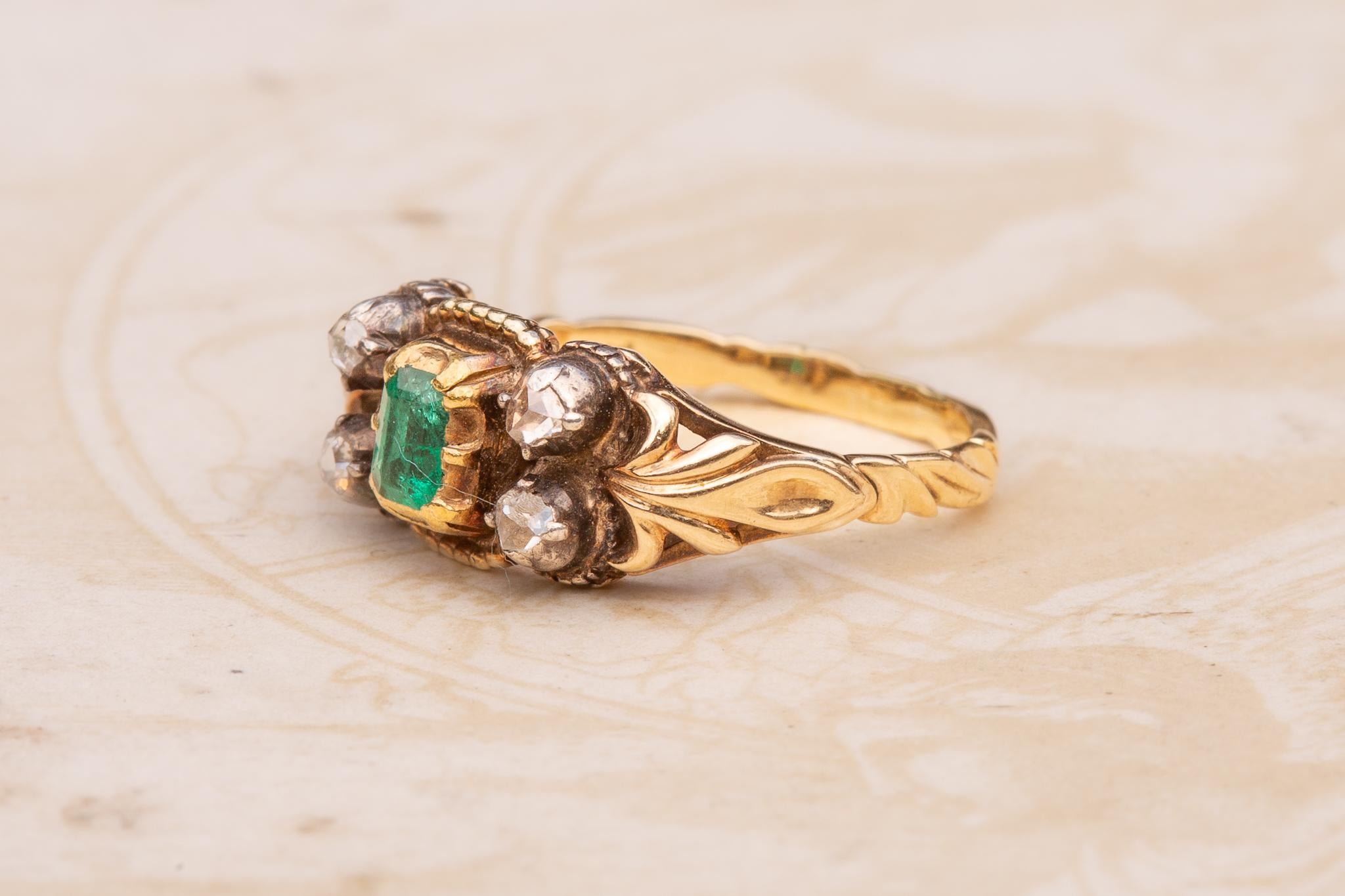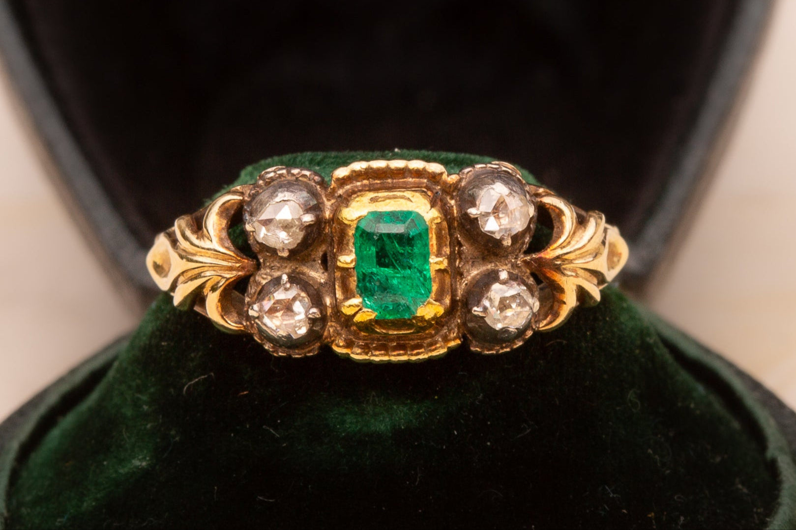 An unusual and finely crafted antique emerald and diamond ring, made in Germany in the 19th century.The ring centres on a vivid step-cut emerald (approx. 4 × 3mm), set in an open-backed rectangular rub-over collet. Its bright green colour and characteristic inclusions are consistent with Colombian origin, the most prized source in historical emerald trade.Flanking the emerald are four rose-cut diamonds set in silver, their foil backing and clustered arrangement in keeping with 19th-century continental jewellery practices. The gallery is particularly ornate, with foliate embossing behind the stones and finely modelled pierced starburst motifs beneath the diamonds.The shoulders are formed of elegant C-scrolls that transition into a chased Rococo-style band, lending the ring a sculptural and romantic quality.Size: UK N½ / US 6.75Weight: 4.15gCondition: Very good antique condition. Emerald is well-preserved with good colour and some natural inclusions; settings and goldwork crisp and structurally sound.
