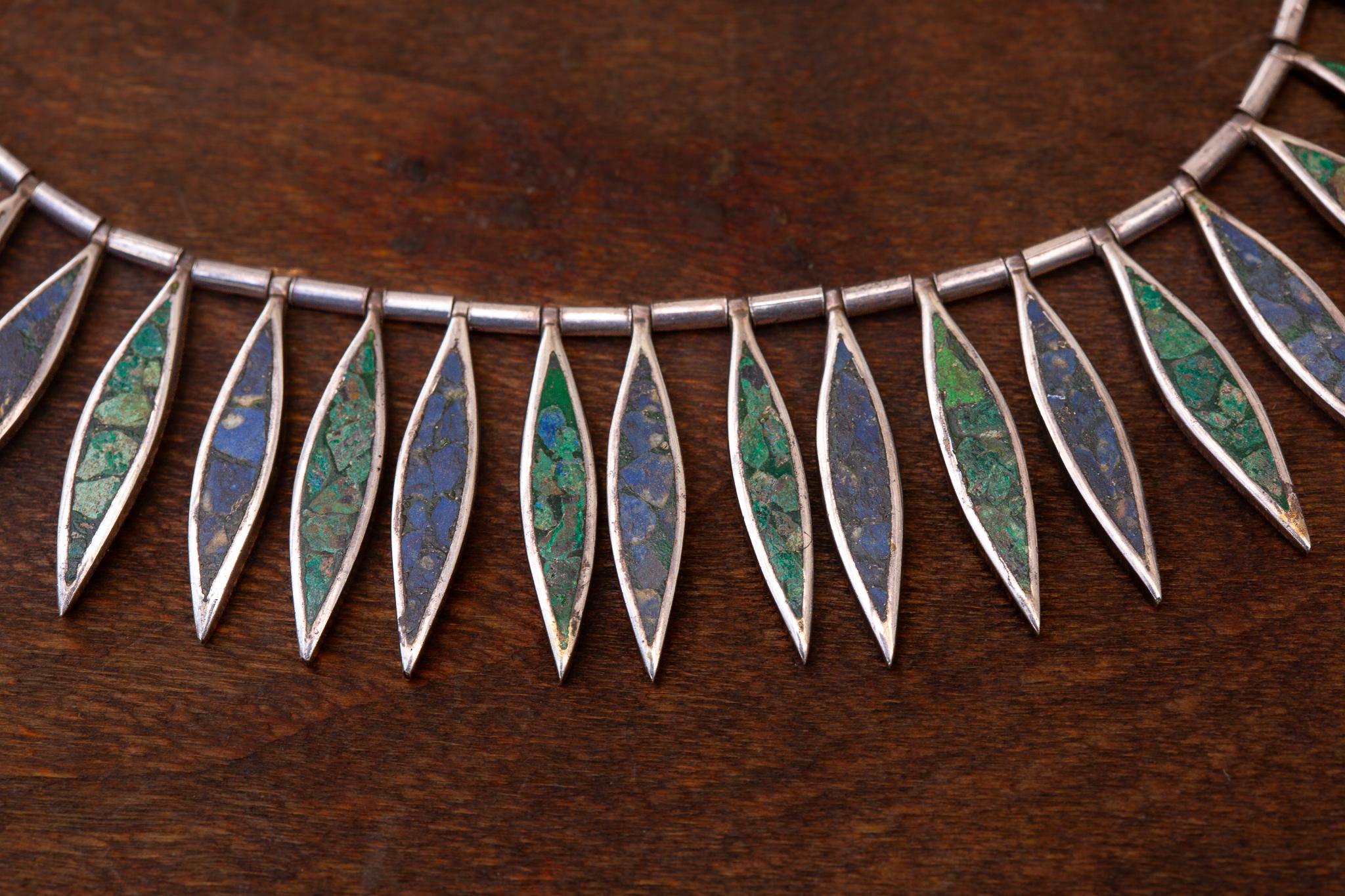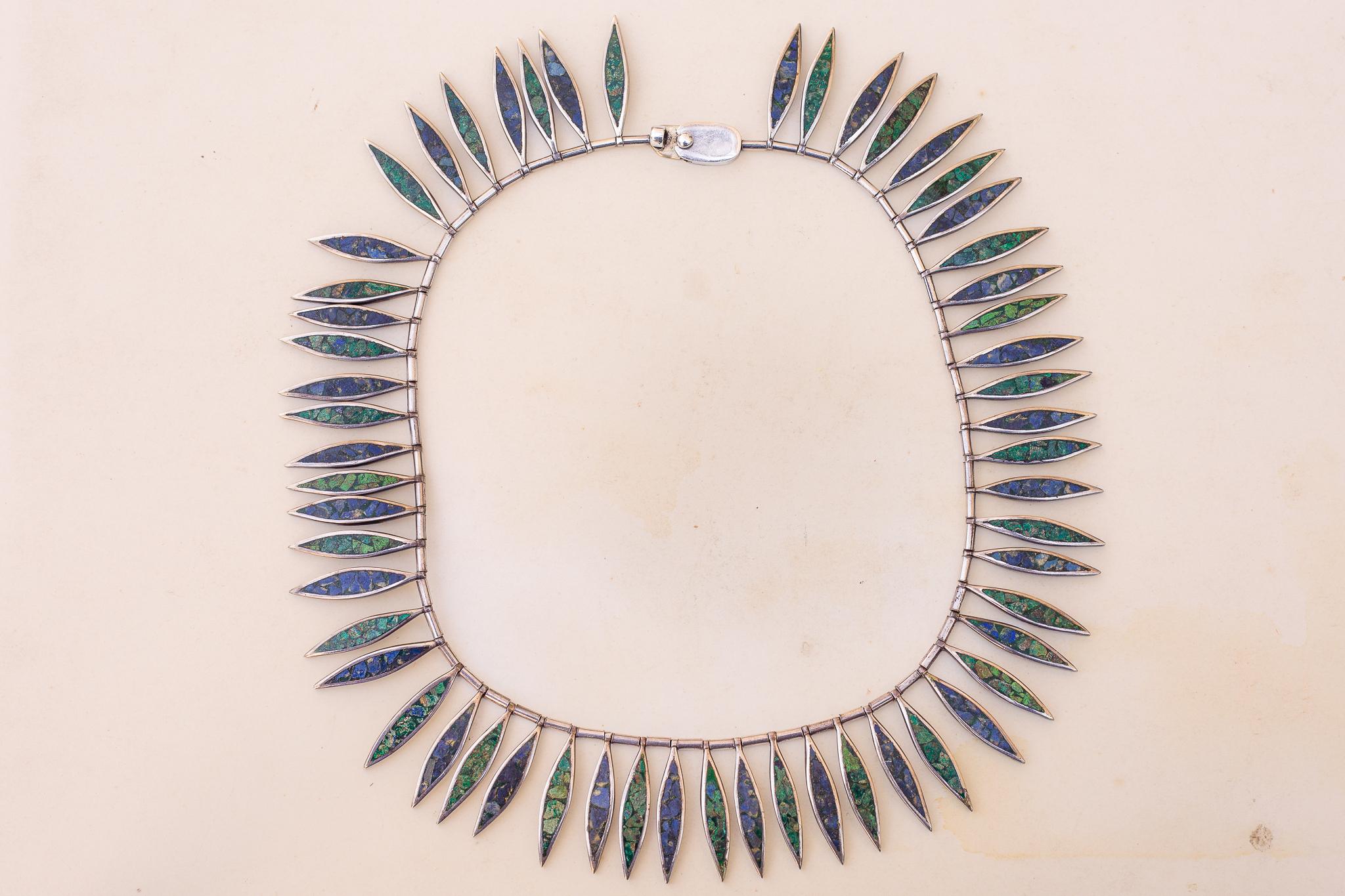 The necklace is composed of a rhythmic succession of articulated leaf shaped panels, each inlaid with crushed green turquoise and lapis lazuli that create an almost mosaic like play of blue and green across the neckline. The links are threaded over a central metal wire that allows the necklace to drape with graceful weight and movement. It measures 44 cm in length and has an impressive heft of 125 g, giving it the substantial presence characteristic of high quality Mexican silver work of the period. Each individual leaf panel is 3 cm long, producing a beautifully graduated collar that sits close to the neck.