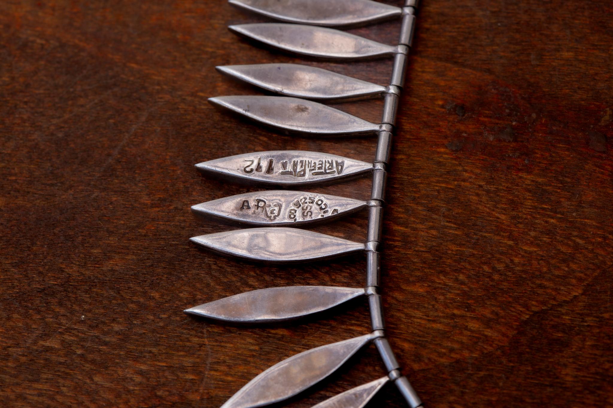 • A striking vintage Mexican silver collar necklace made in Mexico City around 1950 by Arte en Plata, the early trading name used by the Jacopo brothers before the business later evolved into Joyas en Plata. Their workshop was known for commissioning independent Taxco craftsmen, and this piece reflects the bold sculptural design language of mid century Mexican silver.
