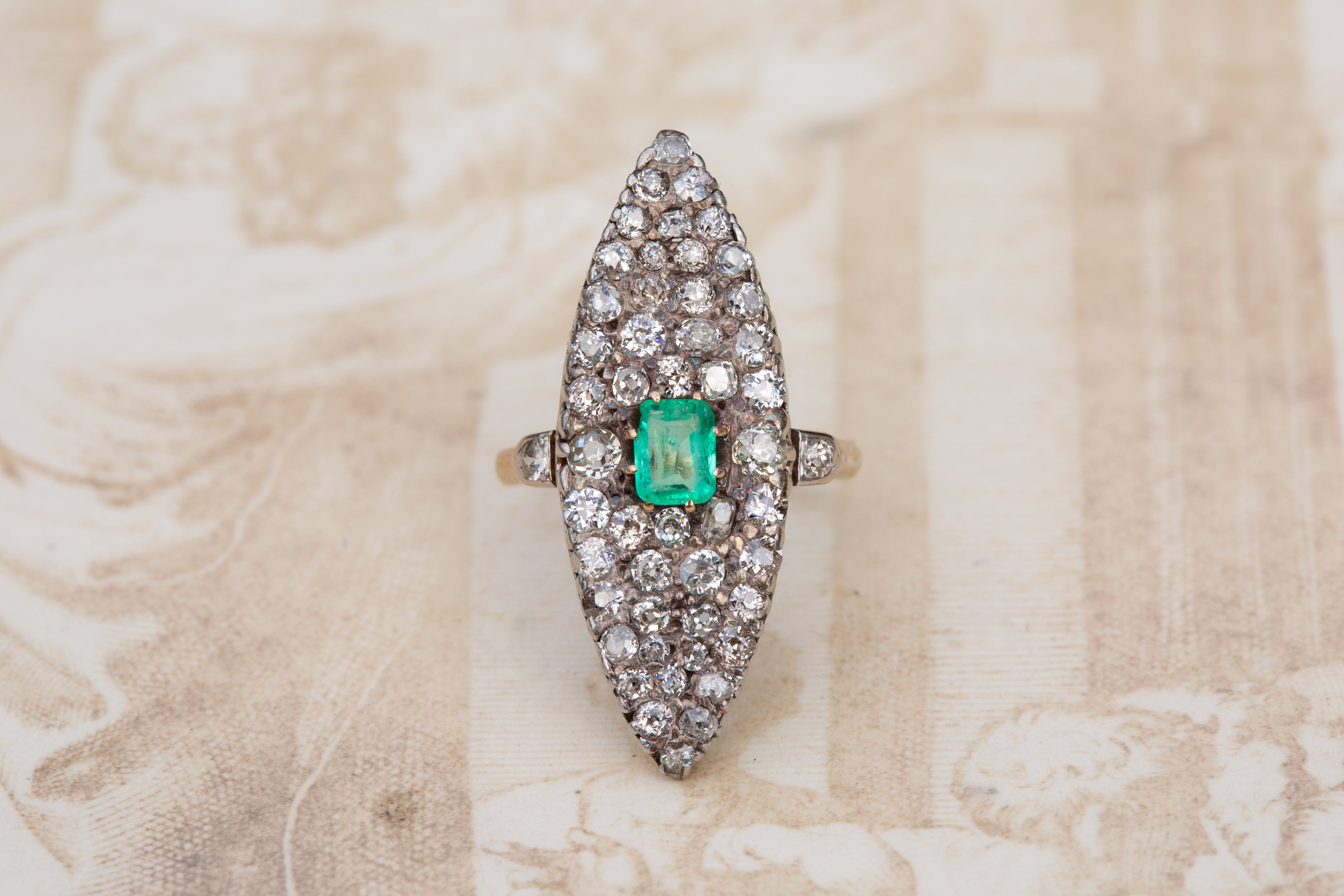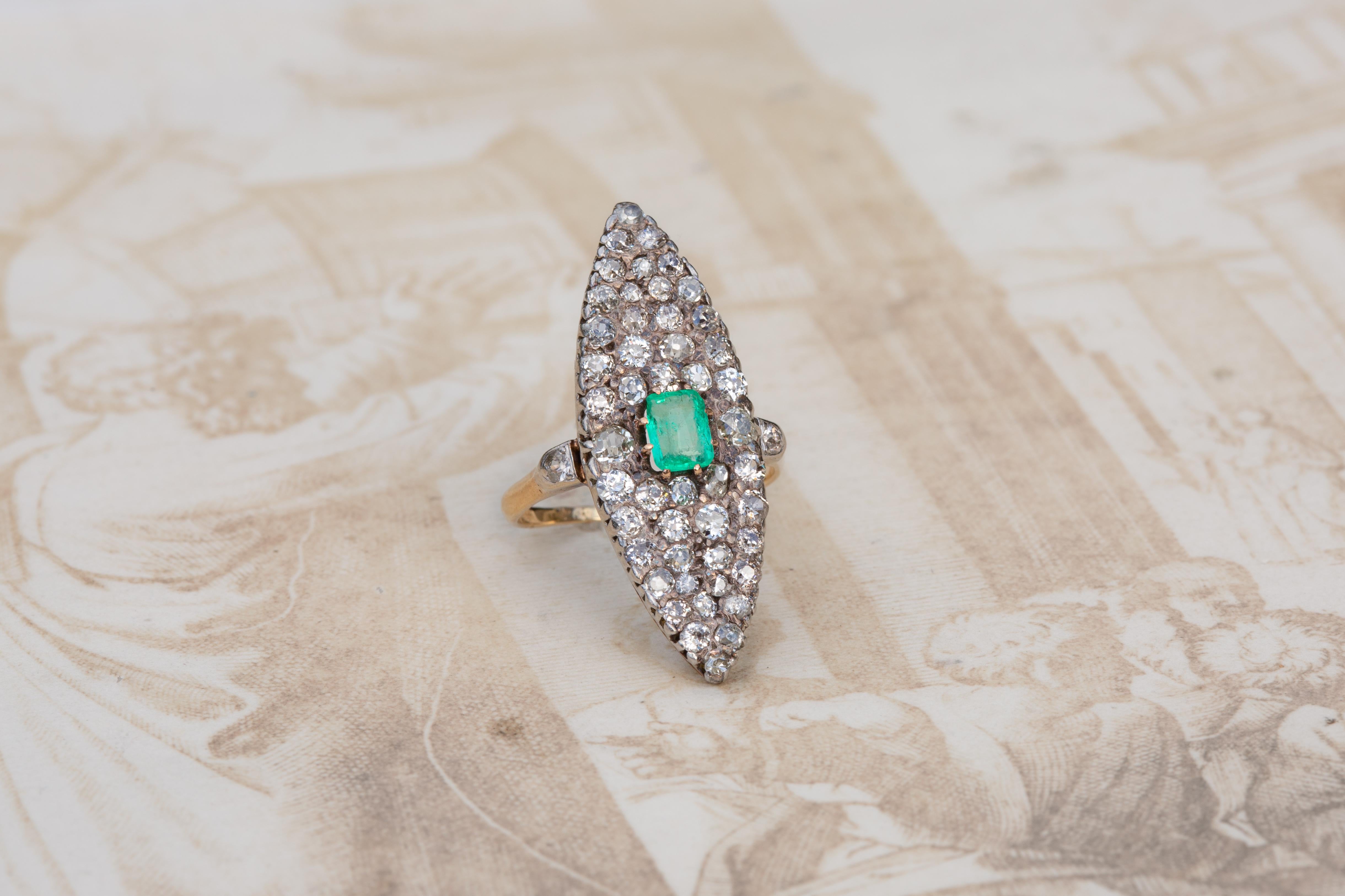 A superb and increasingly scarce example of late 19th-century French jewellery, combining the classic navette form with the rarity of an emerald centre; a striking choice for an engagement ring or a highly distinctive addition to a serious collection of antique French jewels.