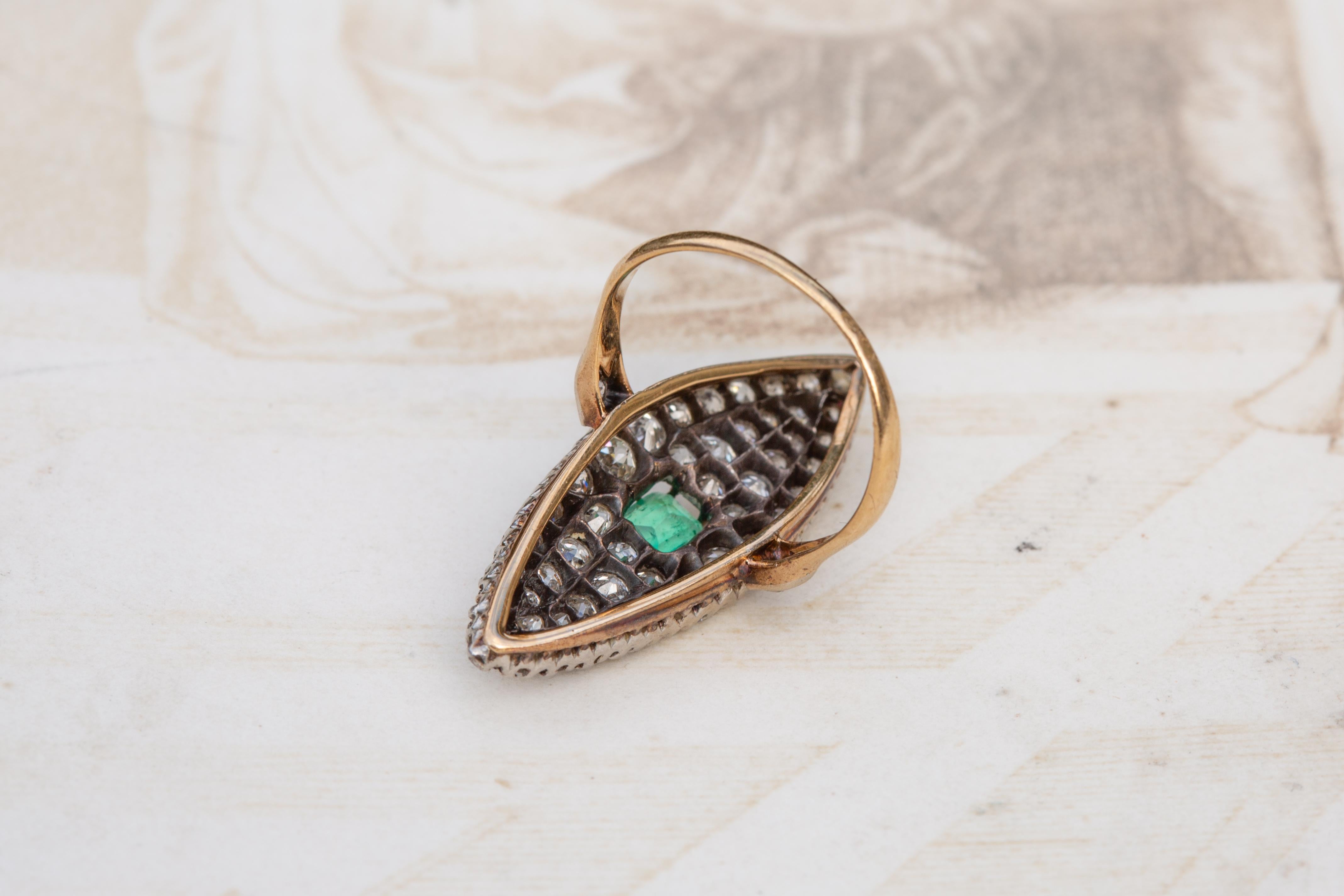 A refined and elegant French ring dating to the late 19th century, circa 1880. The elongated navette-shaped head is centred with a step-cut emerald of vivid, bright green colour, surrounded by a dense field of old-cut diamonds which taper elegantly towards the pointed terminals, creating a strong sense of movement and excellent finger coverage.