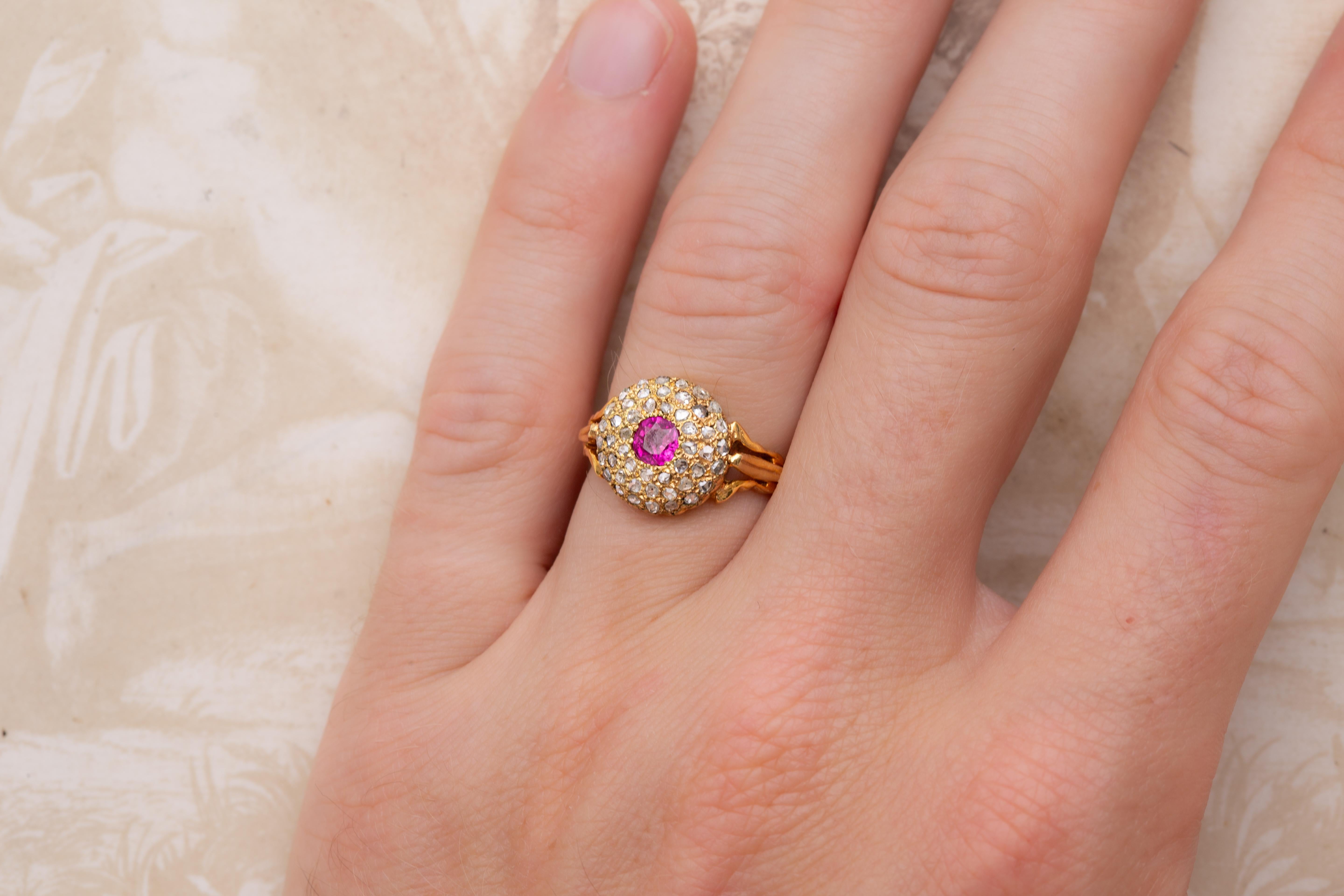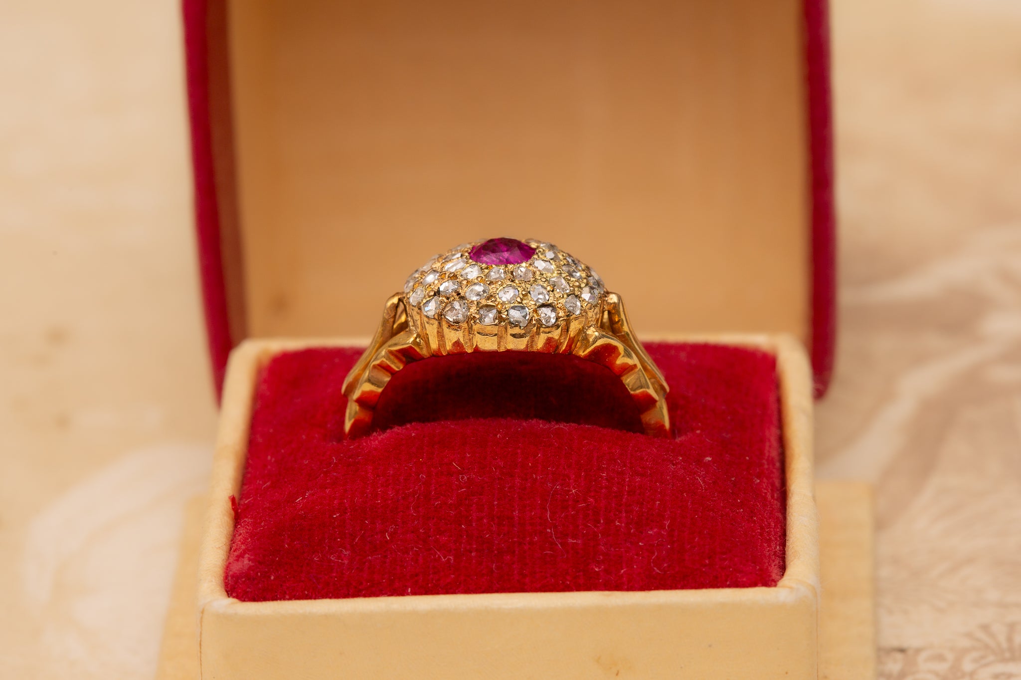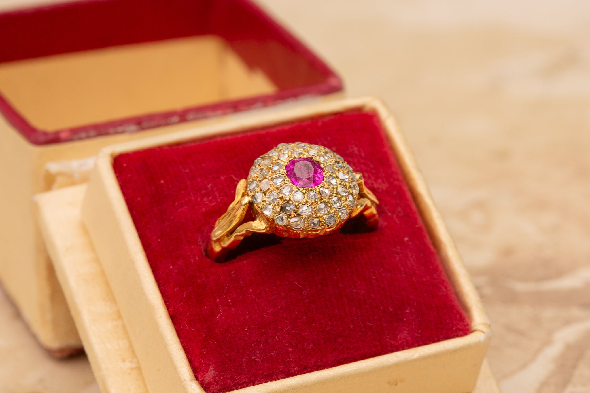 A stunning antique gold cluster ring dating from the late Victorian period circa 1880. This dome-shaped cluster is set with a round cut ruby in the centre, surrounded by a sea of 48 rose cut diamonds.
