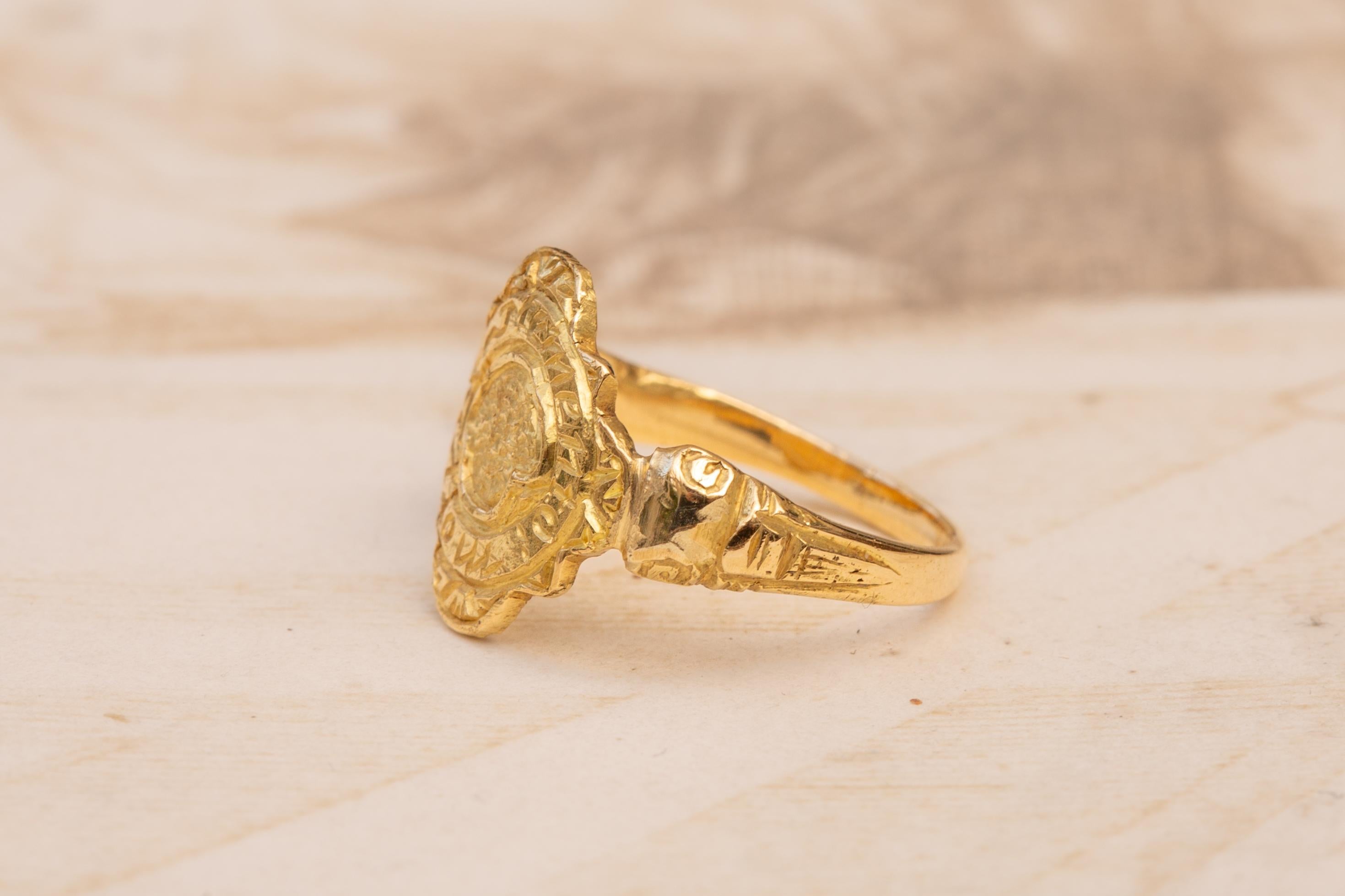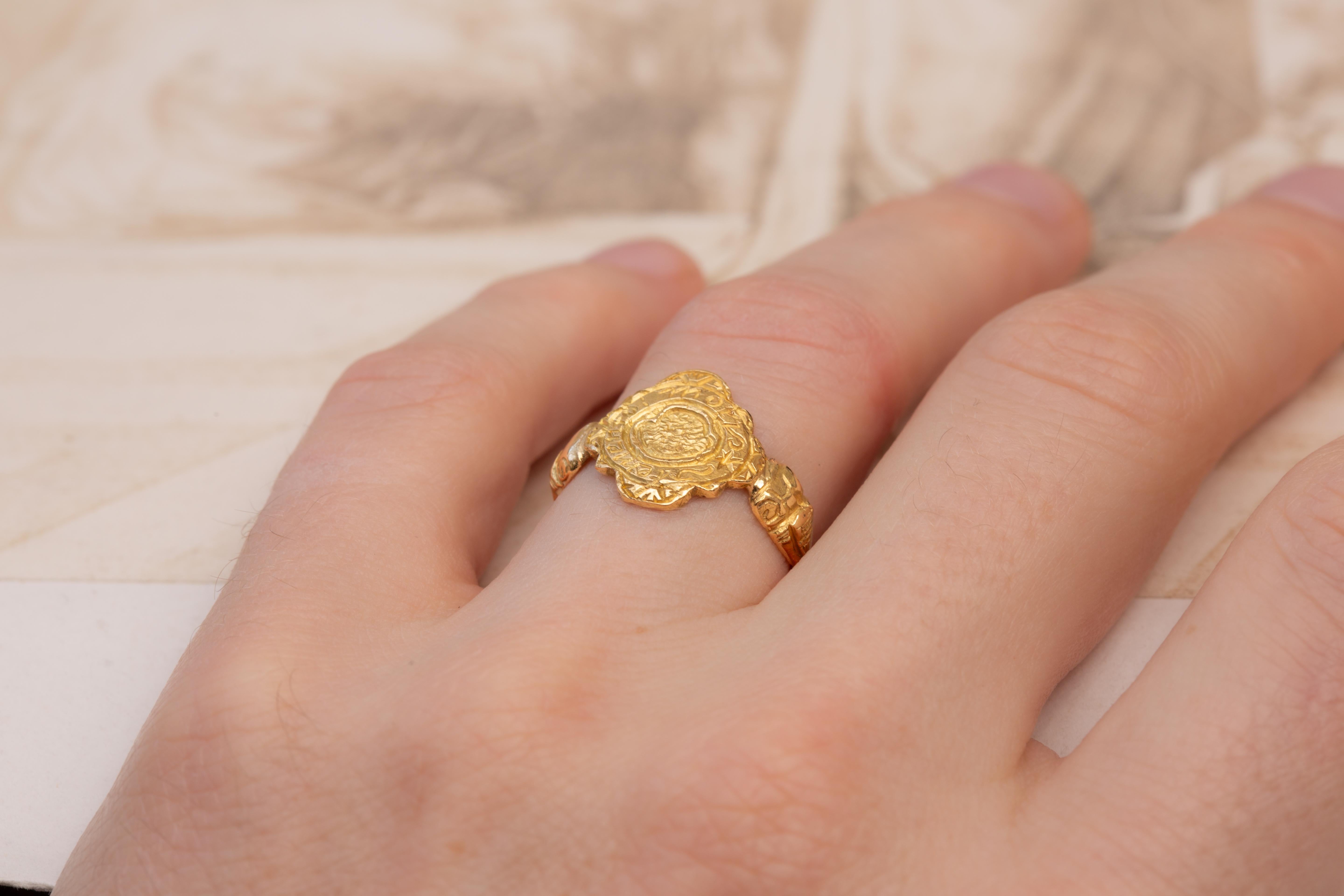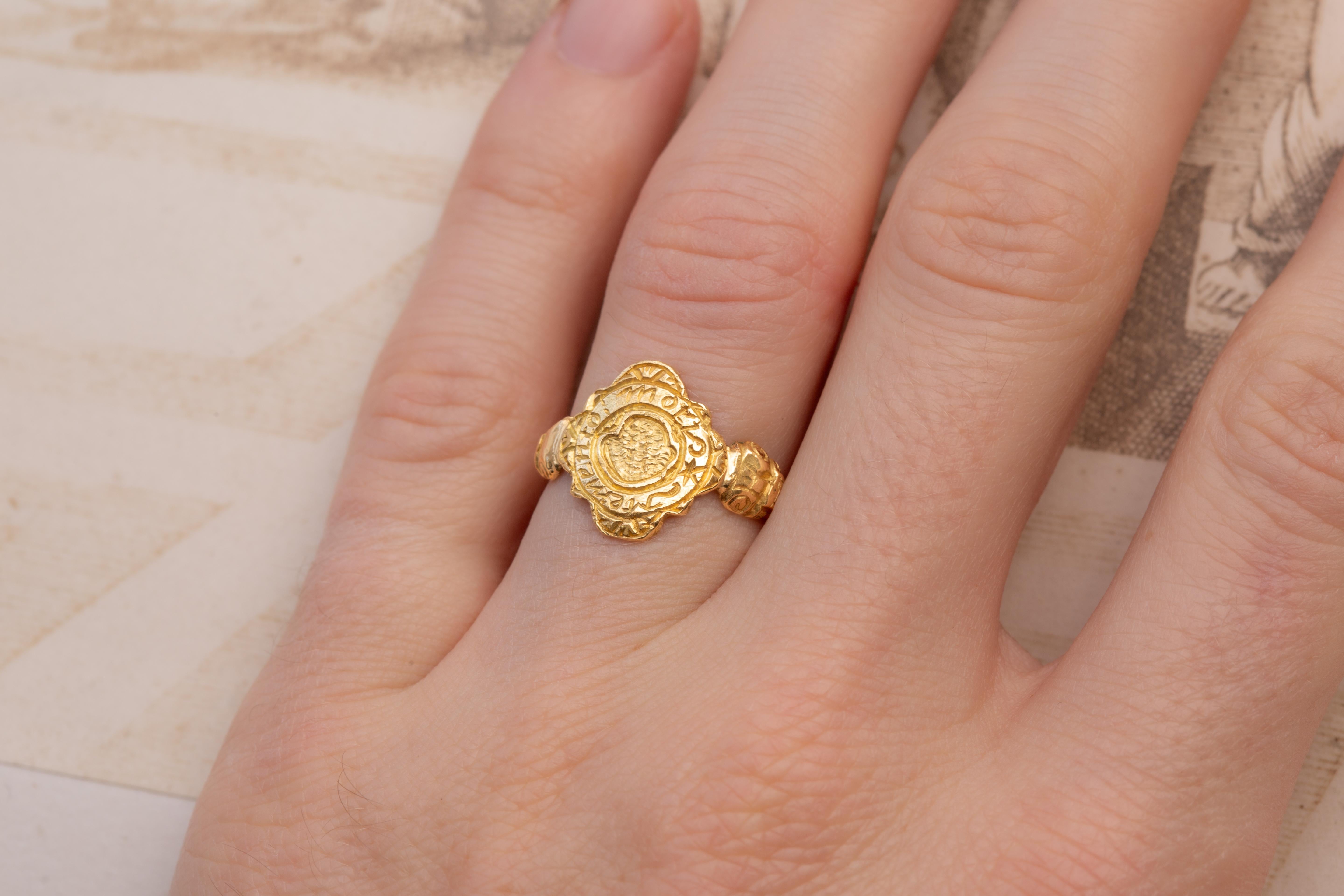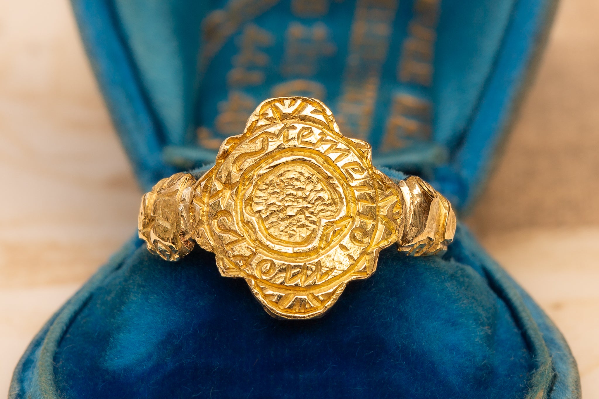 Crafted in high-karat gold (tests as 18K), the ring is formed with an engraved quatrefoil head centred by a skull; the surrounding border inscribed Memento Mori. The shoulders are decorated with finely cut scrollwork, characteristic of Tudor goldsmithing. Originally, the engraved lettering and skull would have been enriched with black and white enamel; traces are now lost through centuries of wear, as is typical for rings of this type. Comparable examples in the British museum demonstrate this original enamelled appearance.