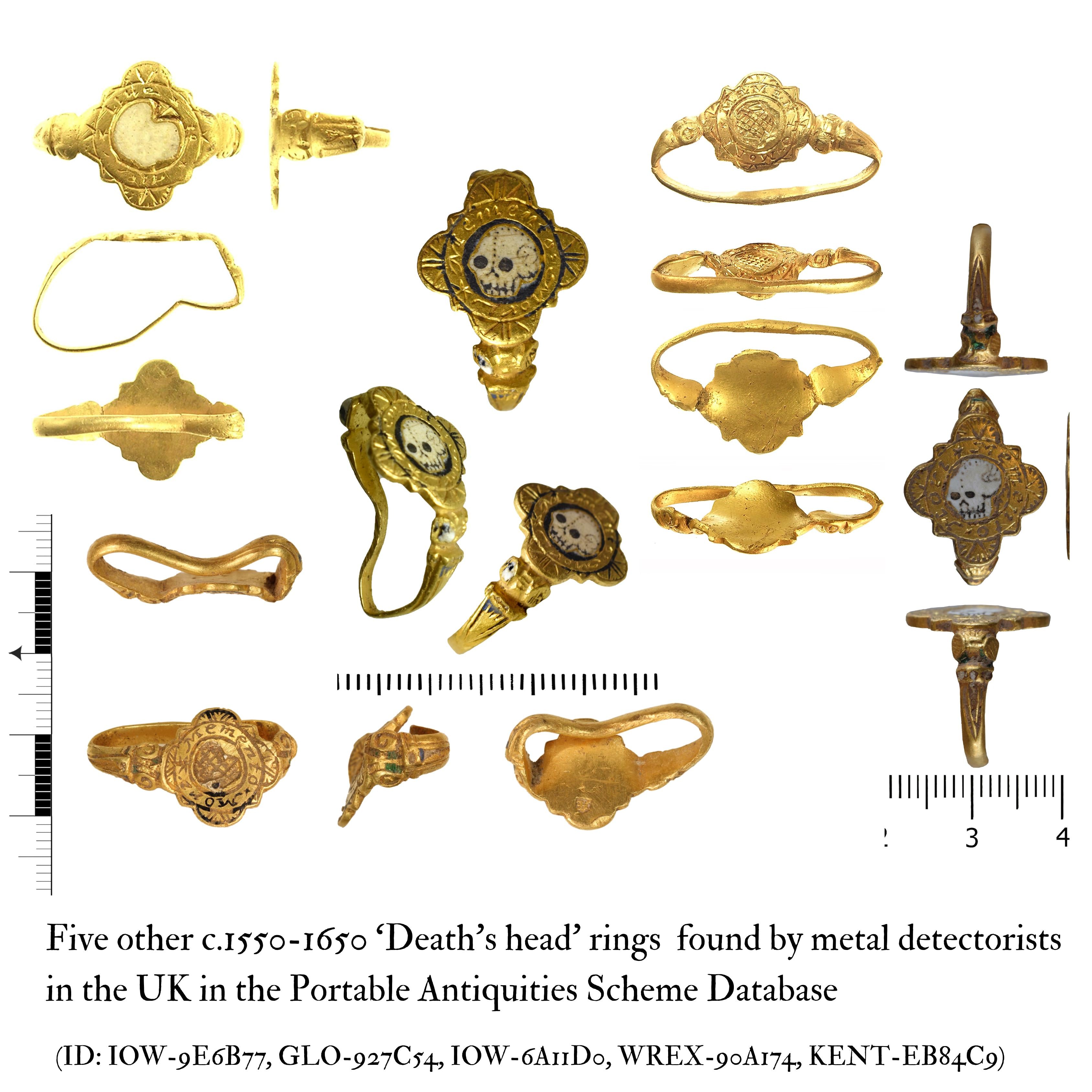 Closely related examples reside in the British Museum (accessions AF.1519–AF.1523), alongside further Tudor death’s head rings recorded as Treasure on the Portable Antiquities Scheme, including IOW-9E6B77, GLO-927C54, IOW-6A11D0, WREX-90A174, and KENT-EB84C9. One such discovery recently featured in BBC News and Smithsonian Magazine.