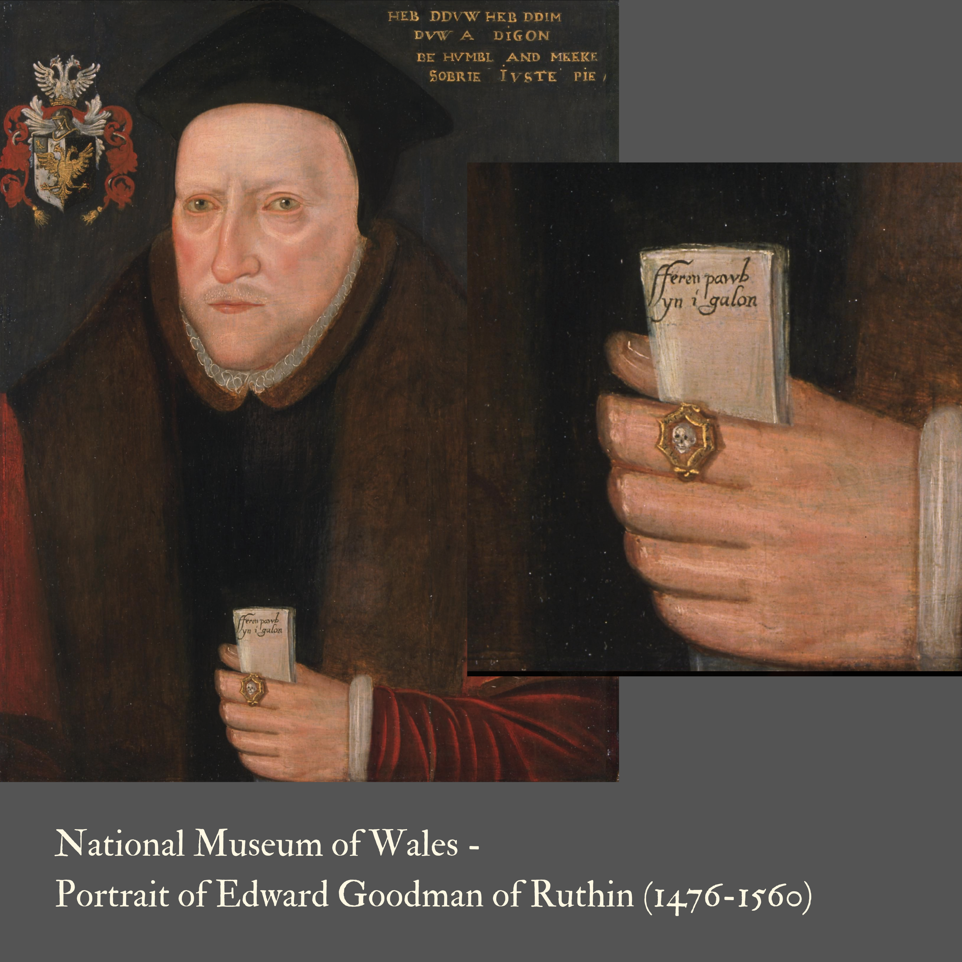Death’s head rings became especially popular in 16th-century England, serving as potent reminders of mortality and Christian humility. Documentary evidence records such rings among elite Tudor ownership; Catherine Parr’s jewel inventory of 1549 includes a death’s head ring, and Mary Finch’s 1557 bequest lists multiple examples. A comparable ring is visible in the portrait of Edward Goodman of Ruthin (1476–1560) in the National Museum of Wales.
