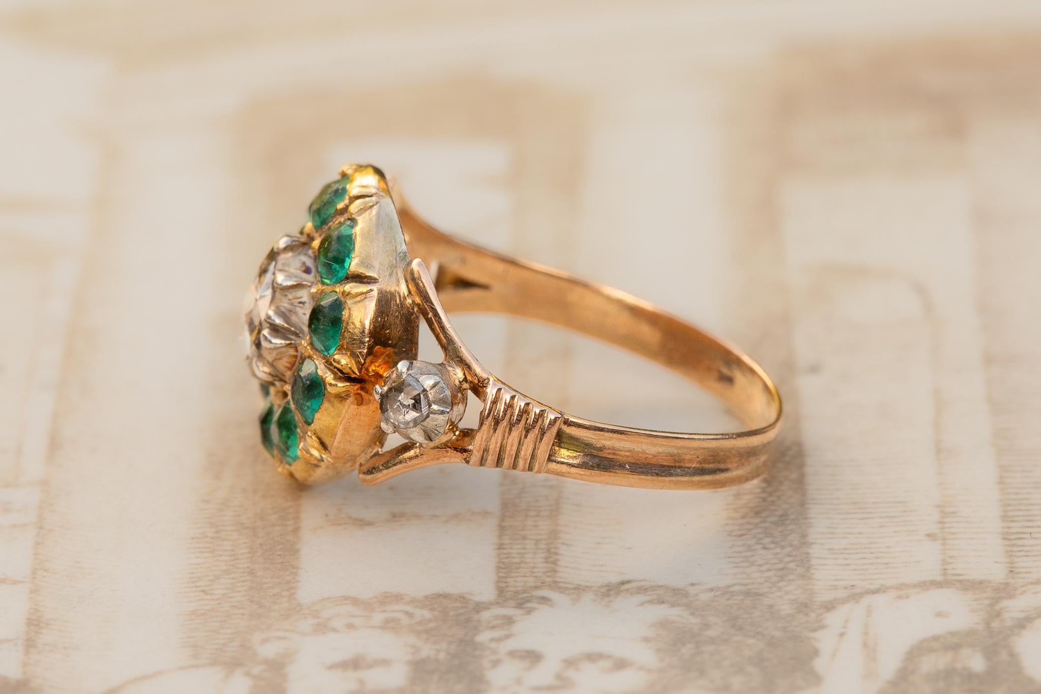 The ring is centred by a rose-cut diamond, set in silver to enhance its brightness, and surrounded by a halo of vivid green pastes.