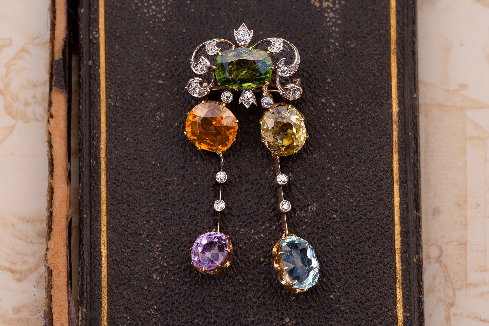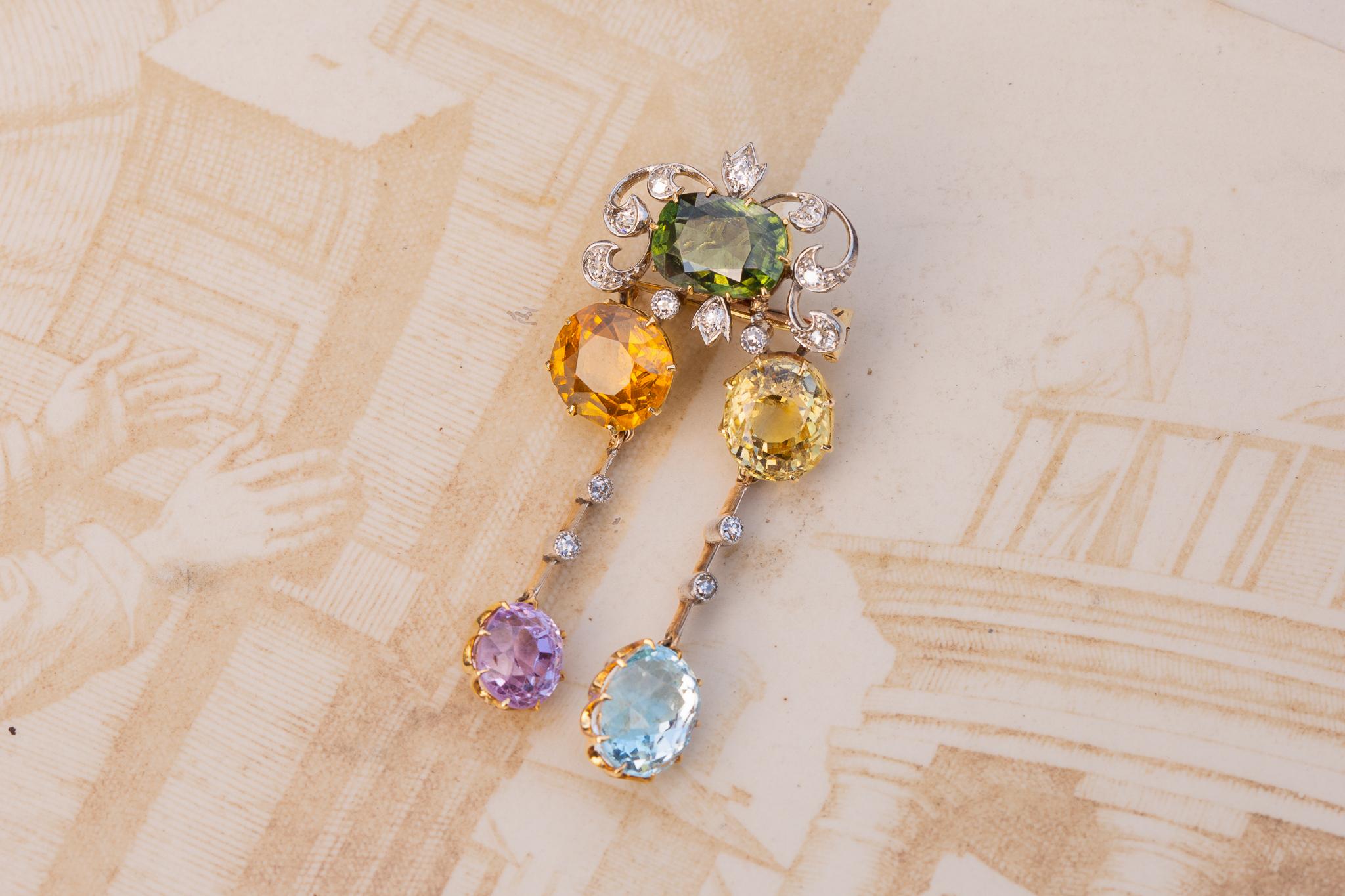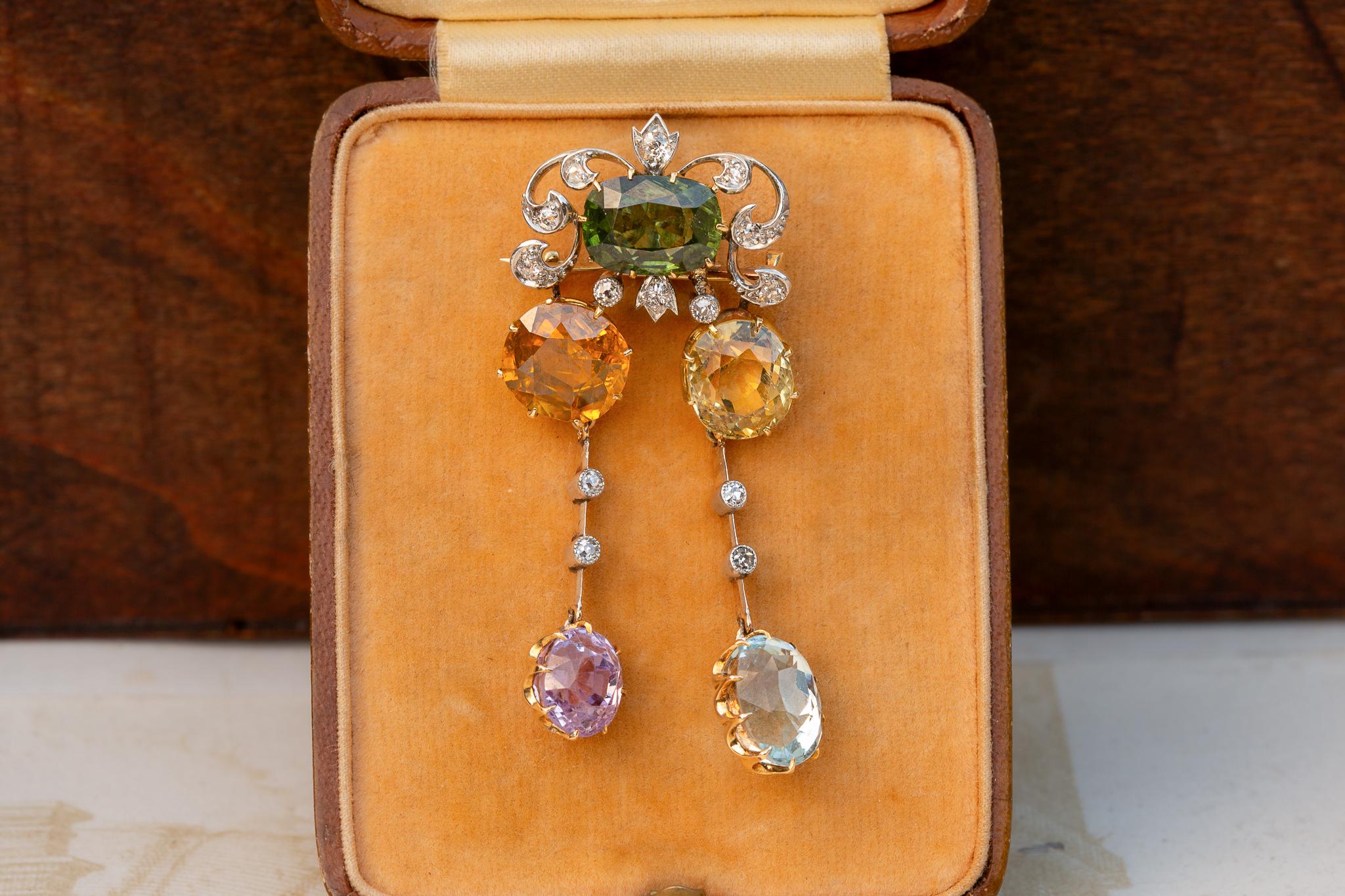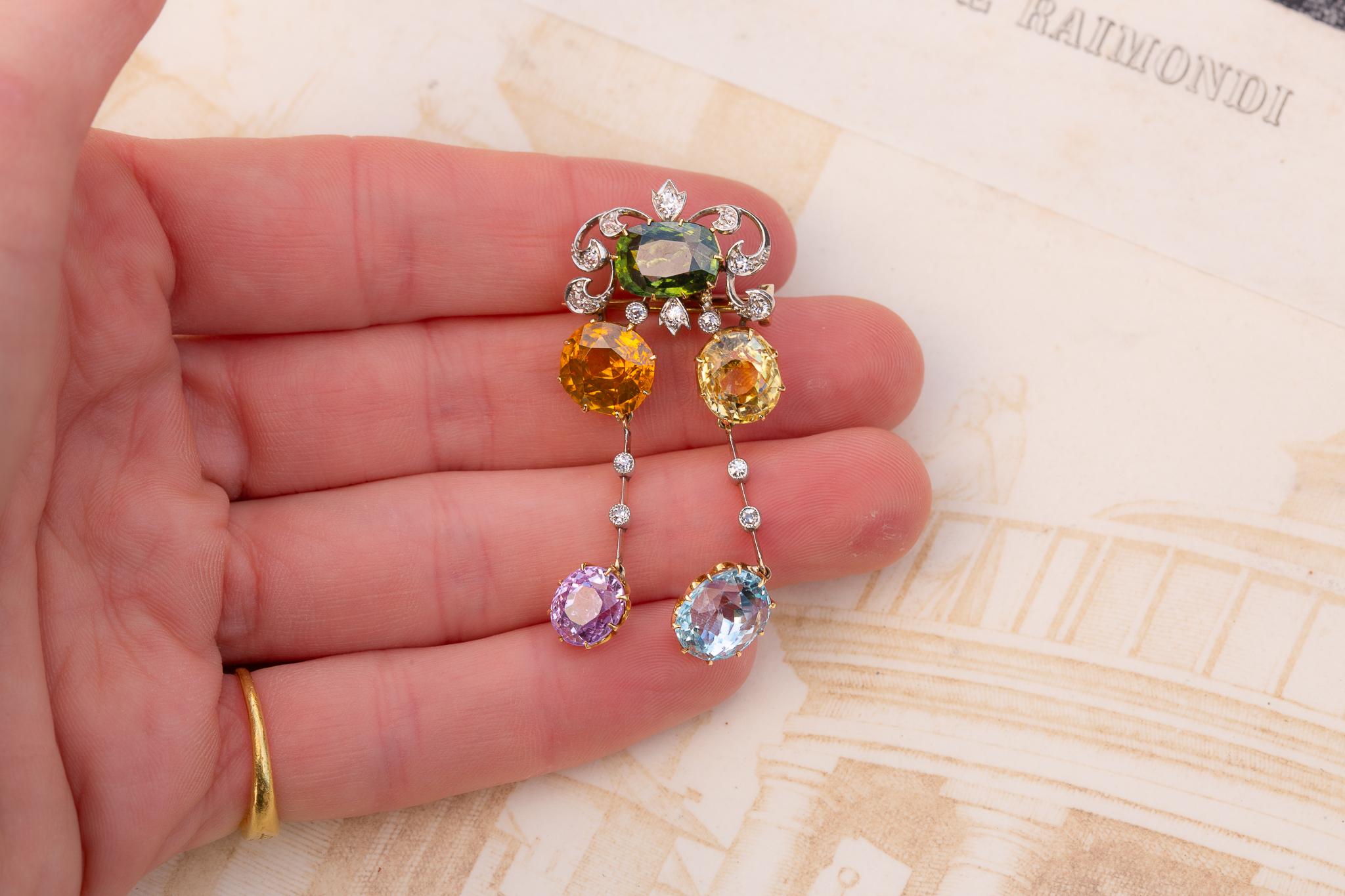 Crafted in 21K gold, with platinum settings to the diamonds, the jewel takes the form of a gem-set cluster framed by diamonds in an elegant scrolled openwork formation. Two articulated drops hang freely below, giving the piece life, movement and sparkle; it is a design that feels both playful and highly refined, perfectly in keeping with Edwardian taste.