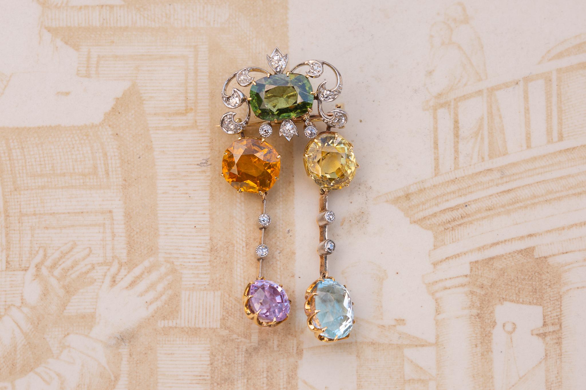 Jewels of this type are often referred to as “Harlequin” jewels; the name derives from the vividly coloured chequered costume of the Harlequin character of the Commedia dell’Arte tradition, popularised in the late 16th century. In jewellery, the term has long been used to describe pieces set with an array of different coloured gemstones, and it saw particular favour in the 19th and early 20th centuries.