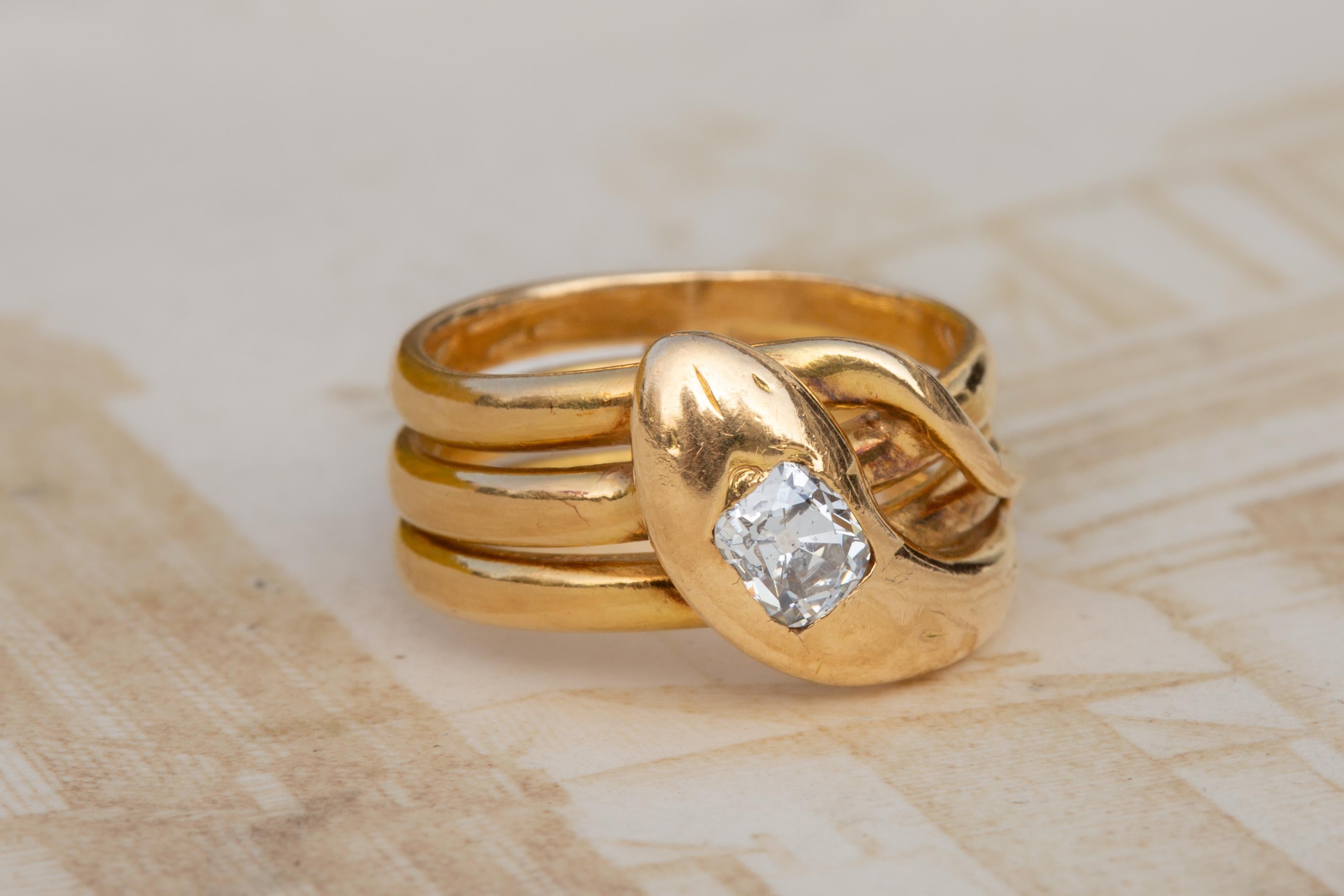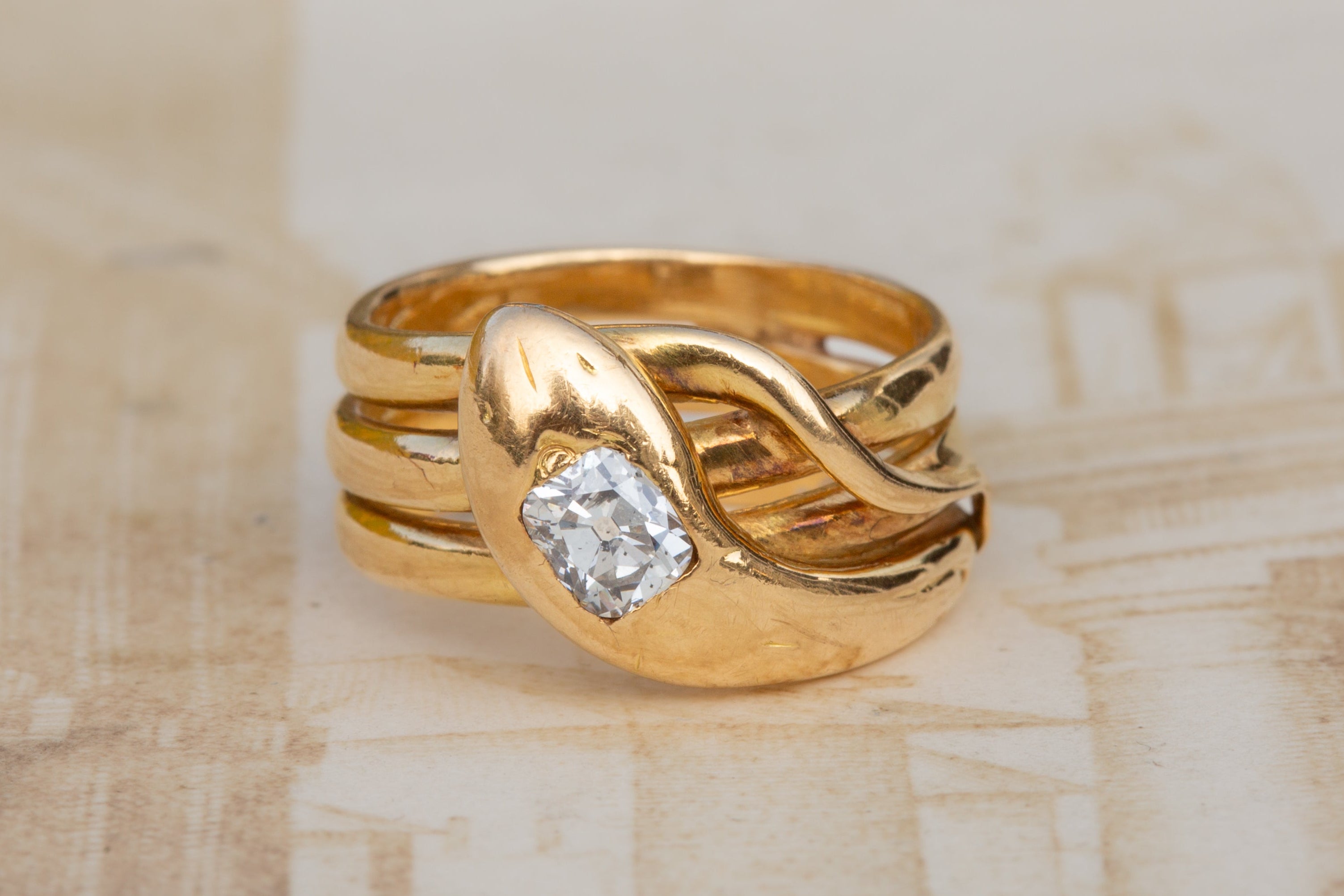The snake’s head is set with an antique squared cushion-cut diamond of approximately 0.35 carats, often referred to in period descriptions as the snake’s diamond ‘brain’ due to its placement and softly domed, organic faceting. The stone is securely set and sits naturally within the head. The diamond is particularly bright and has a lovely clarity, gorgeous antique facets and a well sized open culet.