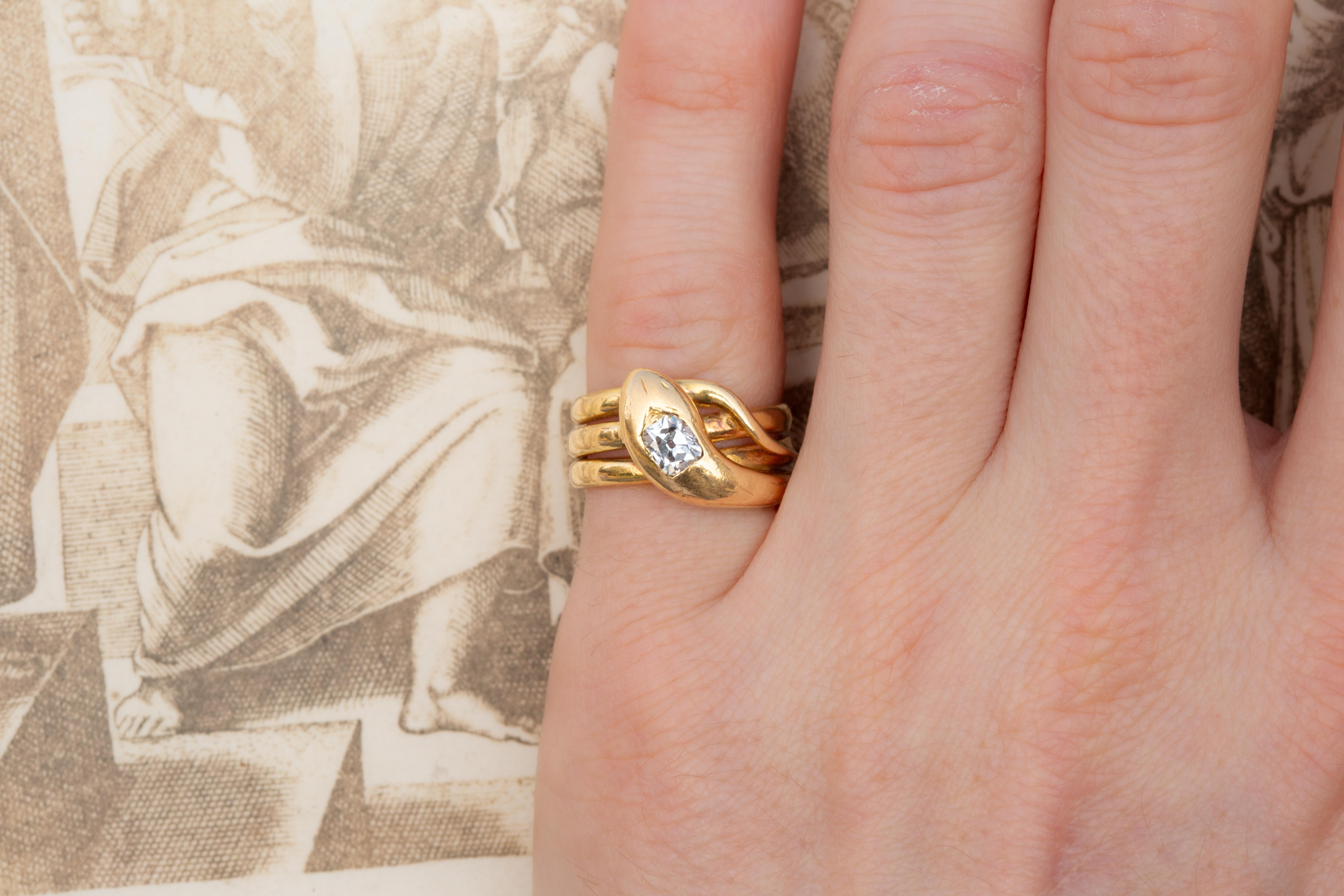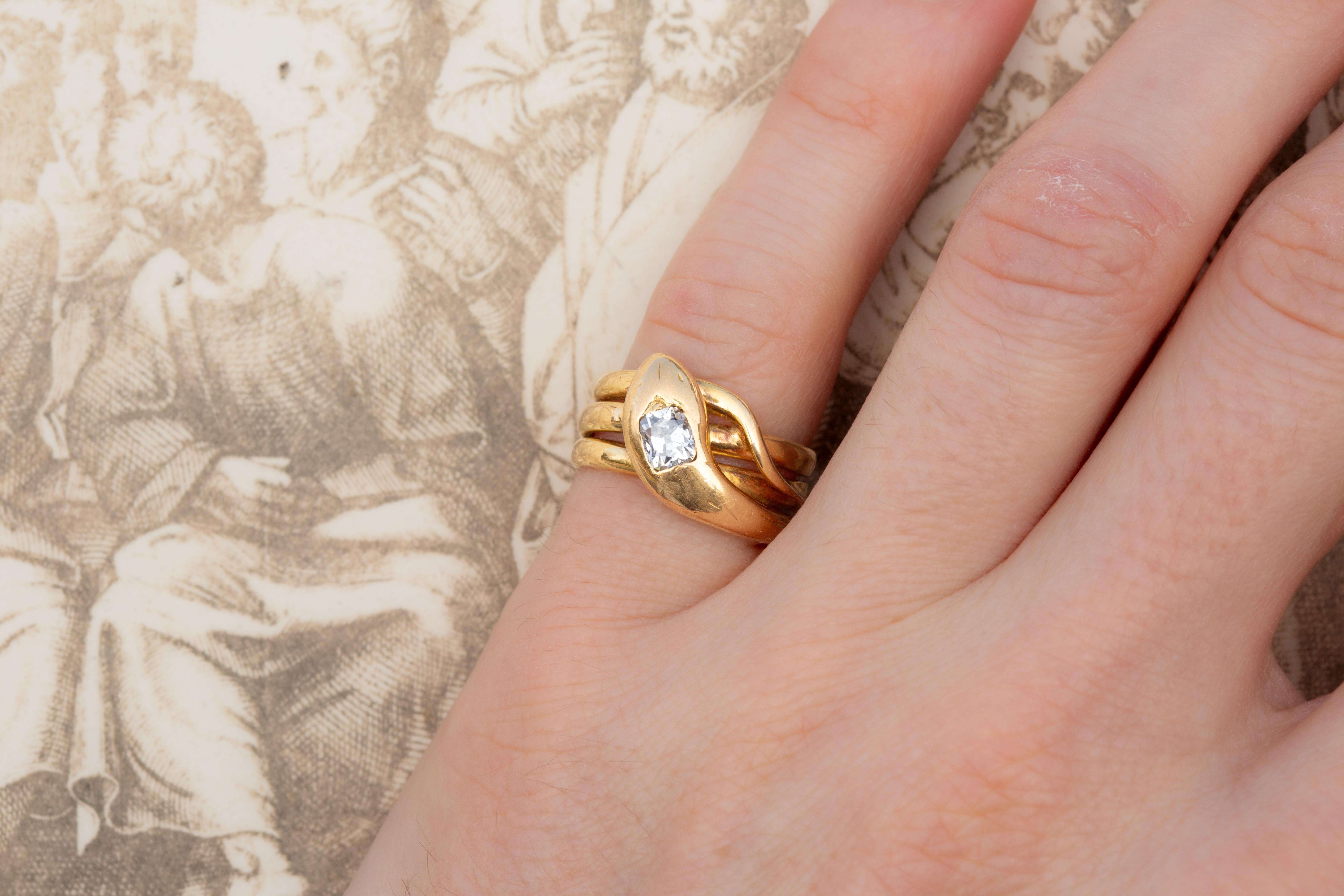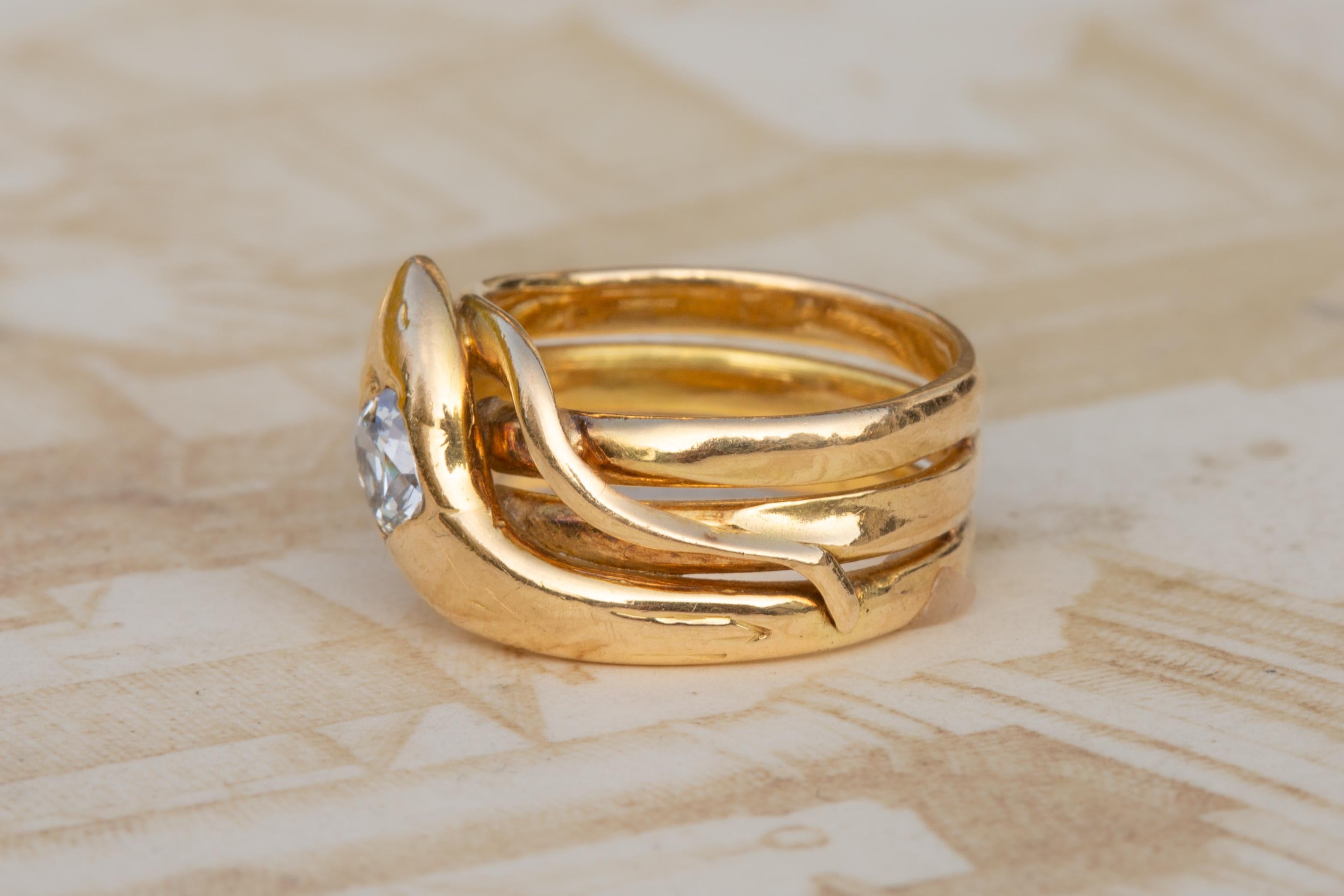 A superb antique snake ring, made in France circa 1870, and crafted in solid 18K gold. The serpent coils fluidly around the finger,