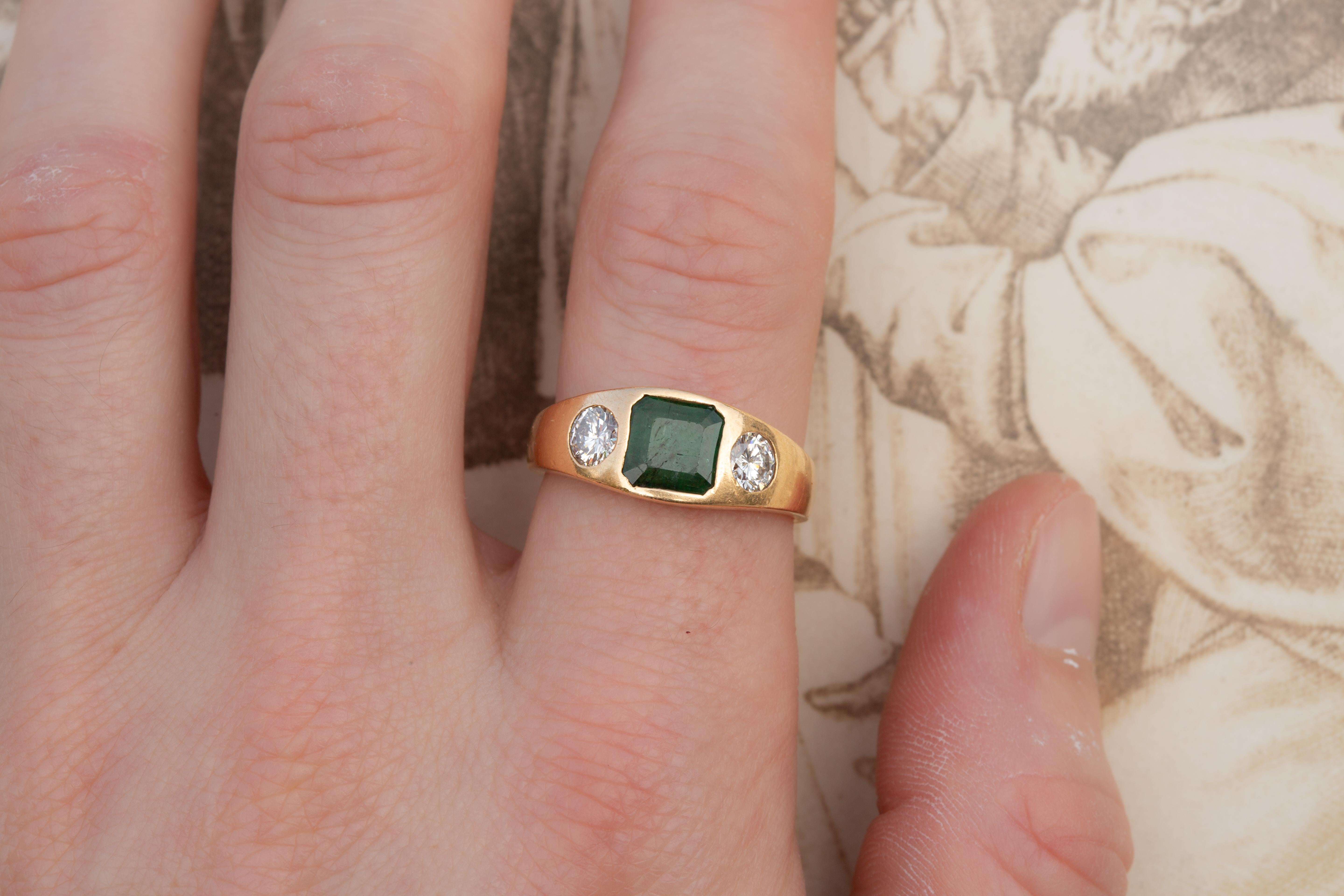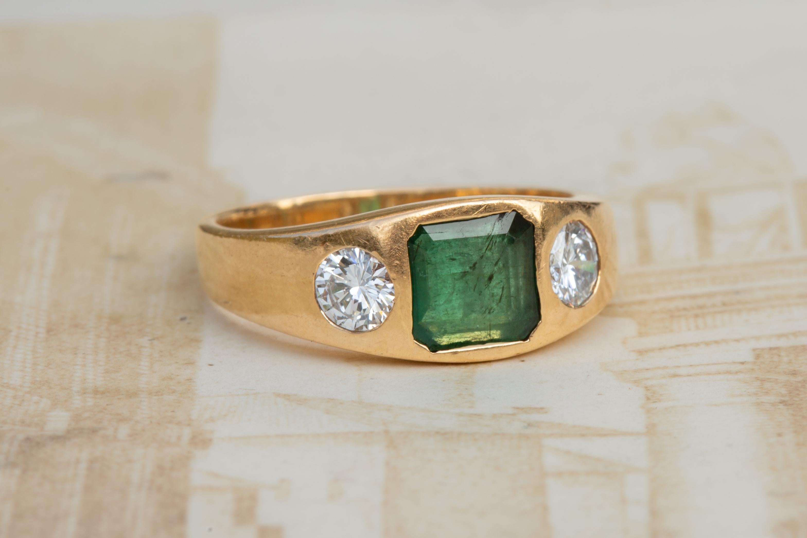 The ring is set with a deep green step-cut emerald weighing approximately 2 carats, flanked by two bright round brilliant cut diamonds of around 0.25ct each, totalling approximately 0.50ct. All three stones are bezel set and open-backed, allowing light to pass through the stones.