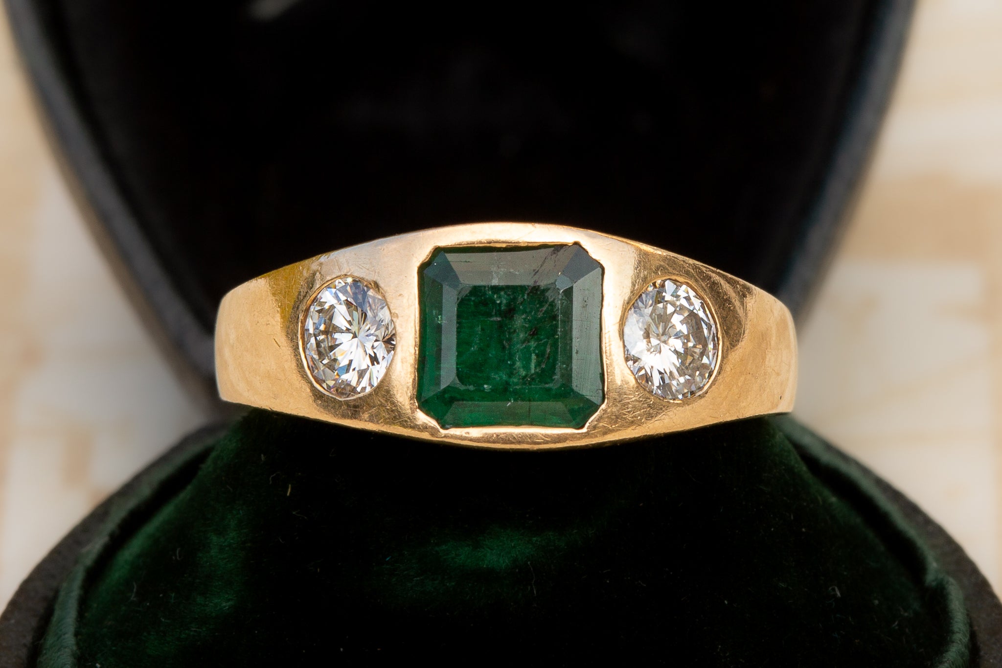 Crafted in 18K gold, the ring has a pleasingly solid construction with a substantial band. The stones are sunk cleanly into the gold, creating the smooth, architectural profile characteristic of German and Austrian three-stone rings of the early 20th century.