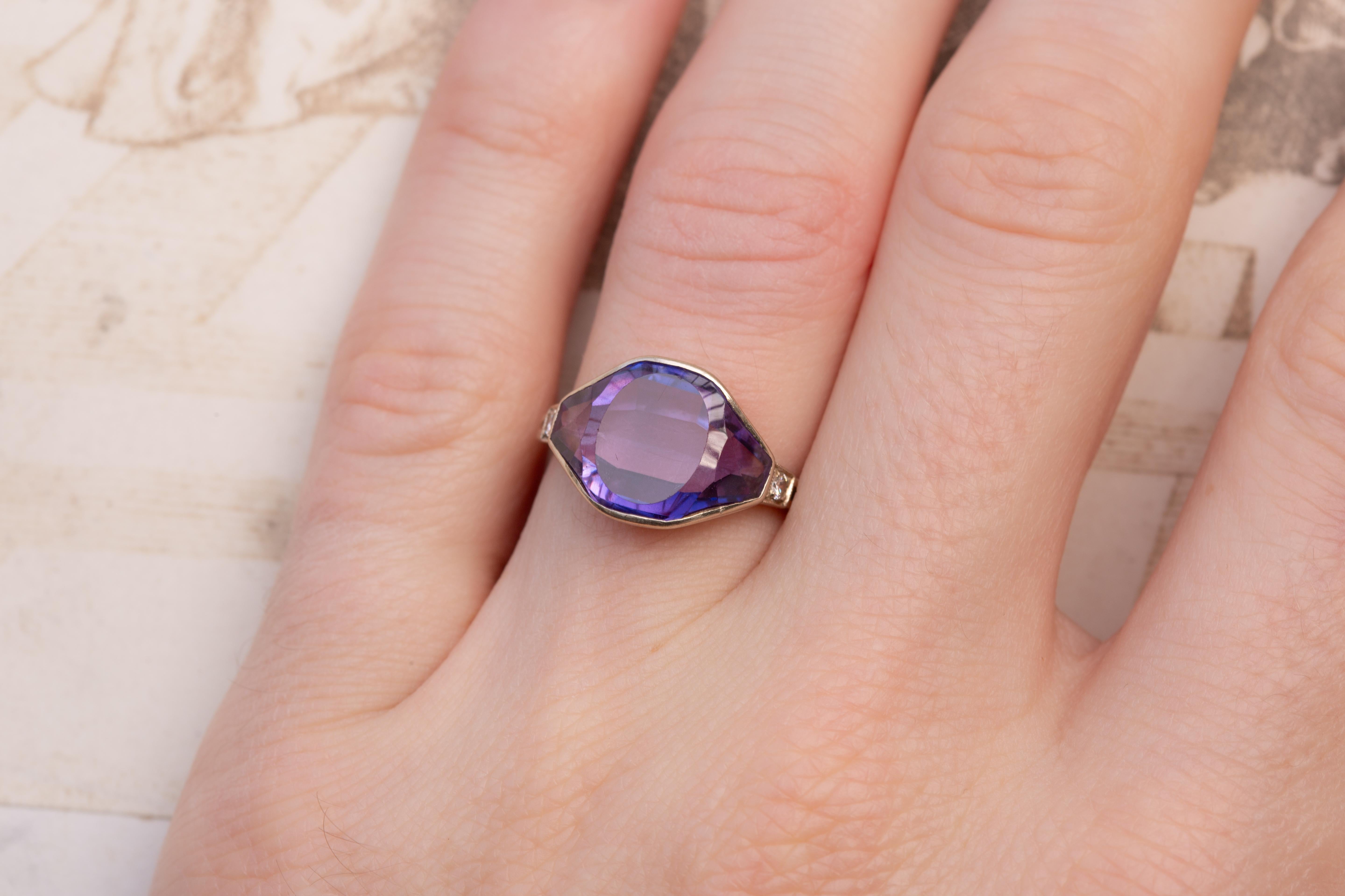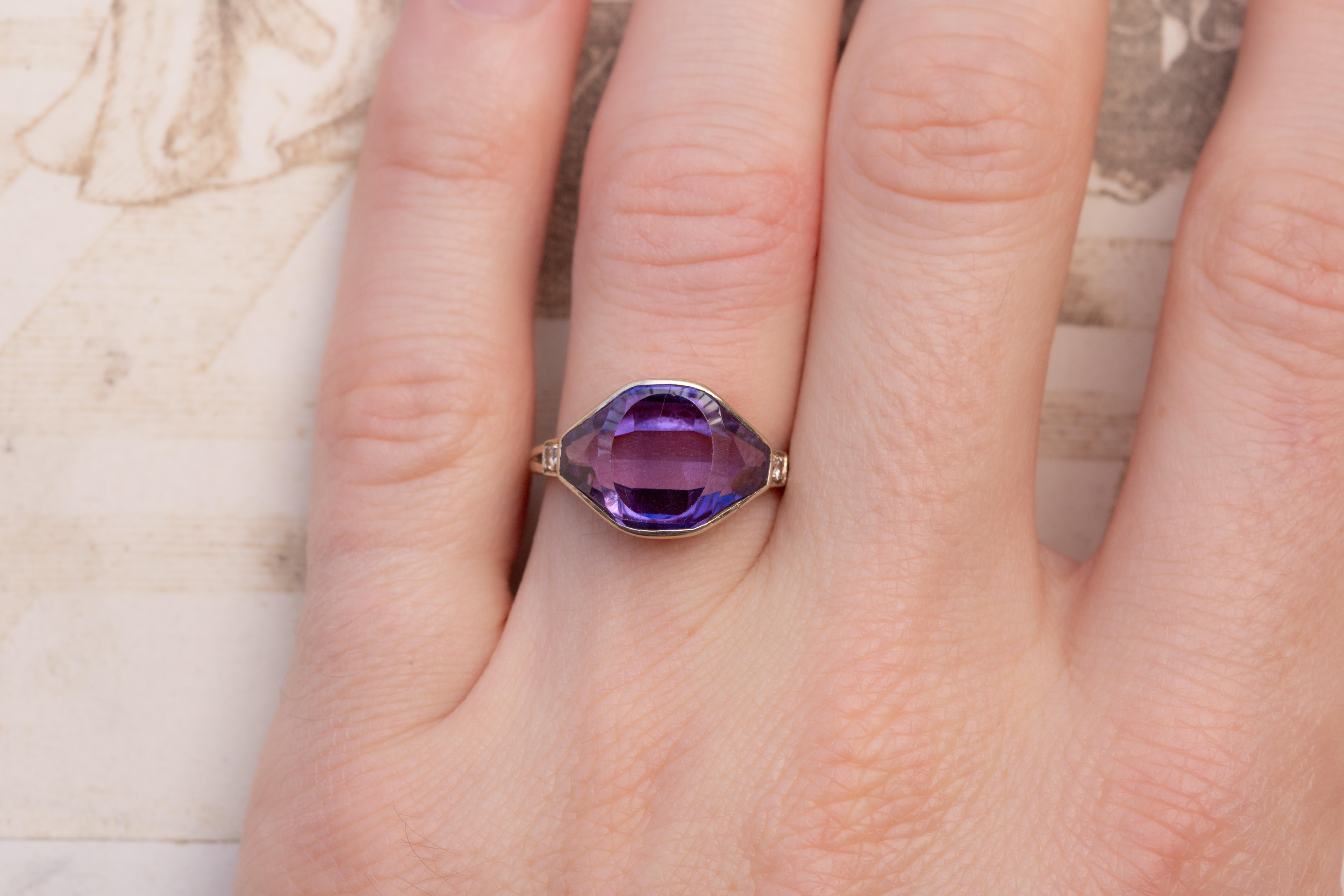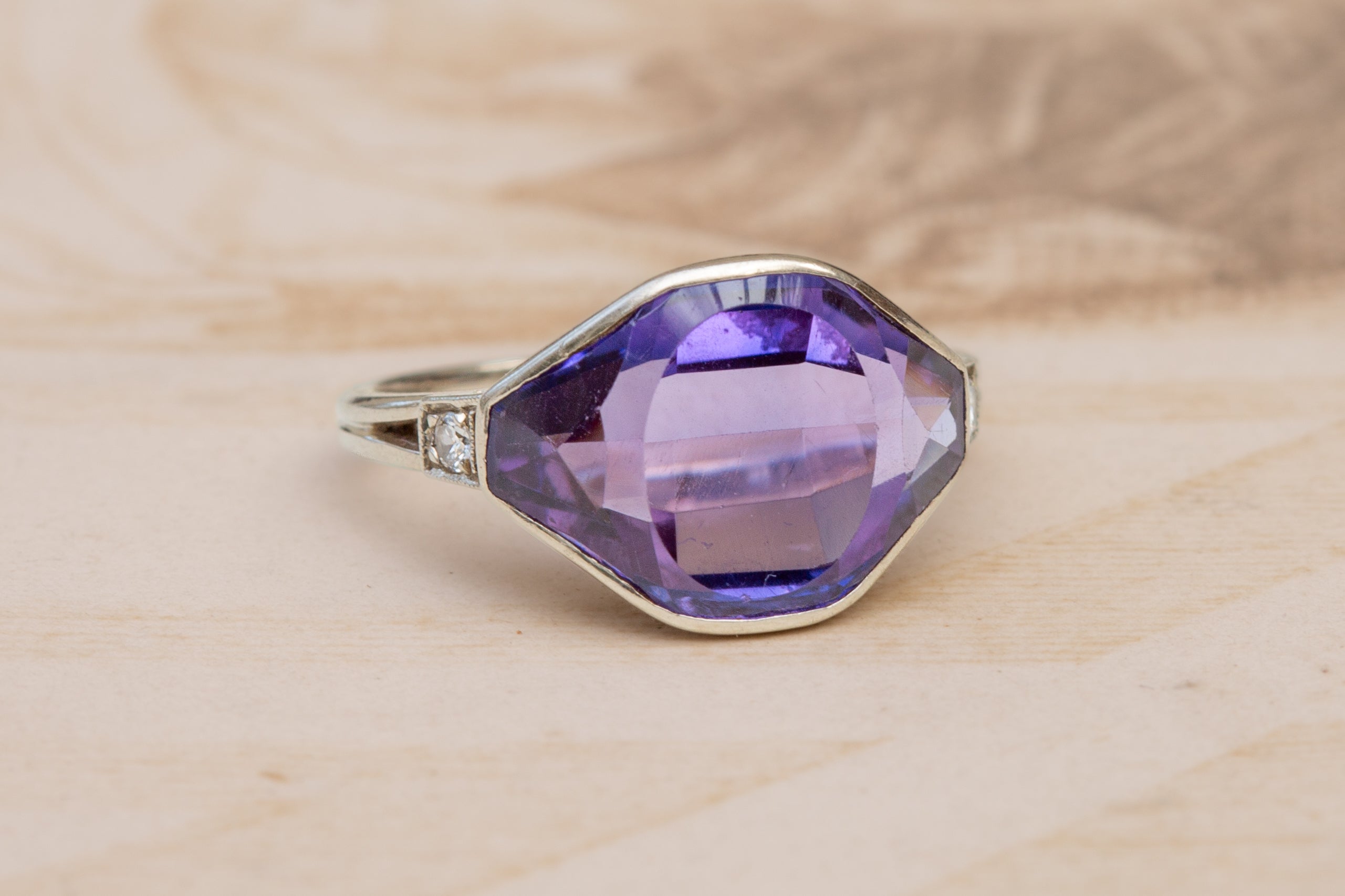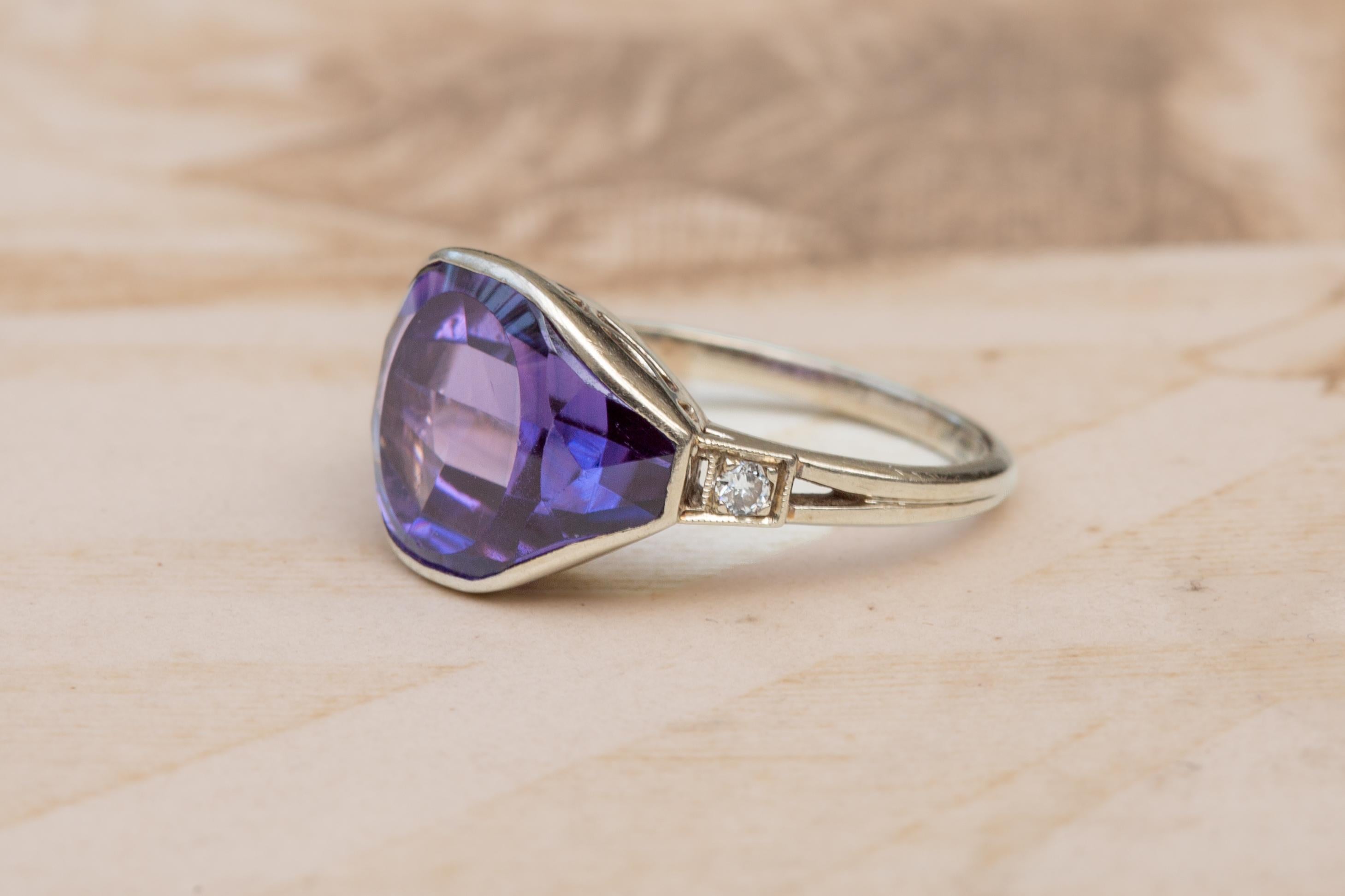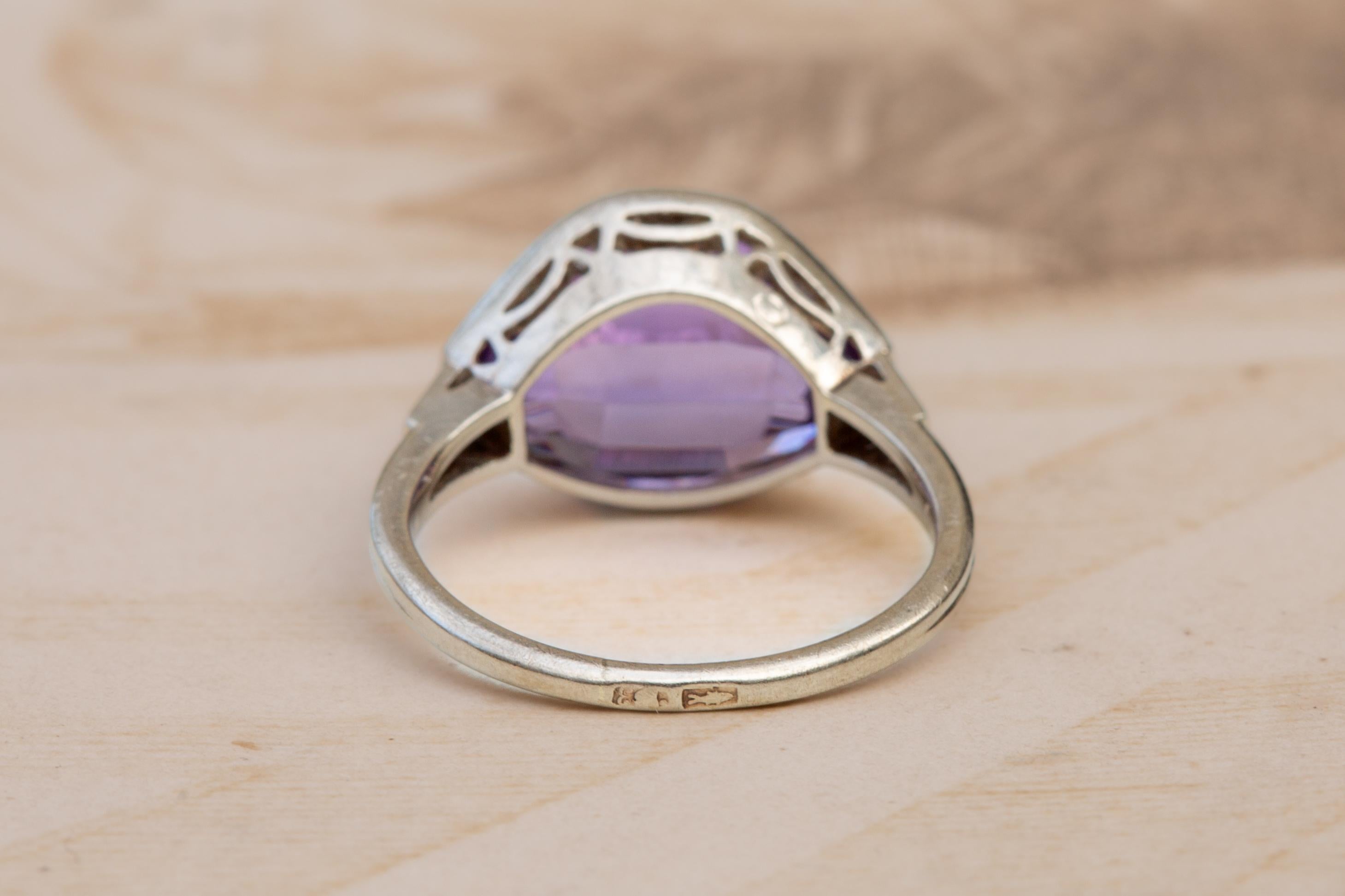 A striking and highly unusual Art Deco ring made in Poland during the 1920’s; a period marked by bold experimentation in jewellery design as Poland regained independence after 123 years of partitions. The re-establishment of a national goldsmithing tradition created a brief but remarkable flowering of artistic production; pieces from this era often show exceptional craftsmanship in small workshops, made for an emerging modern, urban clientele. This ring is a perfect example of such refined, individualistic work.At its centre sits an extraordinary amethyst of approx 6cts, cut in a highly uncommon angular, shield-like faceted shape; this distinctive geometry is very much in keeping with the avant-garde tendencies of the mid-1920s, when jewellers embraced sharp lines and architectural silhouettes. The gemstone displays a cool, saturated purple with excellent clarity, and is held in a smooth white-gold bezel that frames the stone beautifully.The shoulders are set with small round diamonds in millegrain-beaded settings; a classic detail of the period that adds precision and sparkle without interrupting the bold central form. The gallery is wonderfully open and architectural; again, characteristic of the Art Deco period and intended to maximise the play of light through the amethyst.Hallmarked with the Polish knight’s head and the number 3, indicating 583 fineness (14K white gold) used between 1920–1931; the maker’s mark depicts a fish.A rare and elegant jewel; the unusual gemstone cut, combined with its clear Art Deco lines and Polish origin, make it a particularly special survivor from this short, fascinating era of design.The ring measures UK size L½ ; US size 6. It has a weight of 4.2 grams.A rare and beautifully crafted Art Deco ring; unusually cut, historically interesting, and visually arresting.