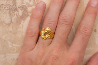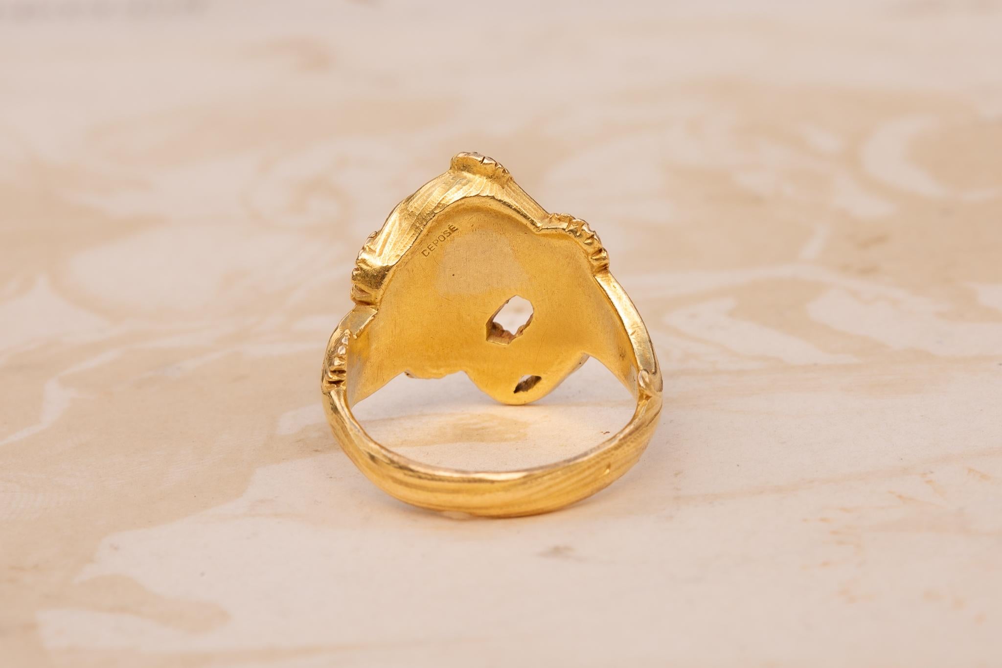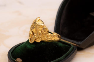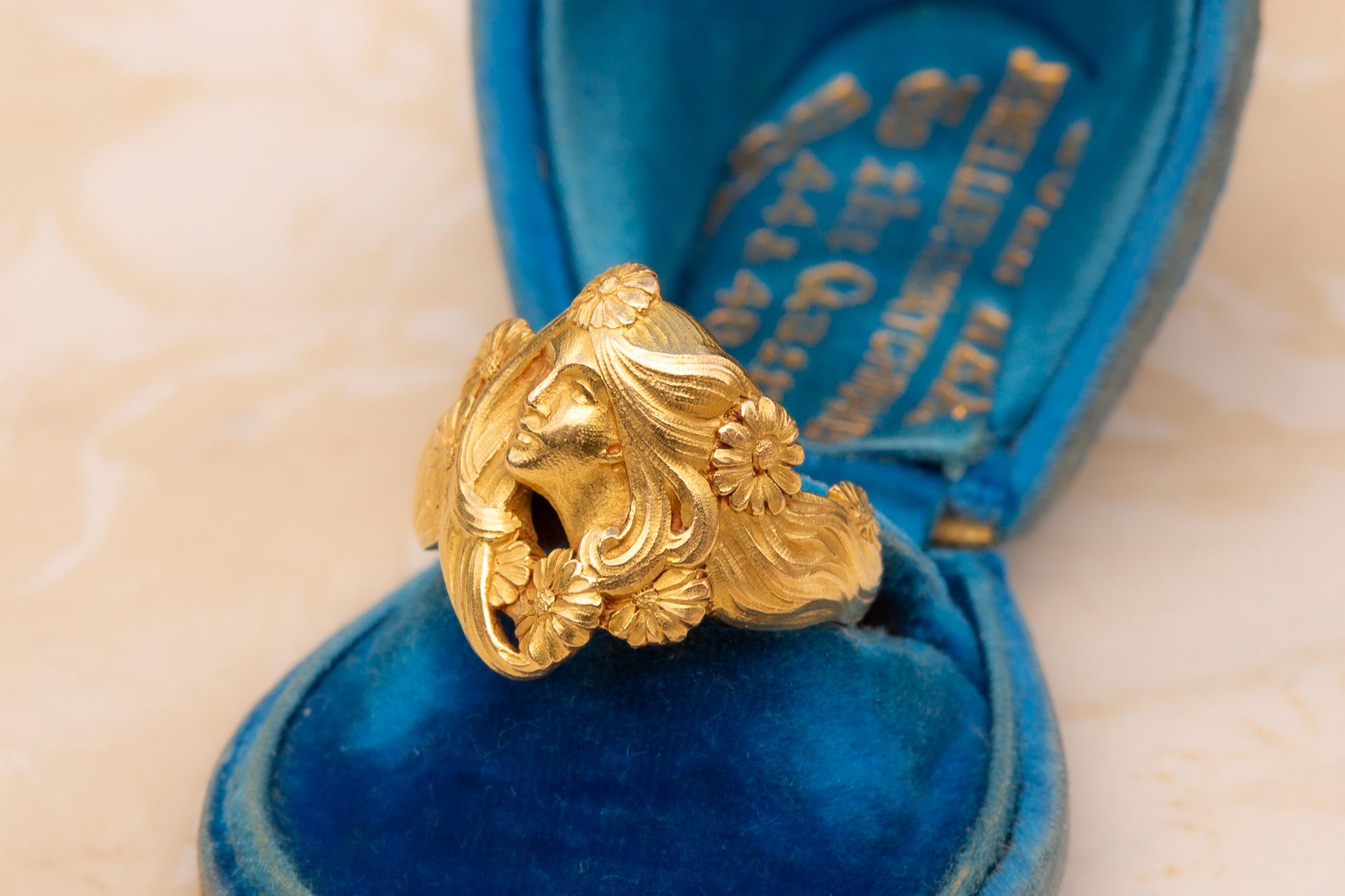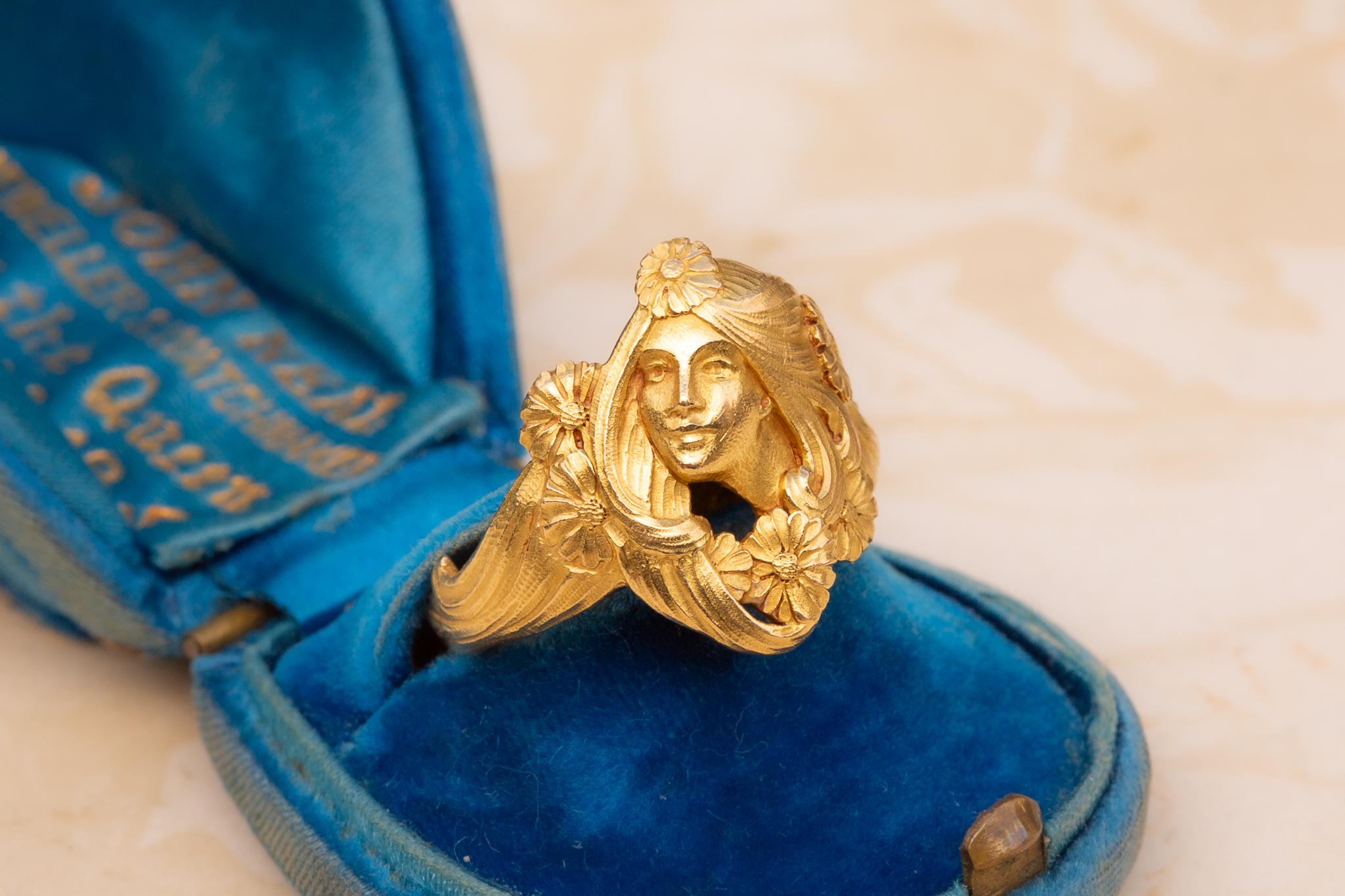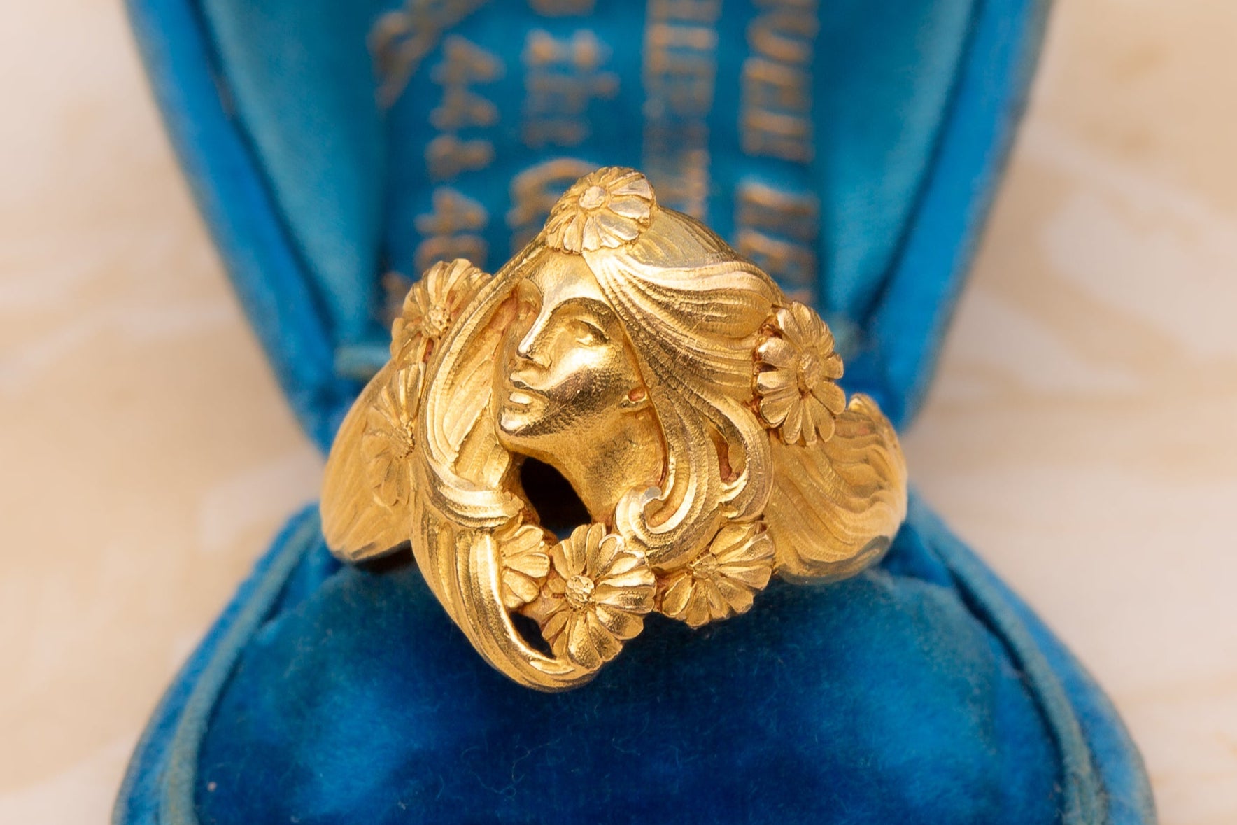 • This exceptional antique French ring is a sculptural embodiment of the Art Nouveau aesthetic, crafted in 18K gold and dating to around 1900. The intricately hand-engraved design centres on a serene female figure with flowing hair and daisy-like blossoms - a classic motif of the movement. The ring is marked with a French 18K gold hallmark and carries the stamp Déposé, denoting a registered or patented design.