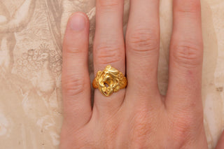 Stylistically, the ring reflects the influence of artists like Alphonse Mucha, whose sensual, elongated muses came to define the Art Nouveau vision of femininity. The figure’s features are subtly expressive, her hair sweeping dramatically around the shank to form a fully sculptural surround. Every element has been crisply hand-engraved with fine detail and a soft, matte texture typical of French goldwork of the period.