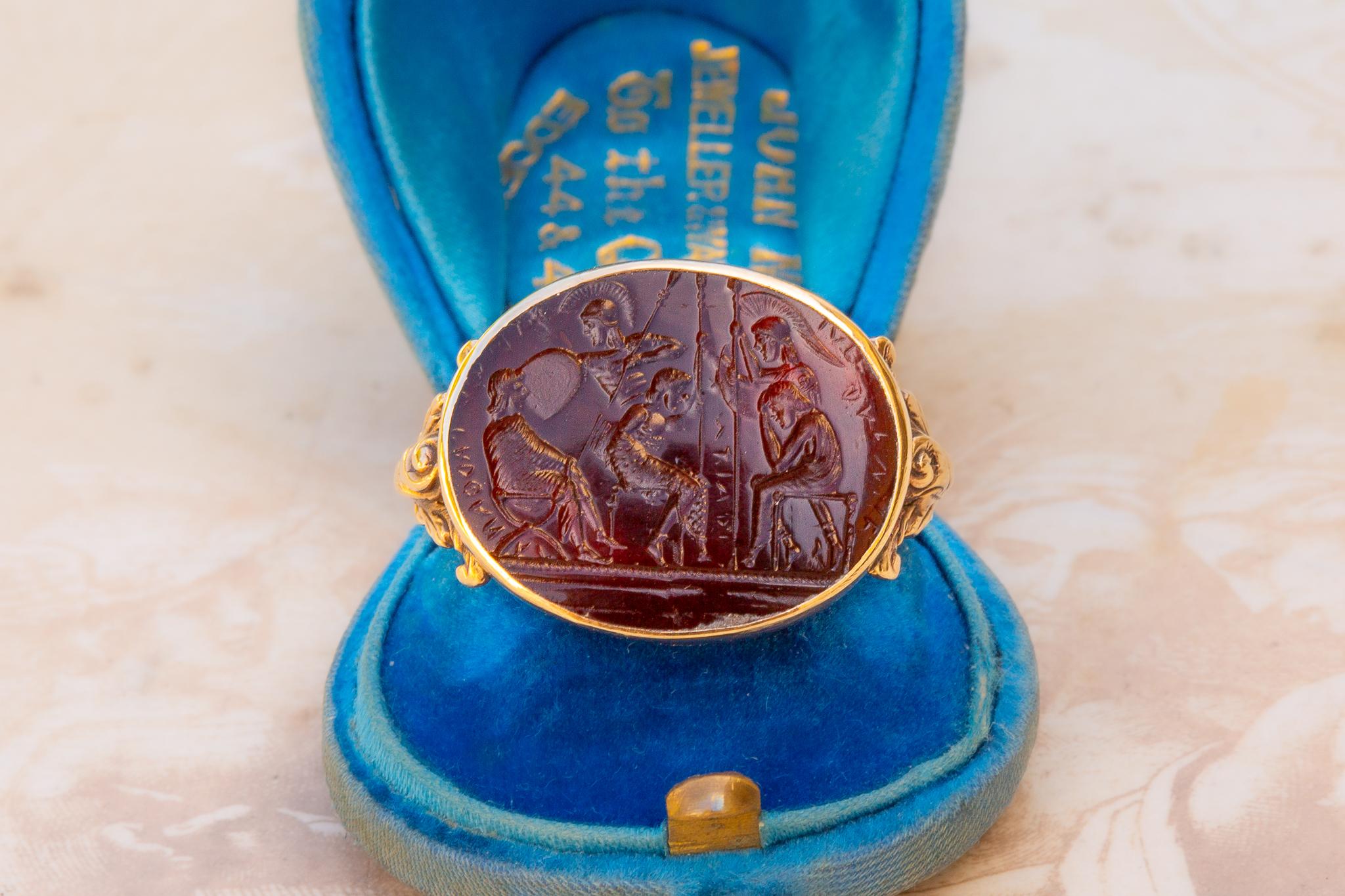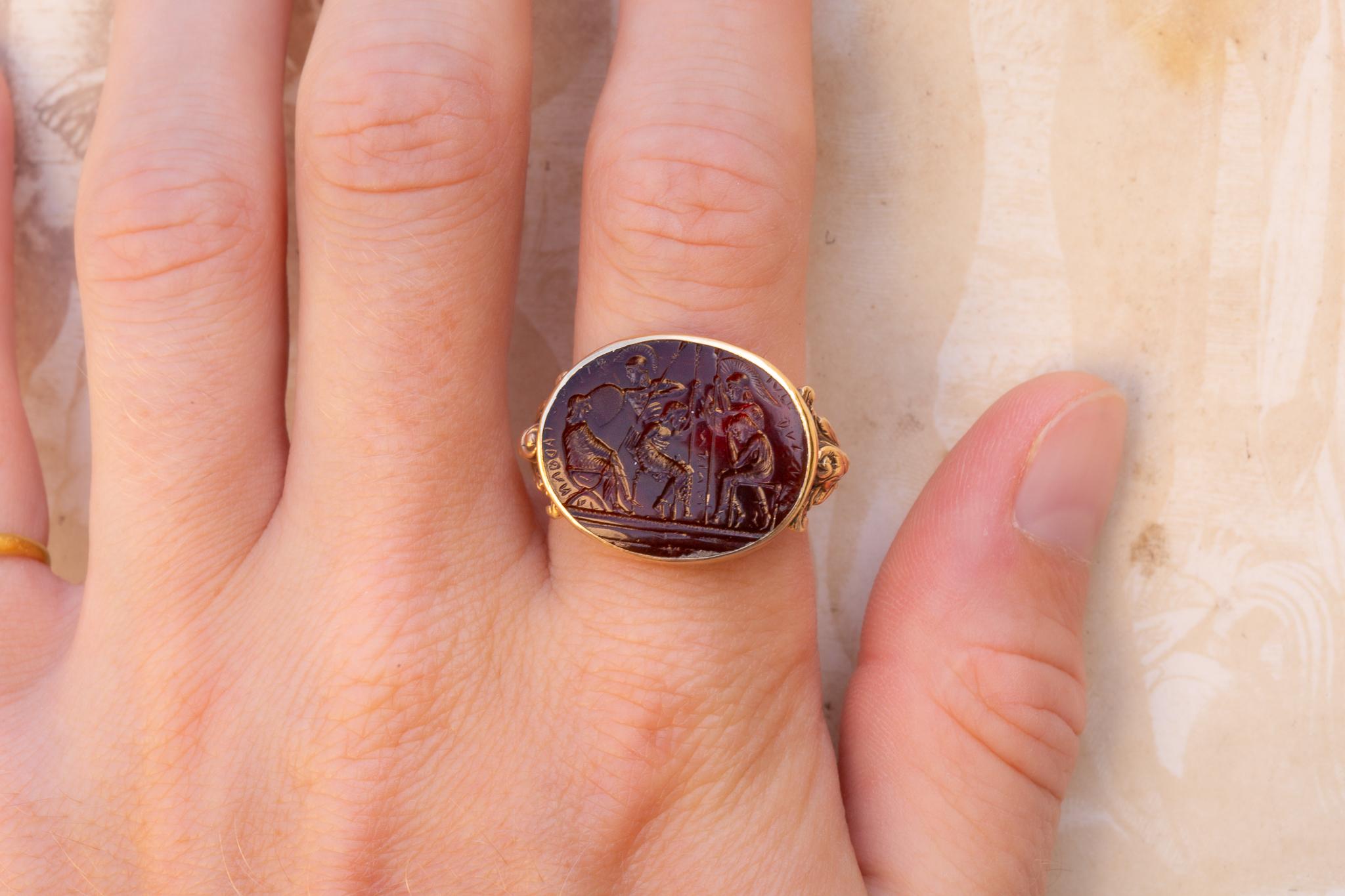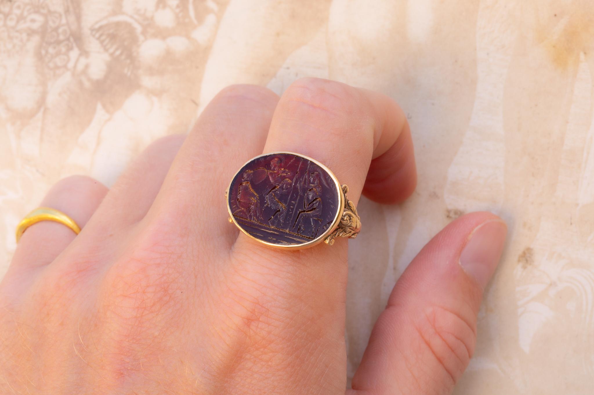 The intaglio is housed in a gold frame and later mounted onto a 9K gold ring hoop in the Regency revival style. Hallmarks indicate the mount was added in 1986 by maker EJ.