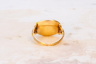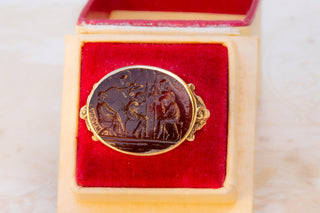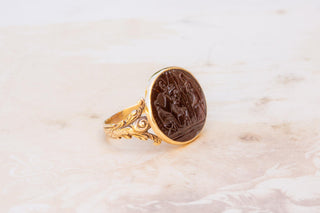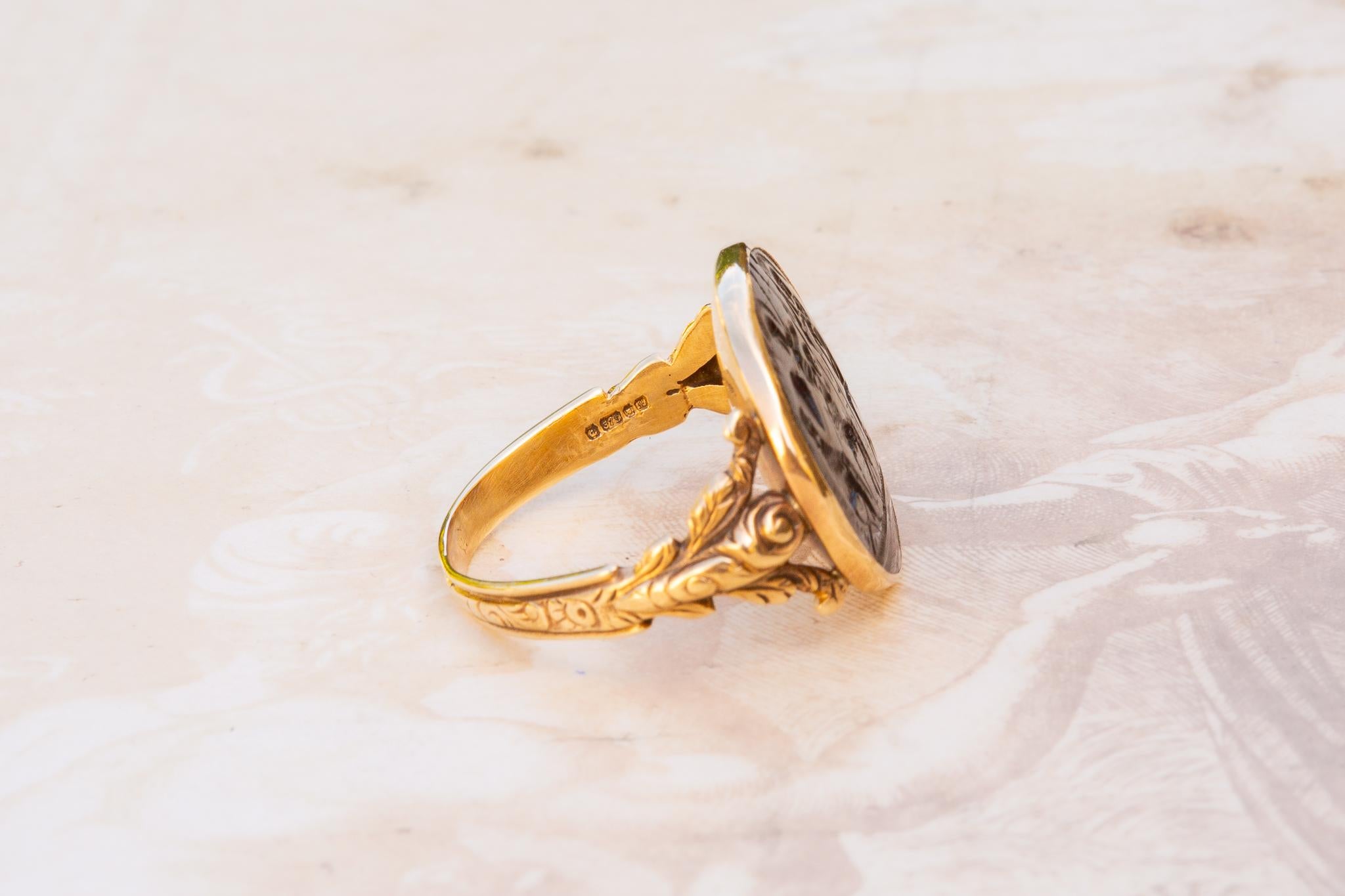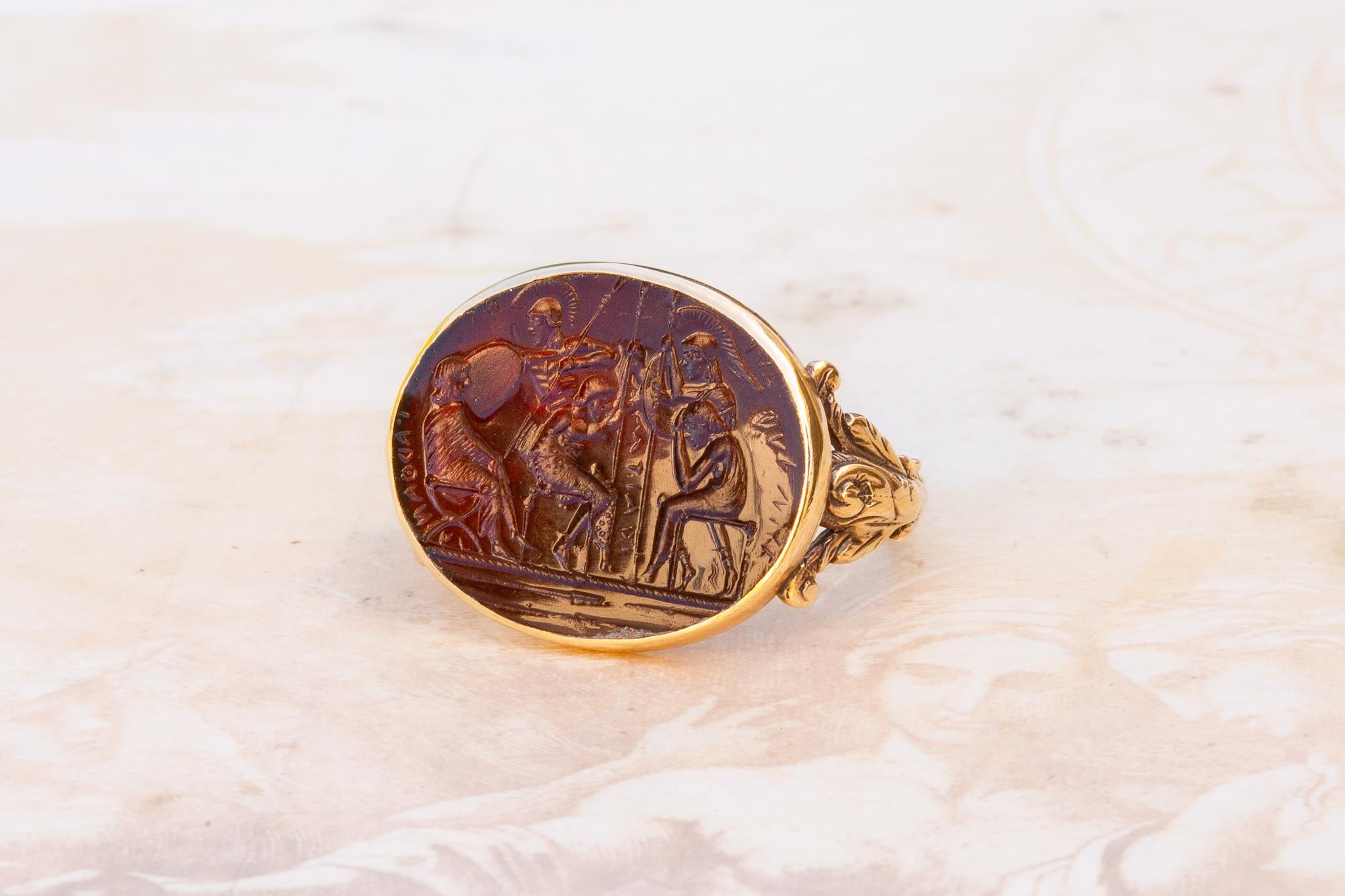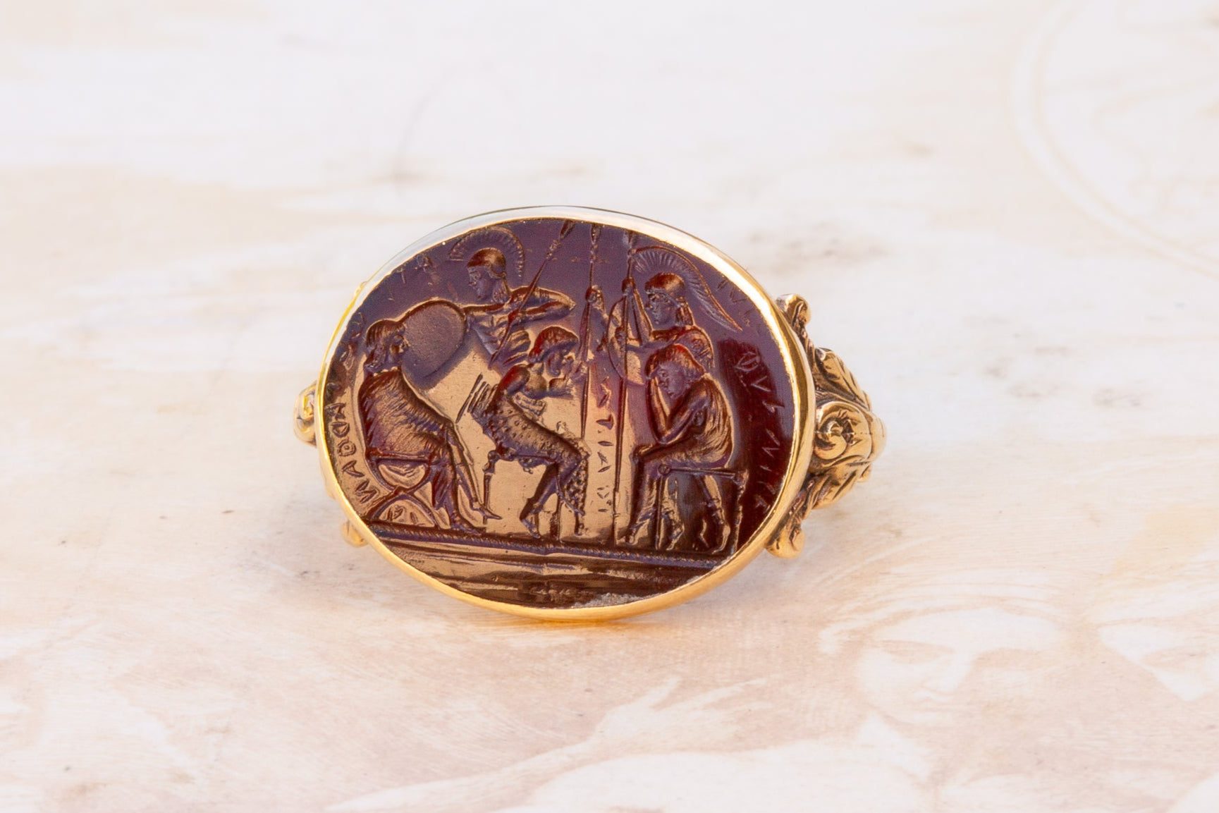 The intaglio is housed in a gold frame and later mounted onto a 9K gold ring hoop in the Regency revival style. Hallmarks indicate the mount was added in 1986 by maker EJ.
