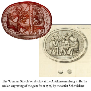The intaglio itself was made using glass paste, a method developed to mimic classical gems in both form and colour. It reproduces, with remarkable fidelity, the famed 'Gemma Stosch' carnelian scarab - today housed in the Antikensammlung Museum in Berlin - which depicts five warriors from the Seven Against Thebes legend. The original gem was discovered near Perugia before 1742 and entered the collection of Baron Philipp von Stosch in 1755 as a gift from Count Vicenzio Ansidei. It gained fame through its appearance on the frontispieces of Winckelmann’s Art History (1764) and Guarnacci’s Origini Italiche (1767), and through a 1756 engraving by the artist Schweickart, distributed widely among classical scholars and collectors.