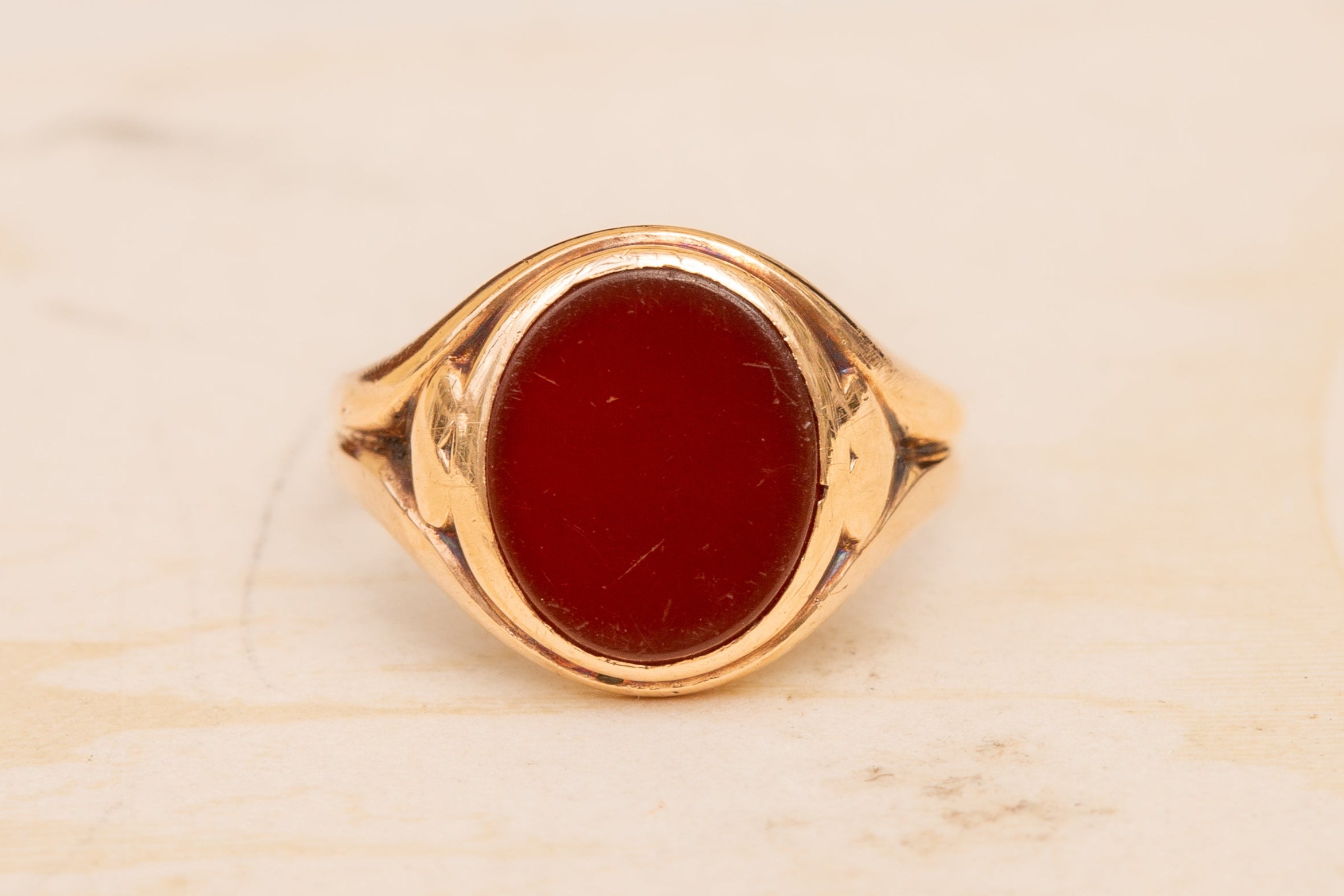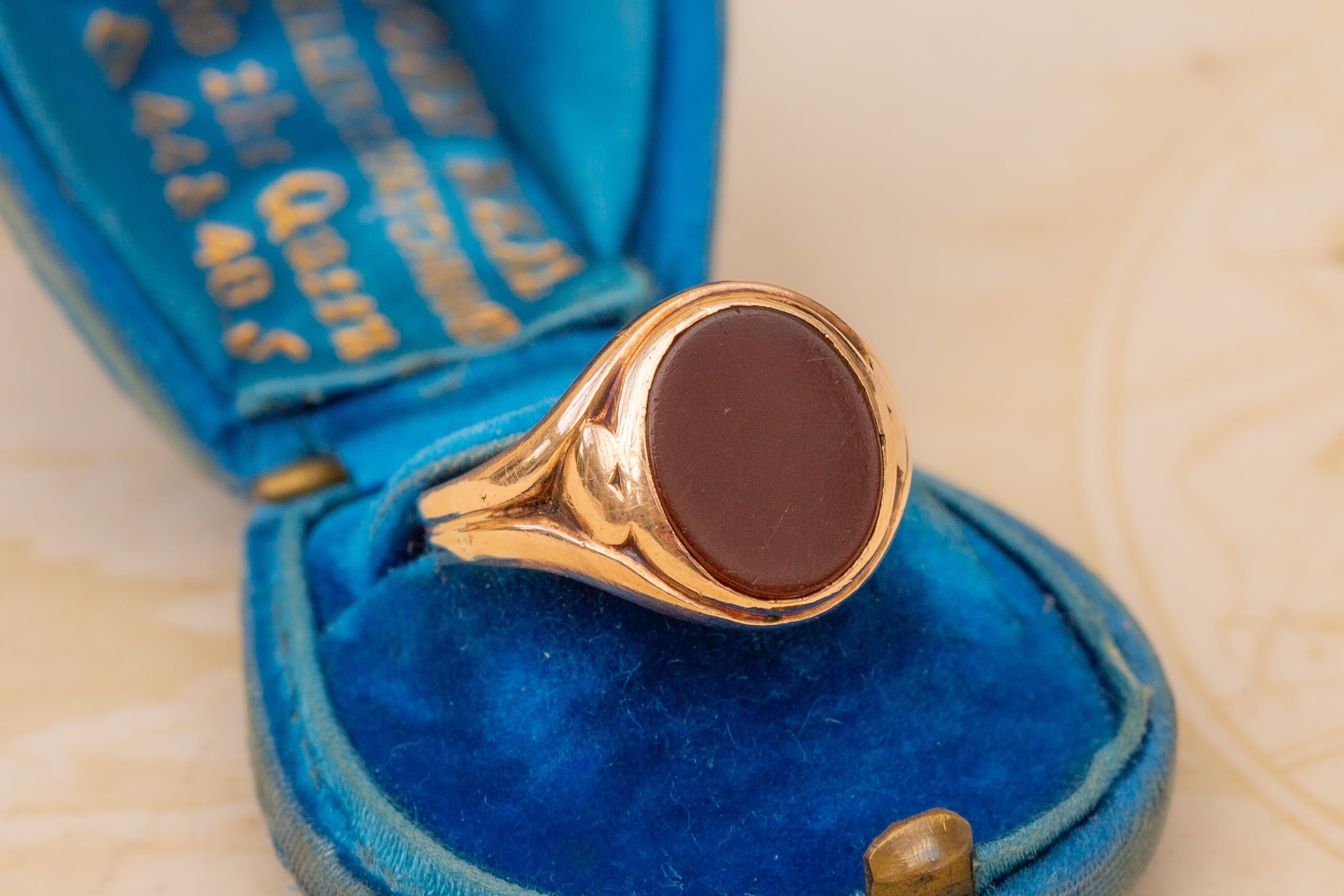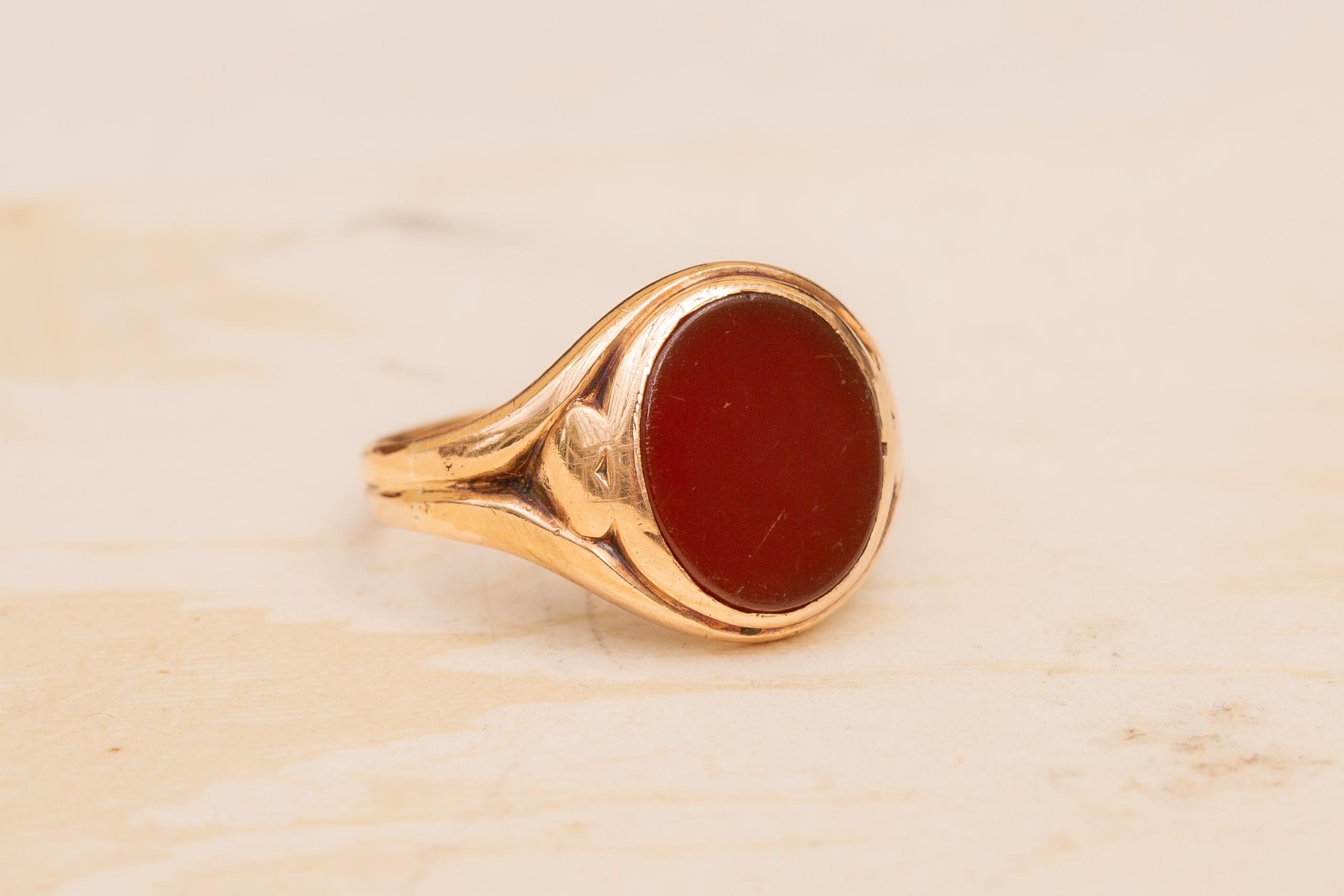 • A classic late 19th-century signet ring, crafted in England around 1880. Set with an uncarved oval carnelian plaque, it’s remarkable that this stone has remained untouched for over 140 years—ready for a new owner's initials or crest, or to be left plain as it has always been.