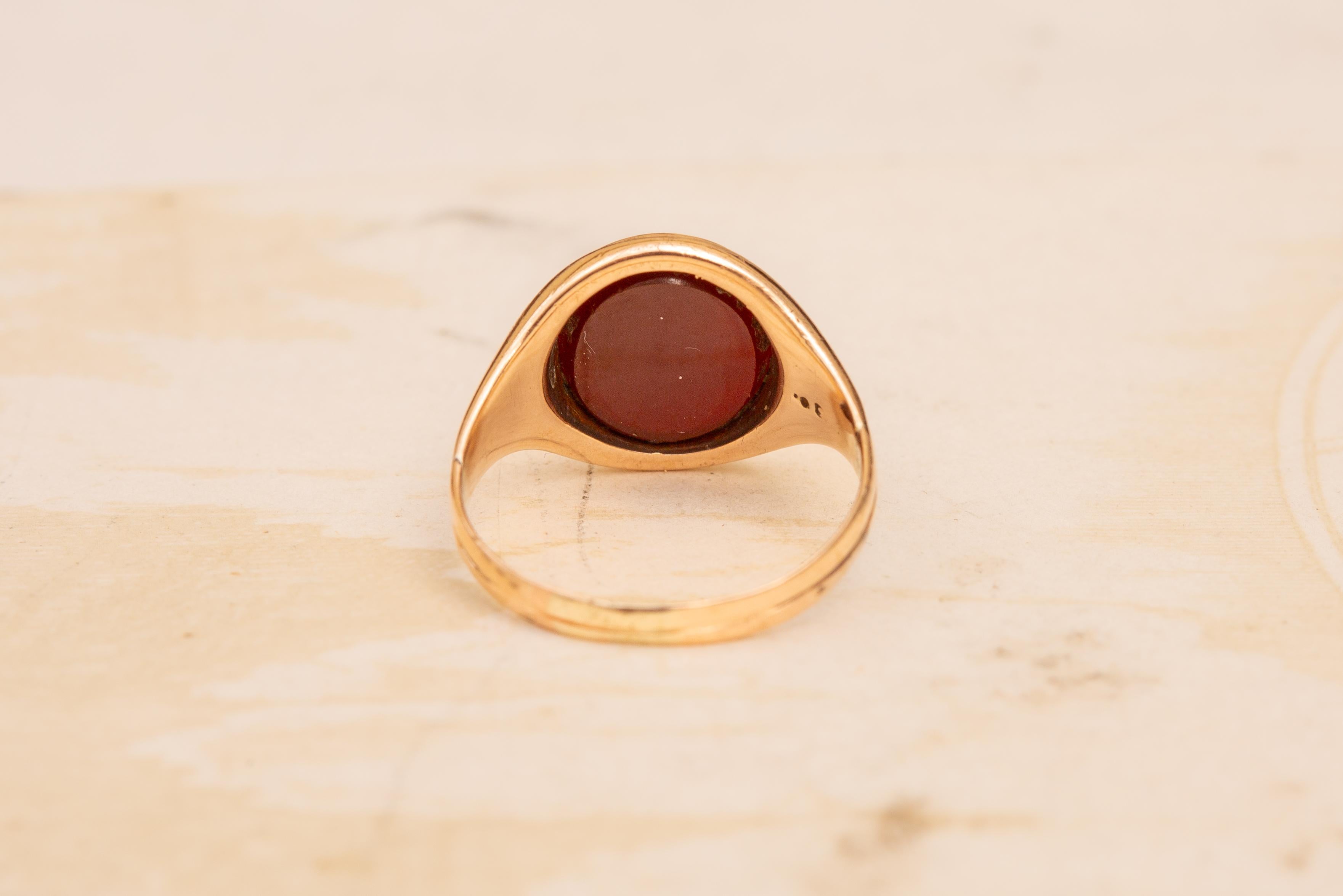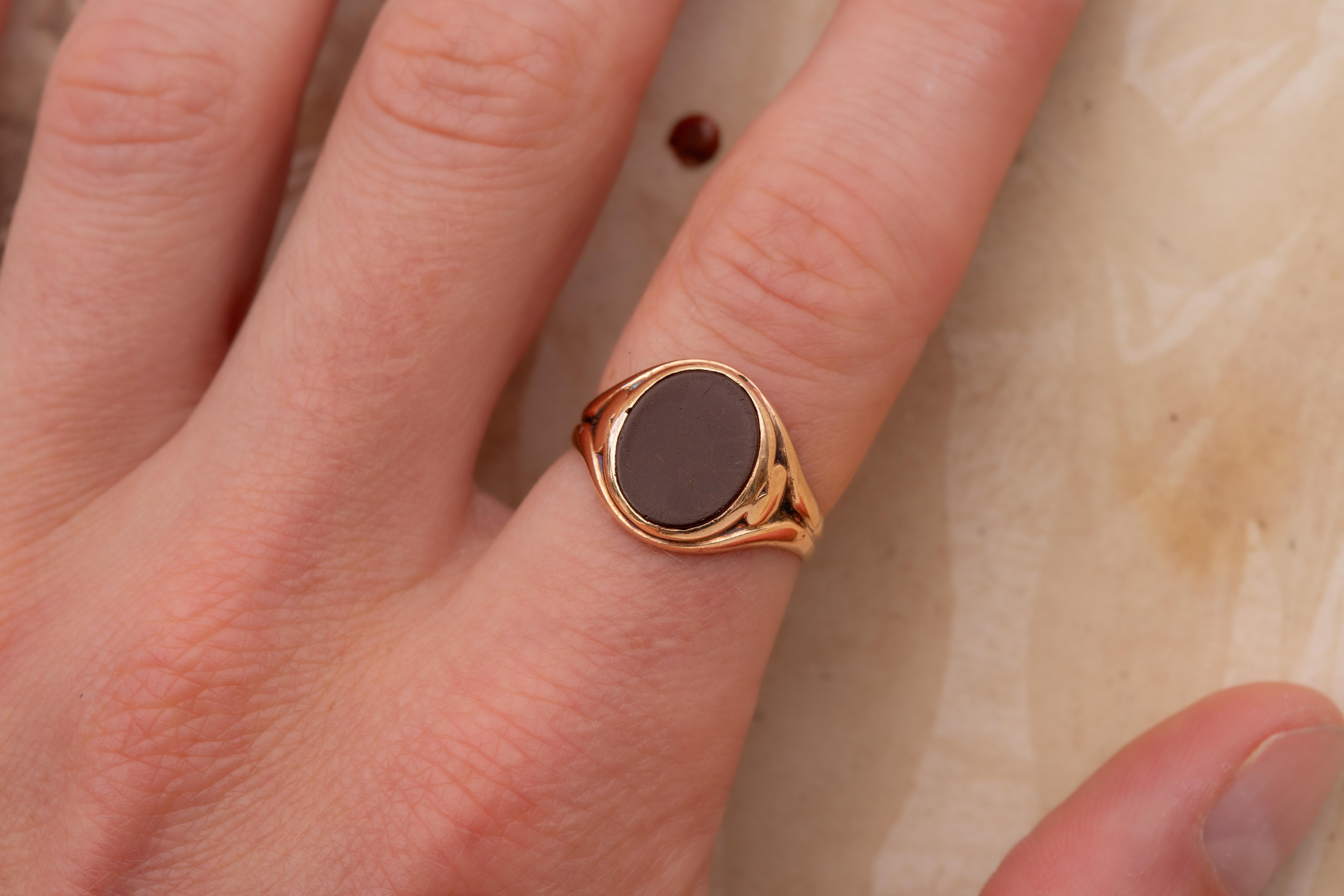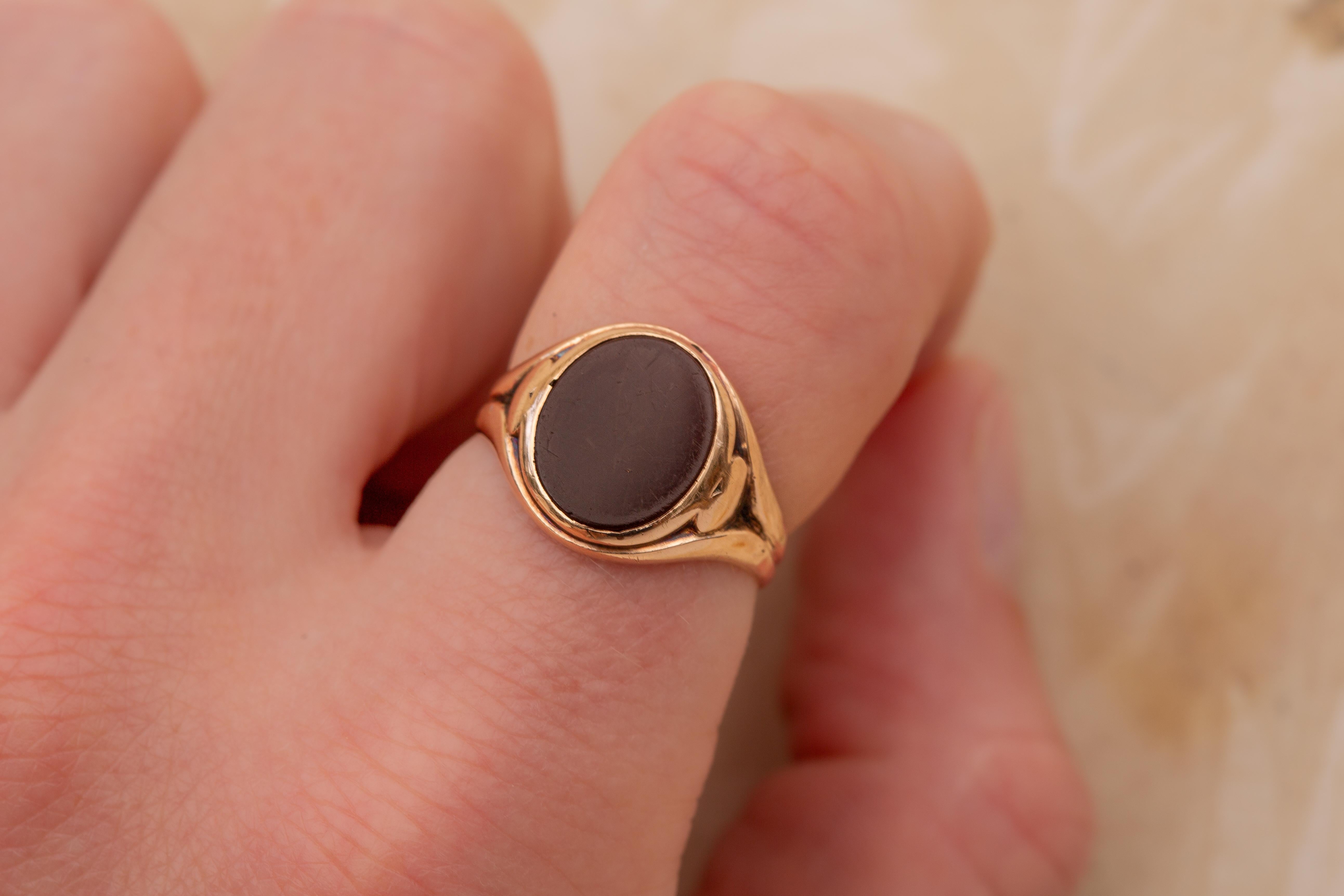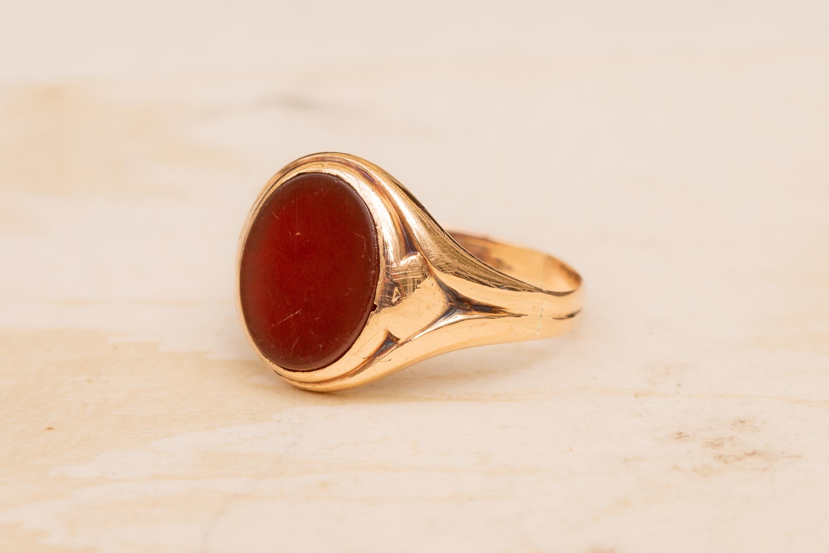 • A classic late 19th-century signet ring, crafted in England around 1880. Set with an uncarved oval carnelian plaque, it’s remarkable that this stone has remained untouched for over 140 years—ready for a new owner's initials or crest, or to be left plain as it has always been.