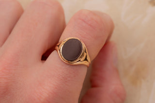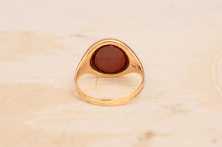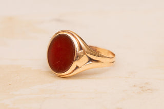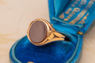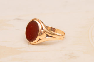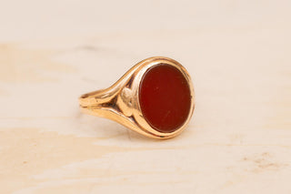 A classic late 19th-century signet ring, crafted in England around 1880. Set with an uncarved oval carnelian plaque, it’s remarkable that this stone has remained untouched for over 140 years—ready for a new owner's initials or crest, or to be left plain as it has always been.